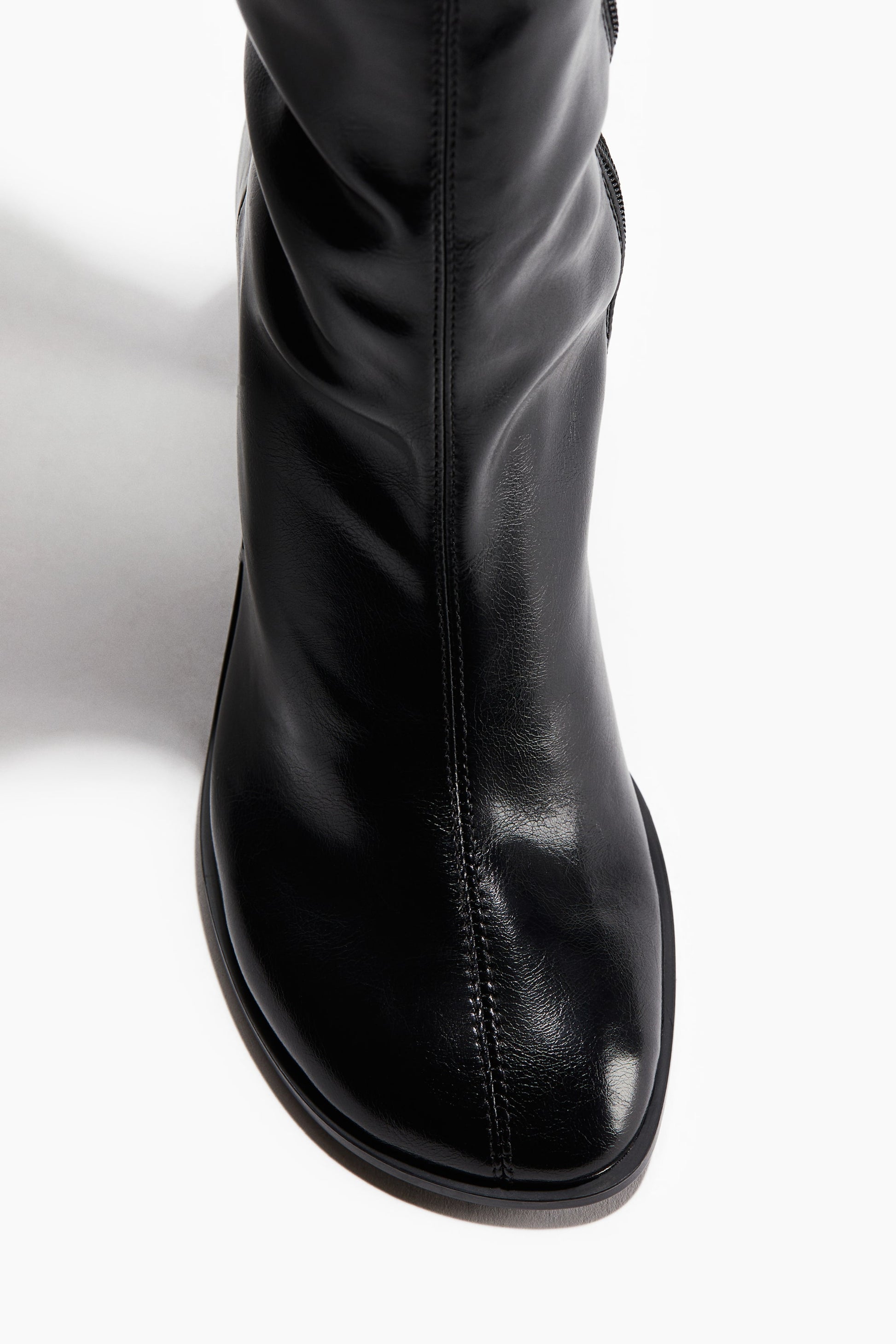 Over-the-knee sock boots in stretchy coated fabric with a zip at one side, angular toes and high block heels.
