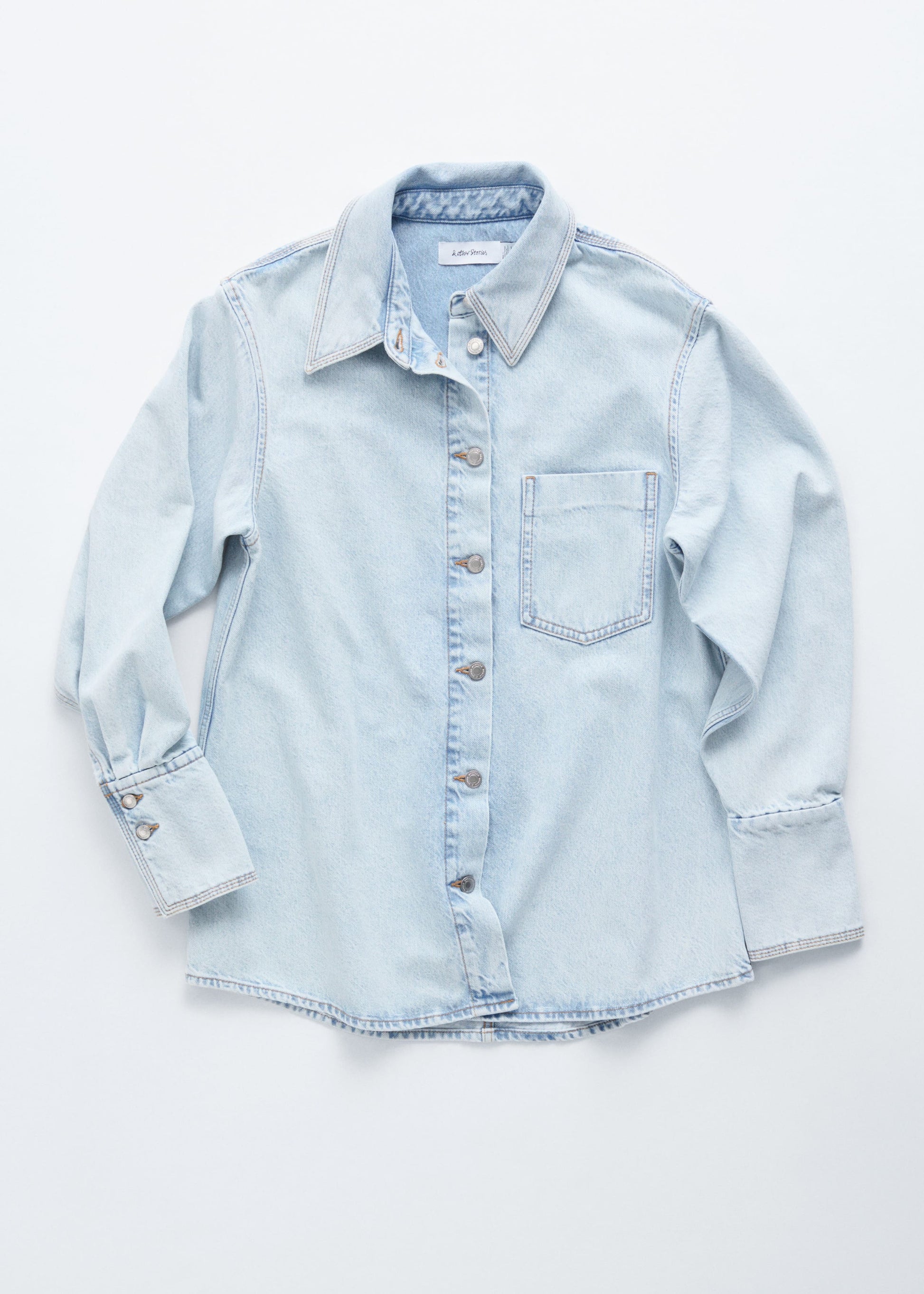 Denim shirt cut in a loose silhouette, featuring a classic collar, a single front patch pocket, and topstitched seams. Completed with metal button closures, and buttoned cuffs.