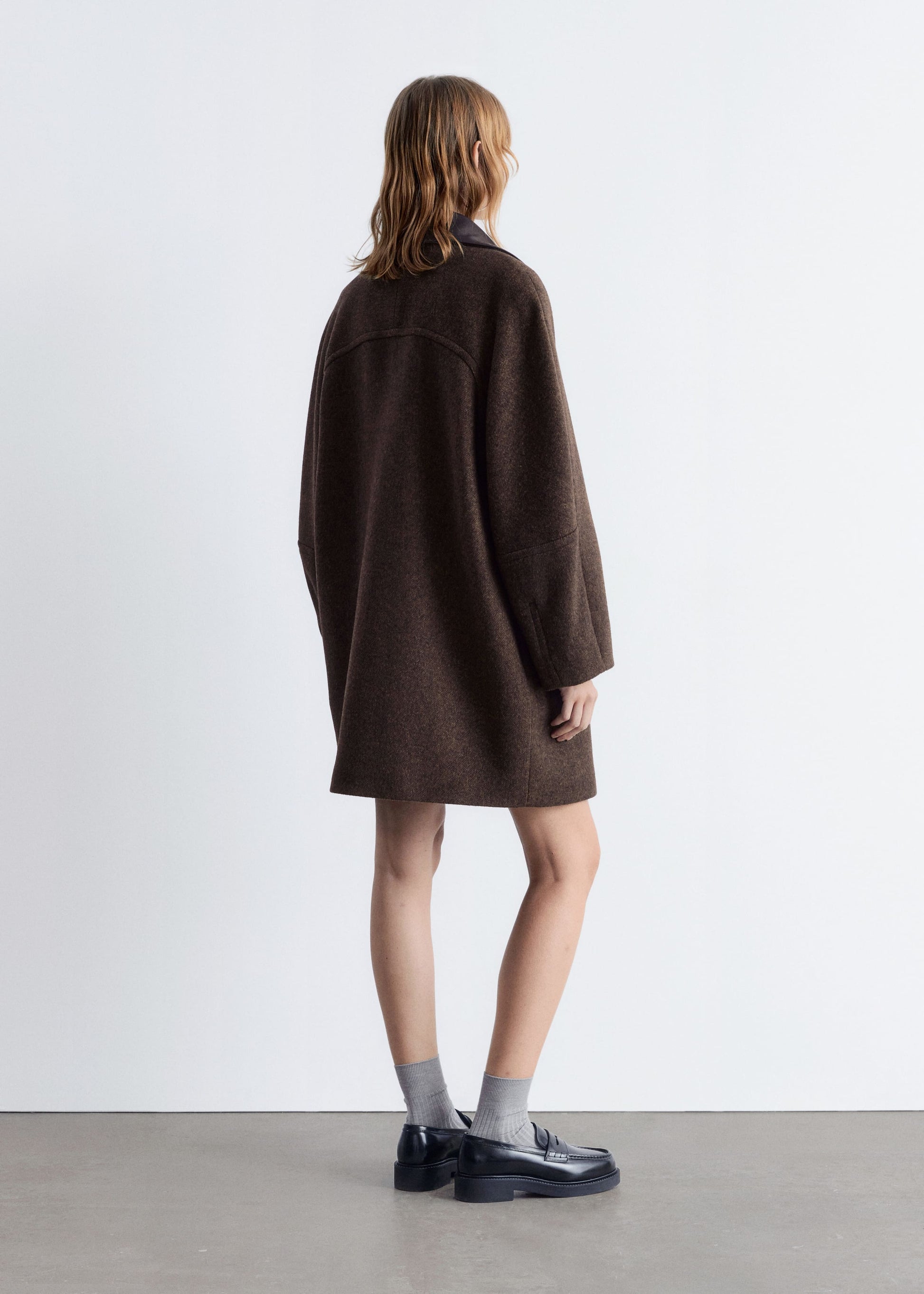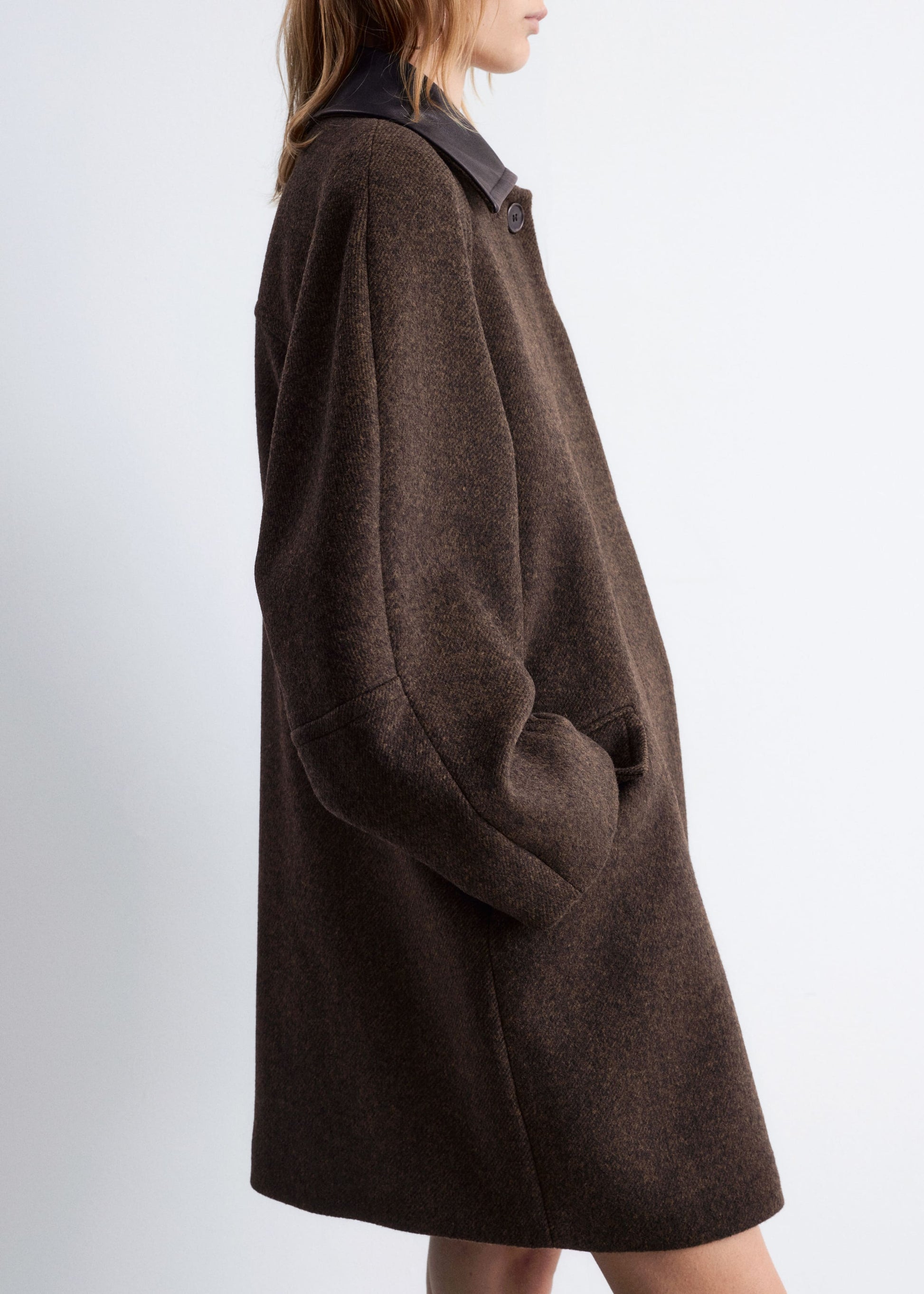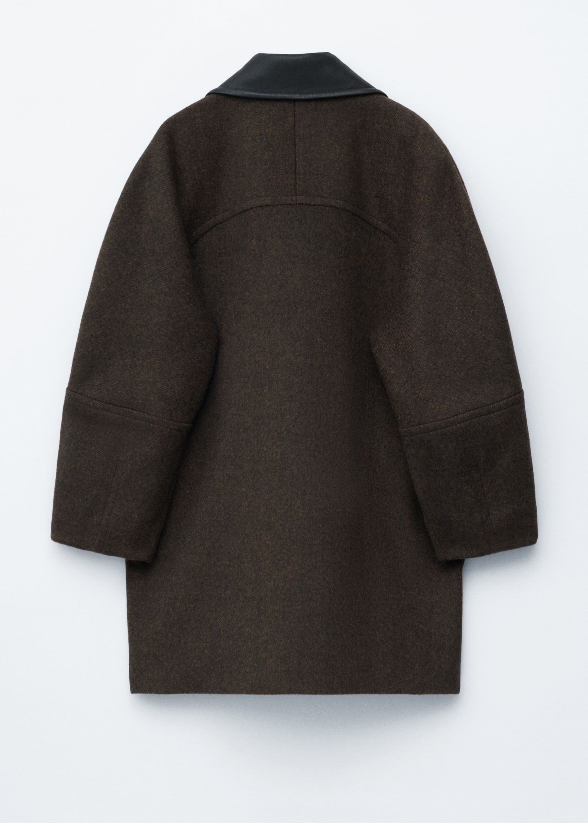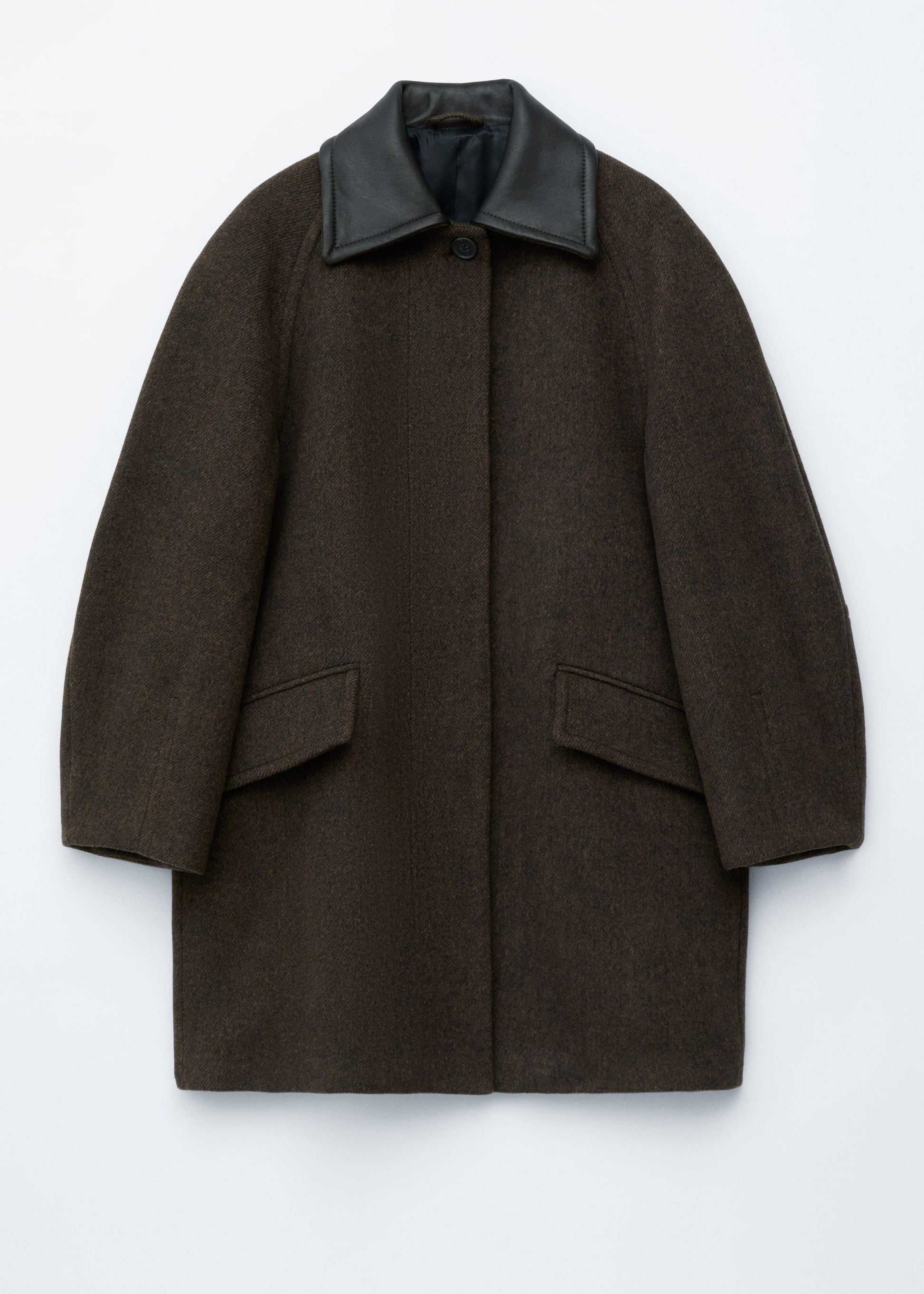This coat is crafted from a wool blend and showcases a contrasting leather collar. Designed in an oversized, boxy silhouette that falls to mid length, it features cocoon-shaped raglan sleeves structured with shoulder pads, a concealed placket with a single visible top button, and slanted flap pockets.