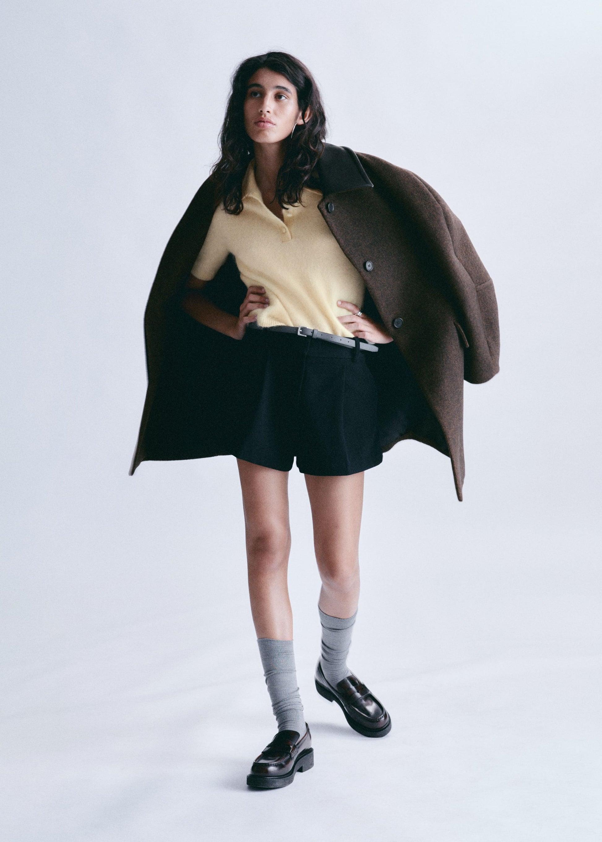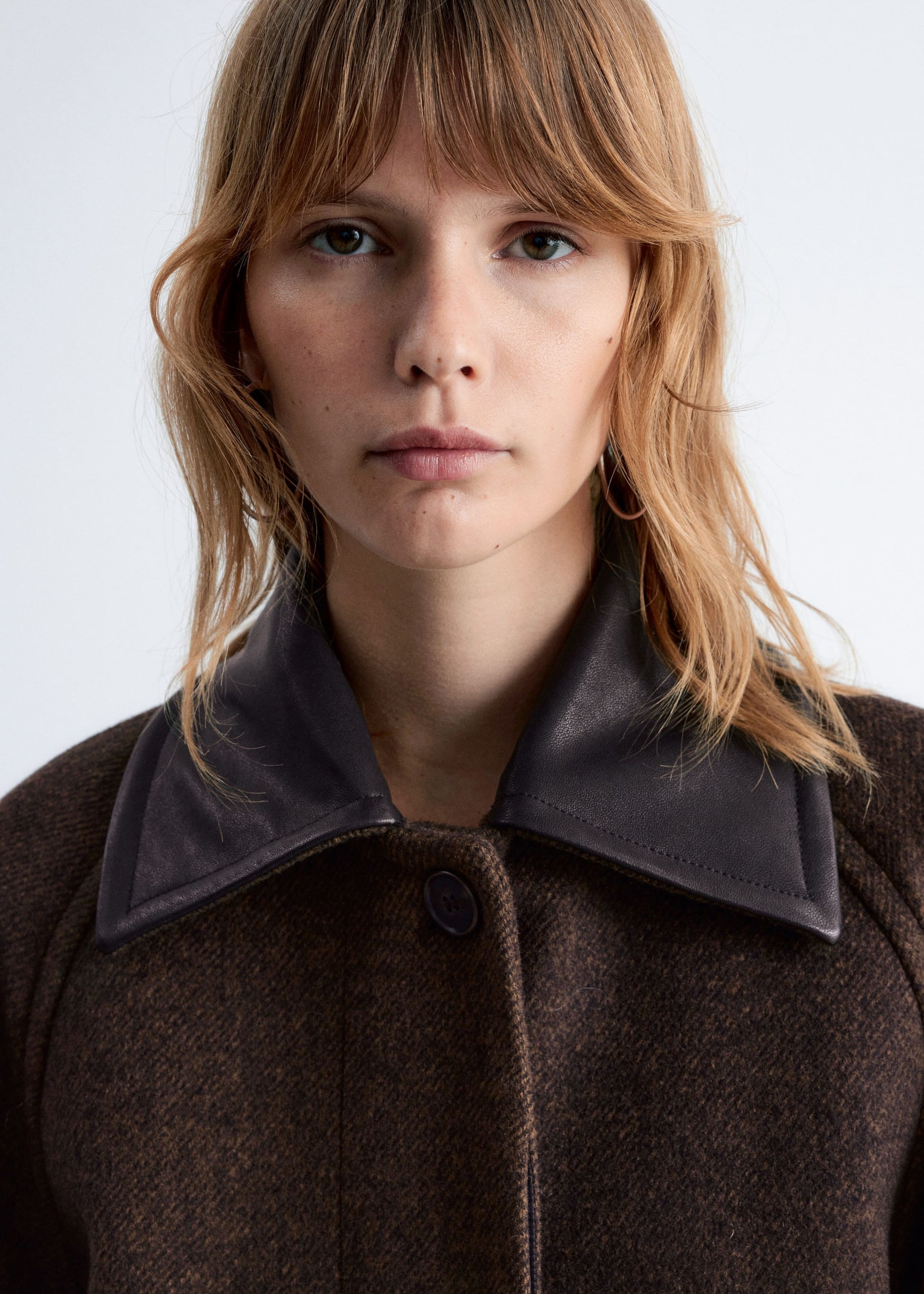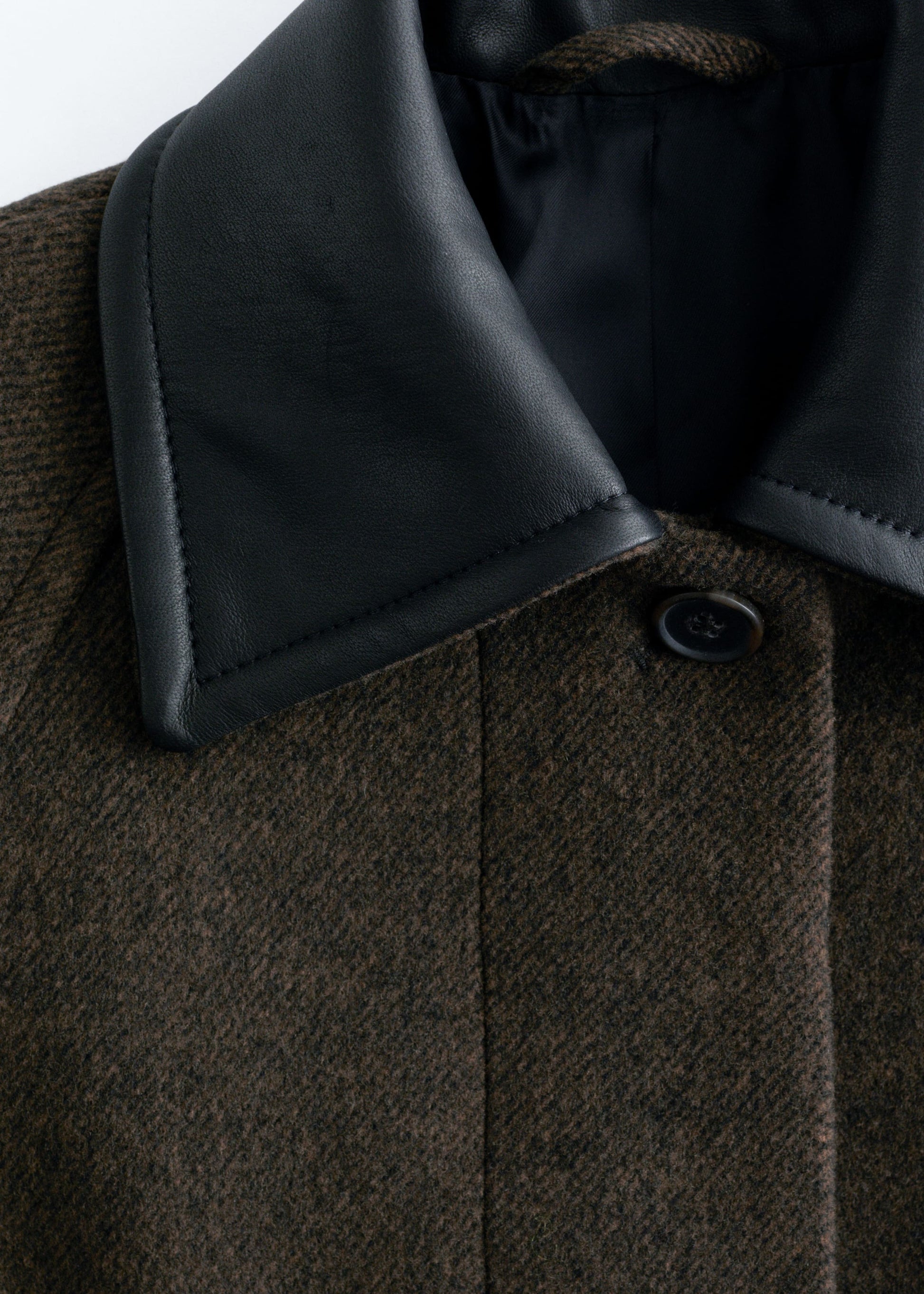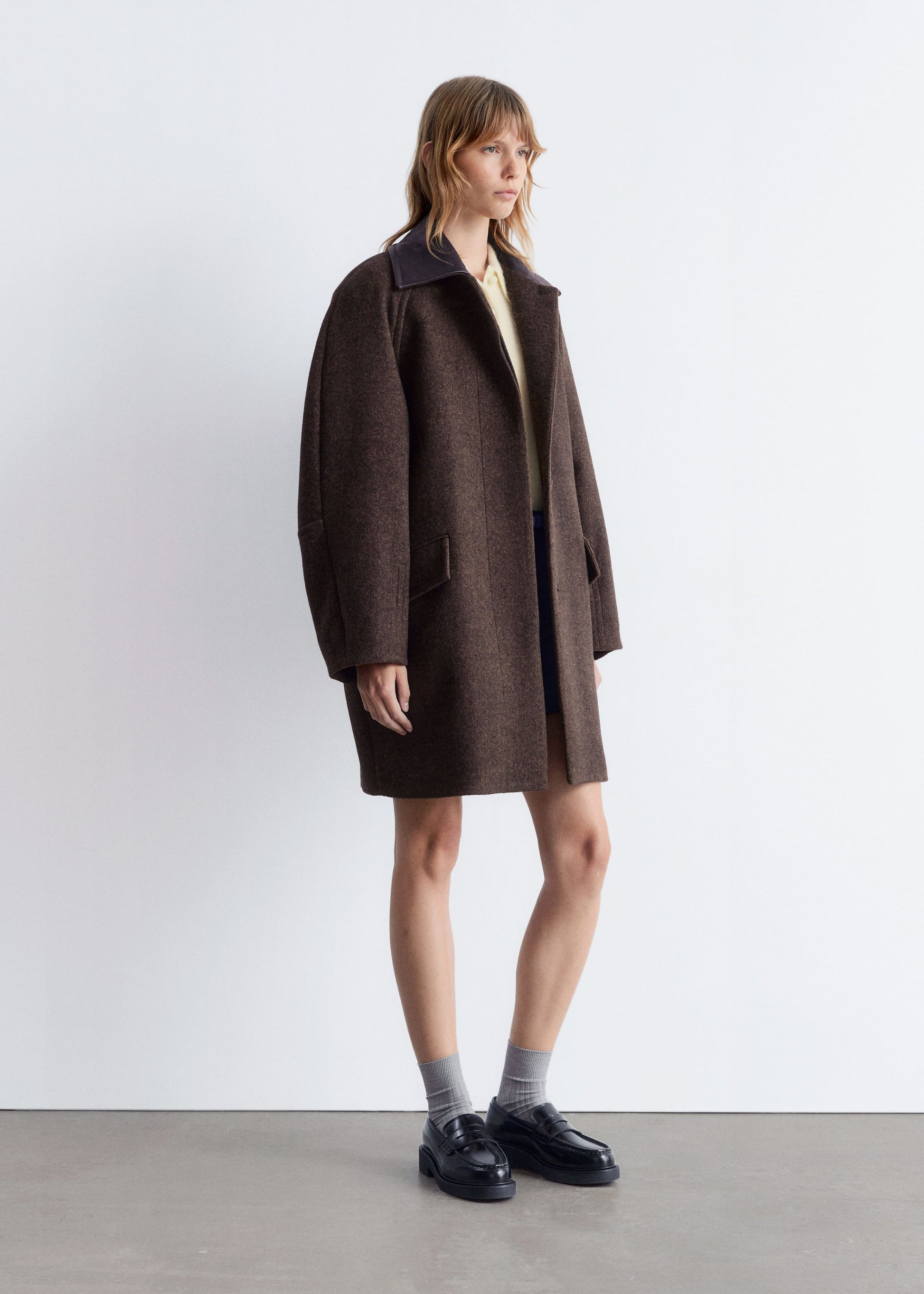 This coat is crafted from a wool blend and showcases a contrasting leather collar. Designed in an oversized, boxy silhouette that falls to mid length, it features cocoon-shaped raglan sleeves structured with shoulder pads, a concealed placket with a single visible top button, and slanted flap pockets.