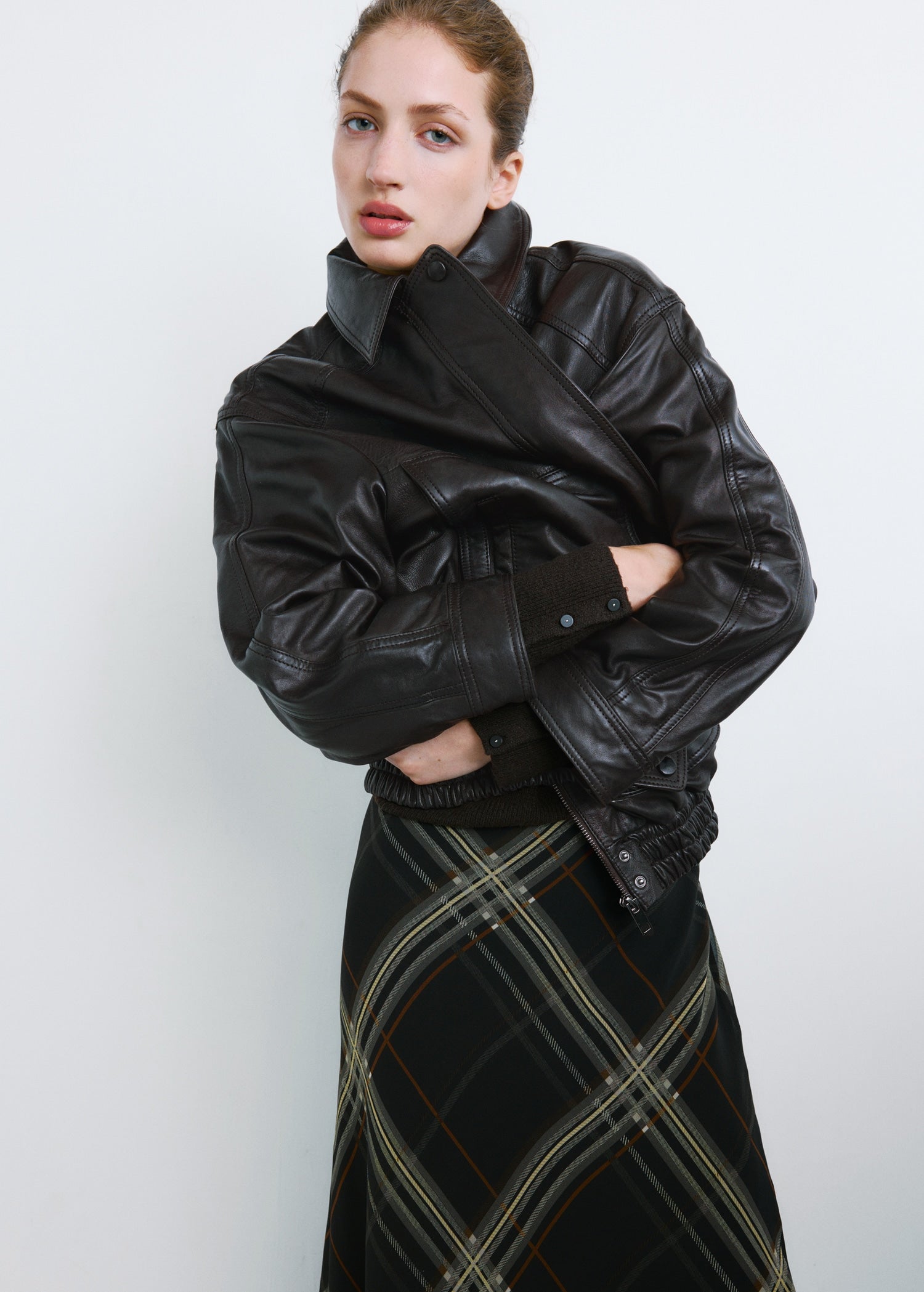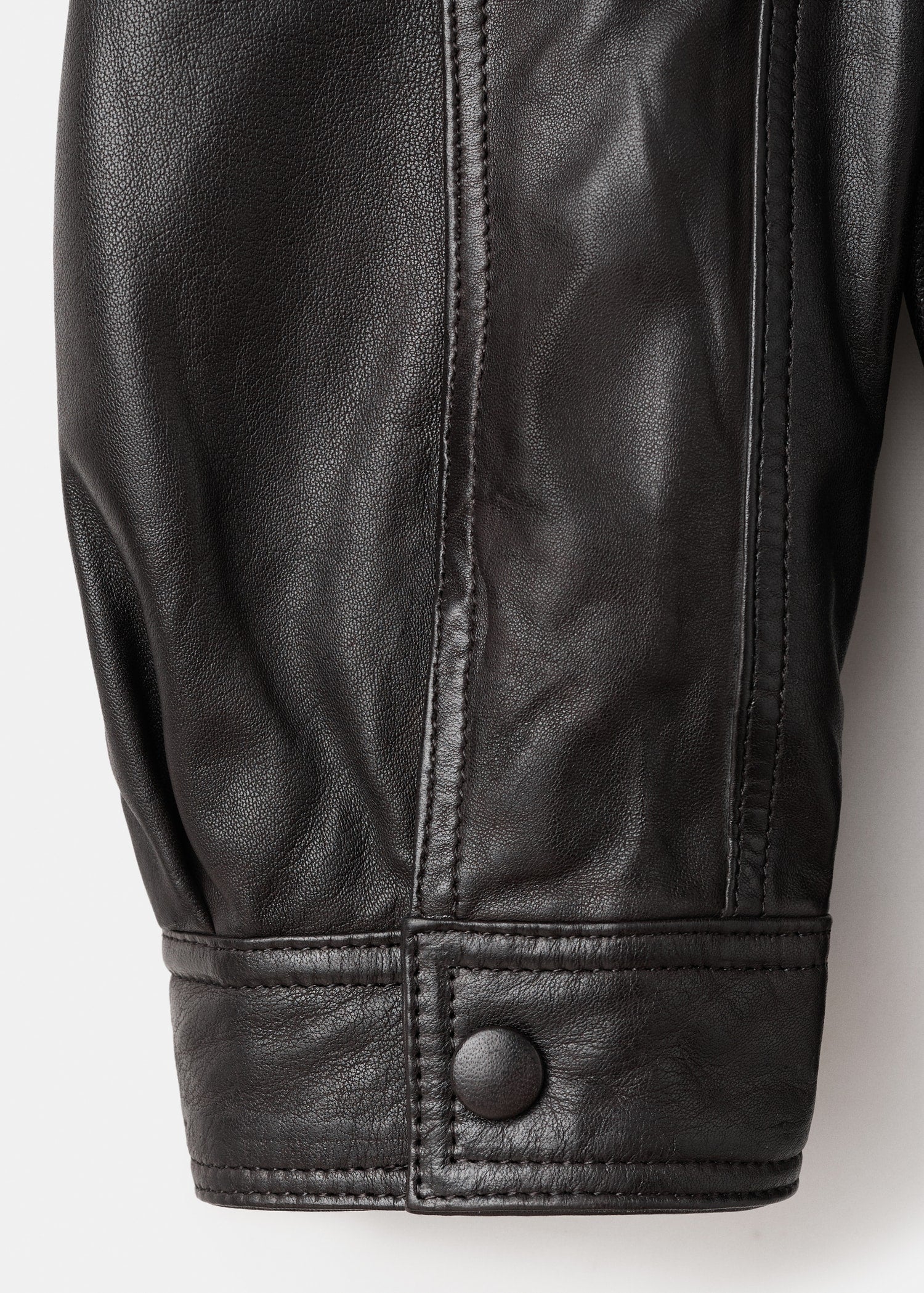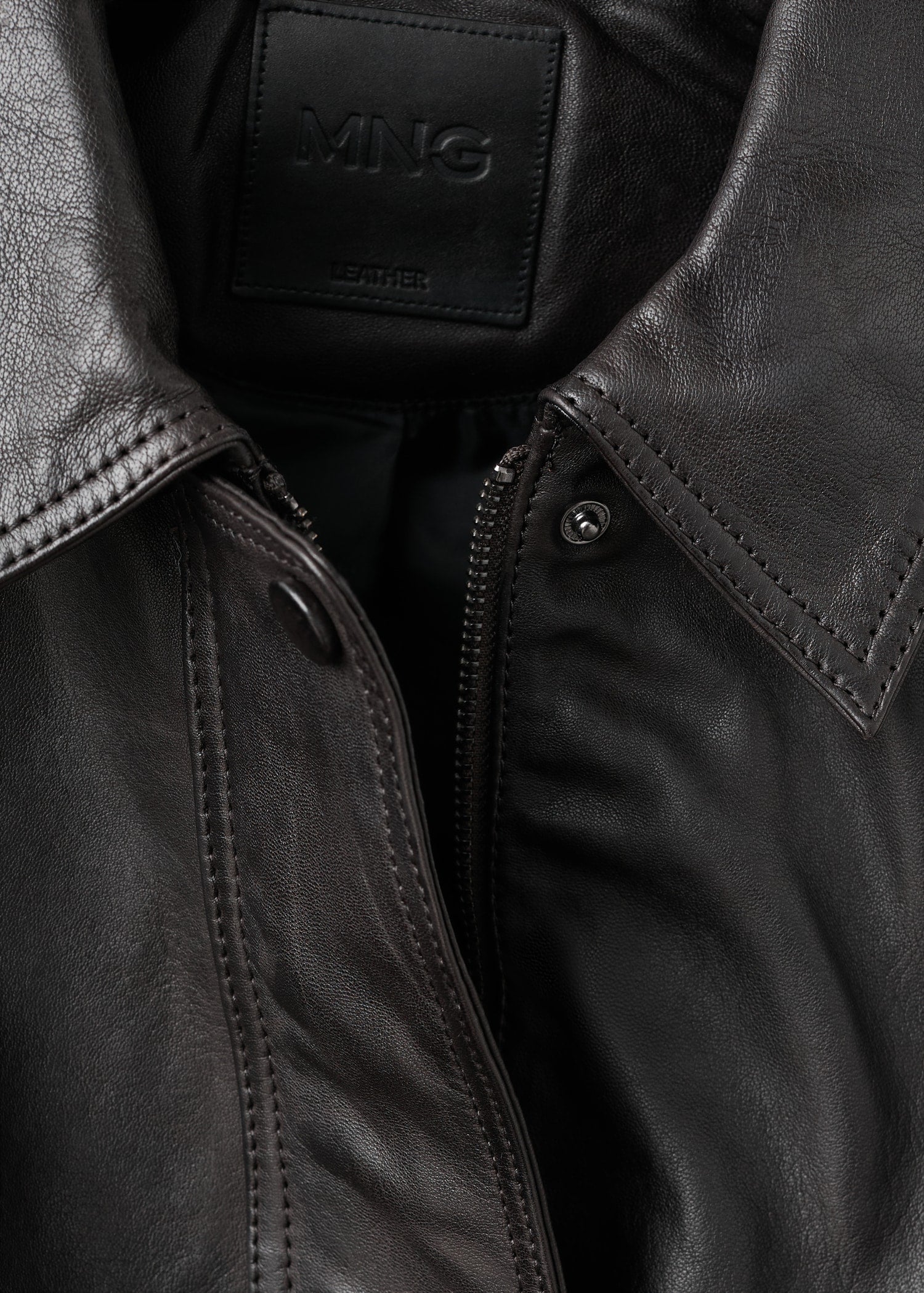100% ovine leather. Oversize design. Shirt collar. Long sleeves with buttoned cuffs. Two side welt pockets. Elastic gathered hem. Concealed front zip and press-stud fastening with placket. Inner lining.