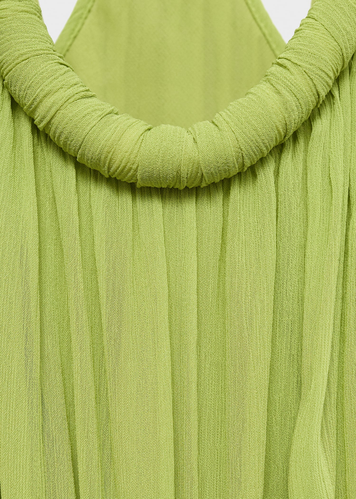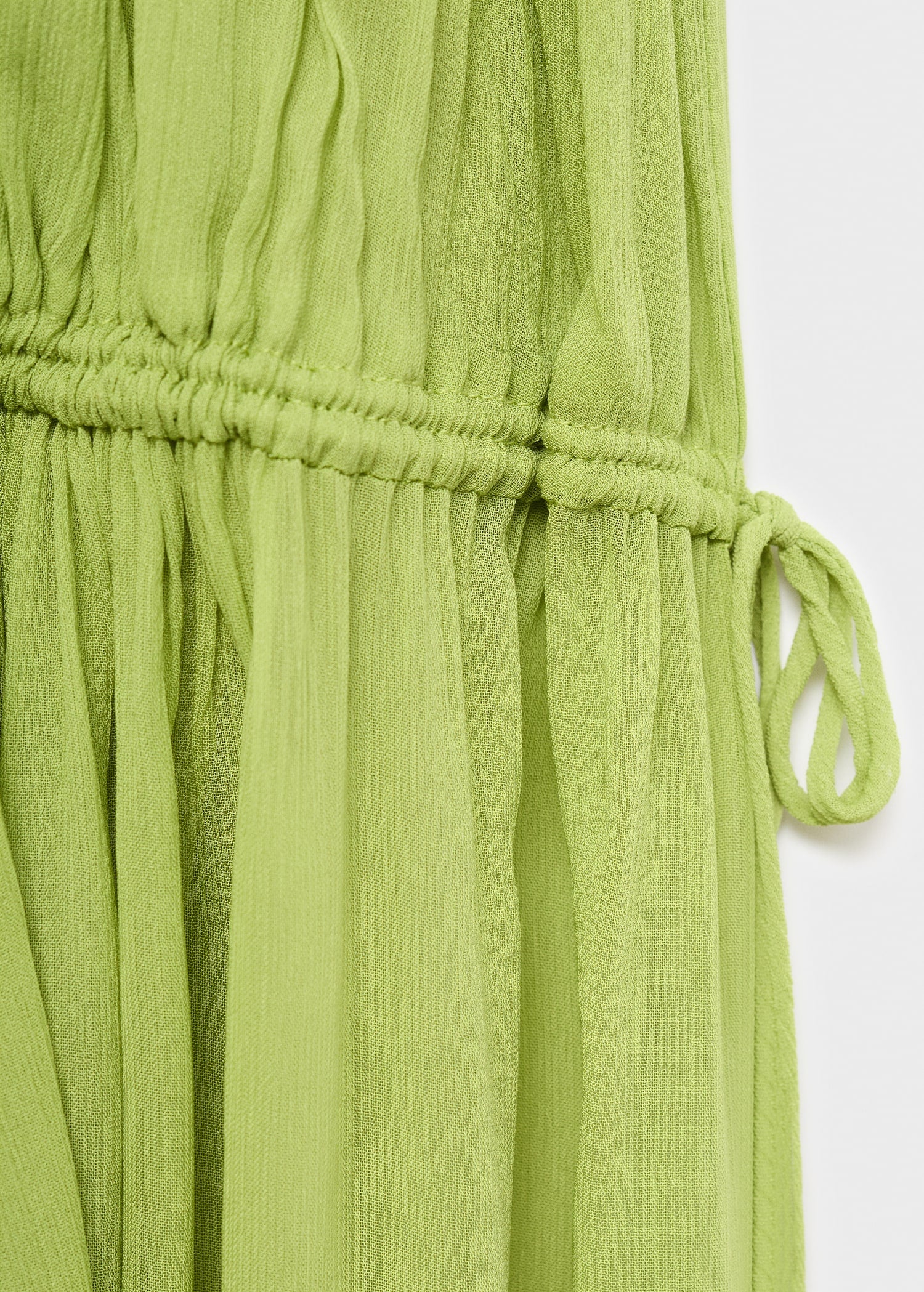 Pleated fabric. Maxi long design. Straight design. Low neckline. Sleeveless. Thin straps. Elastic pleated on the waist. Tie closure at the back.