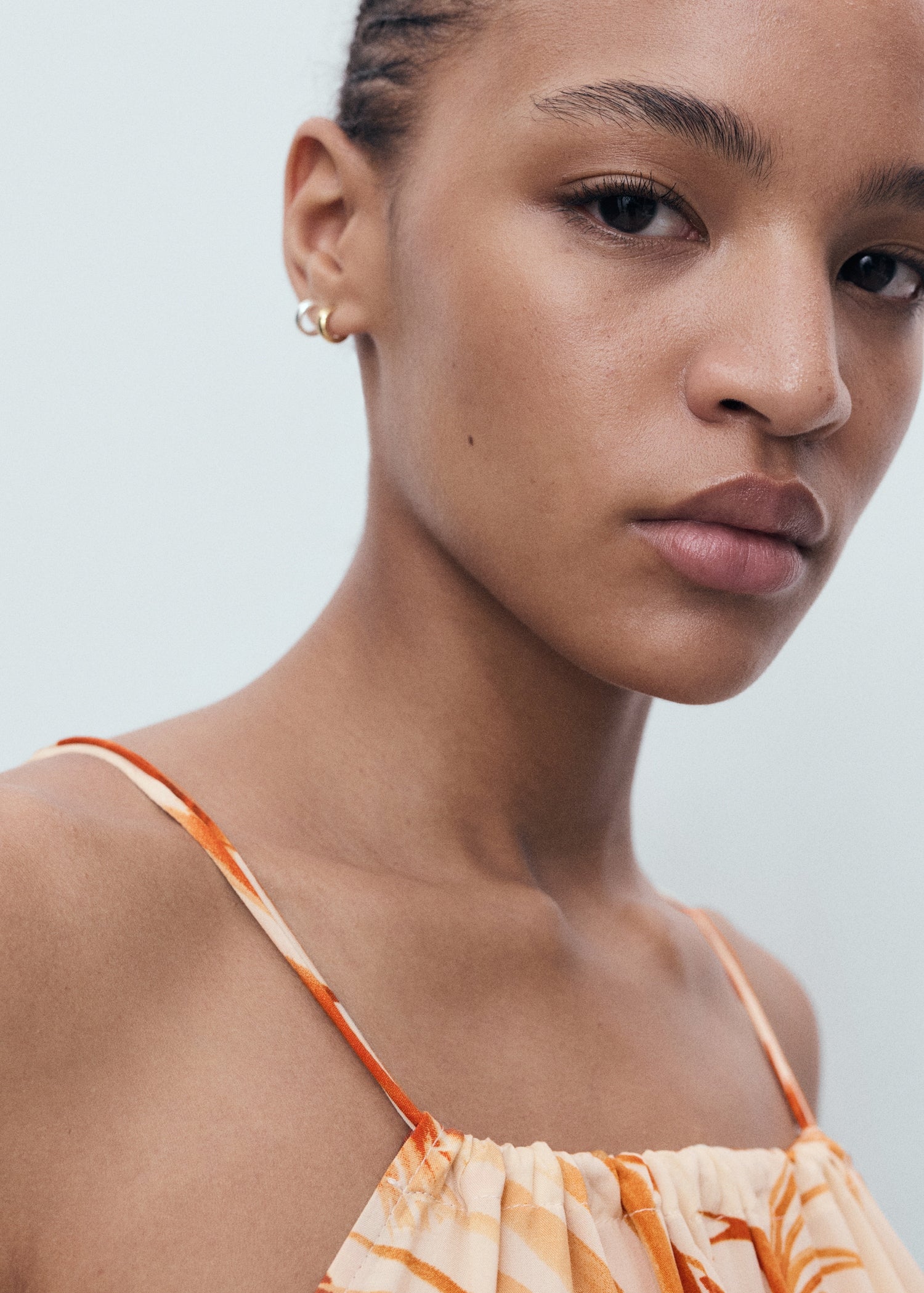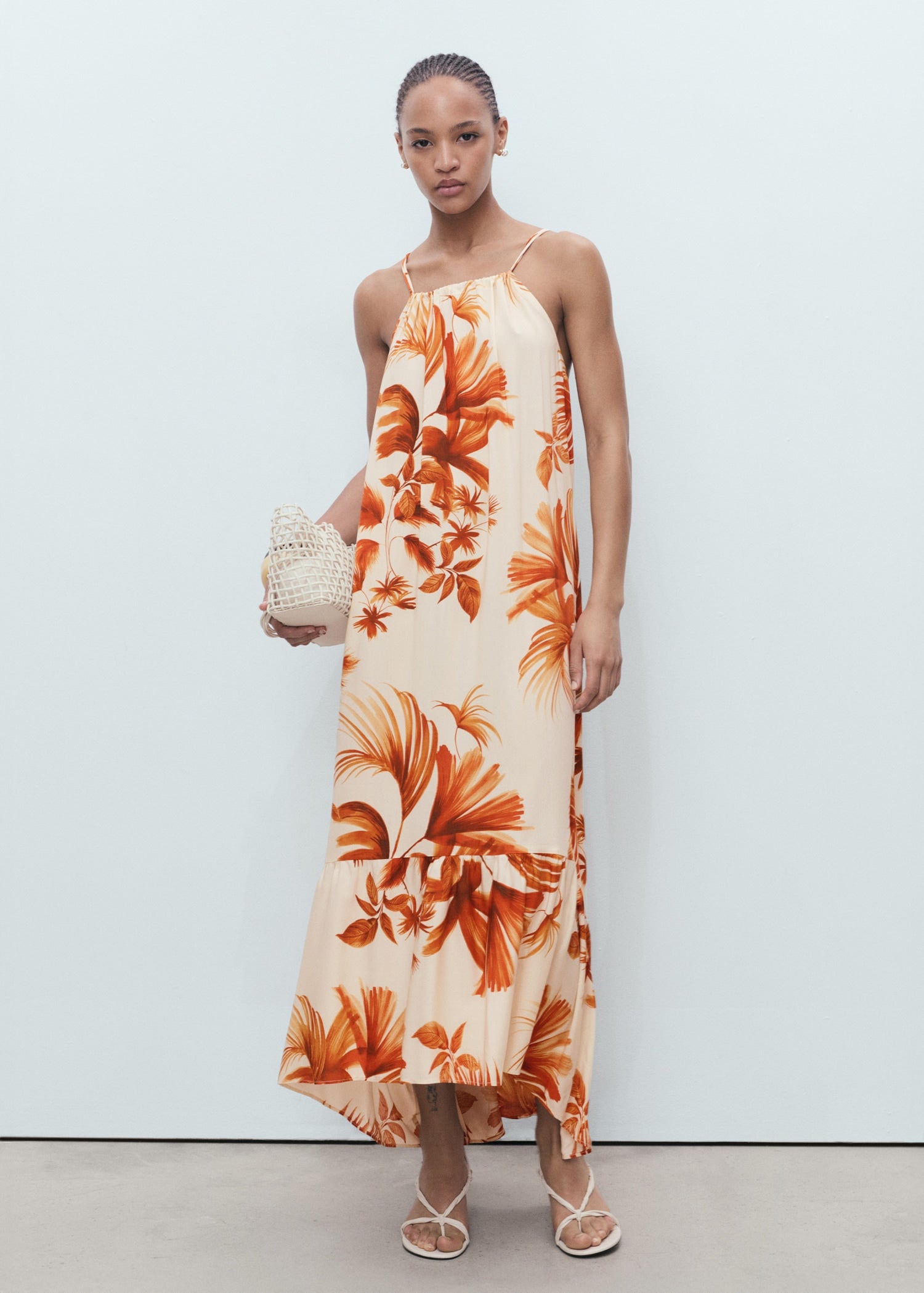 Fluid fabric. Long design. Straight design. Palm tree print. Halter neck. Runched detail in the neckline. Sleeveless. Thin adjustable straps. Bow fastening on the back.