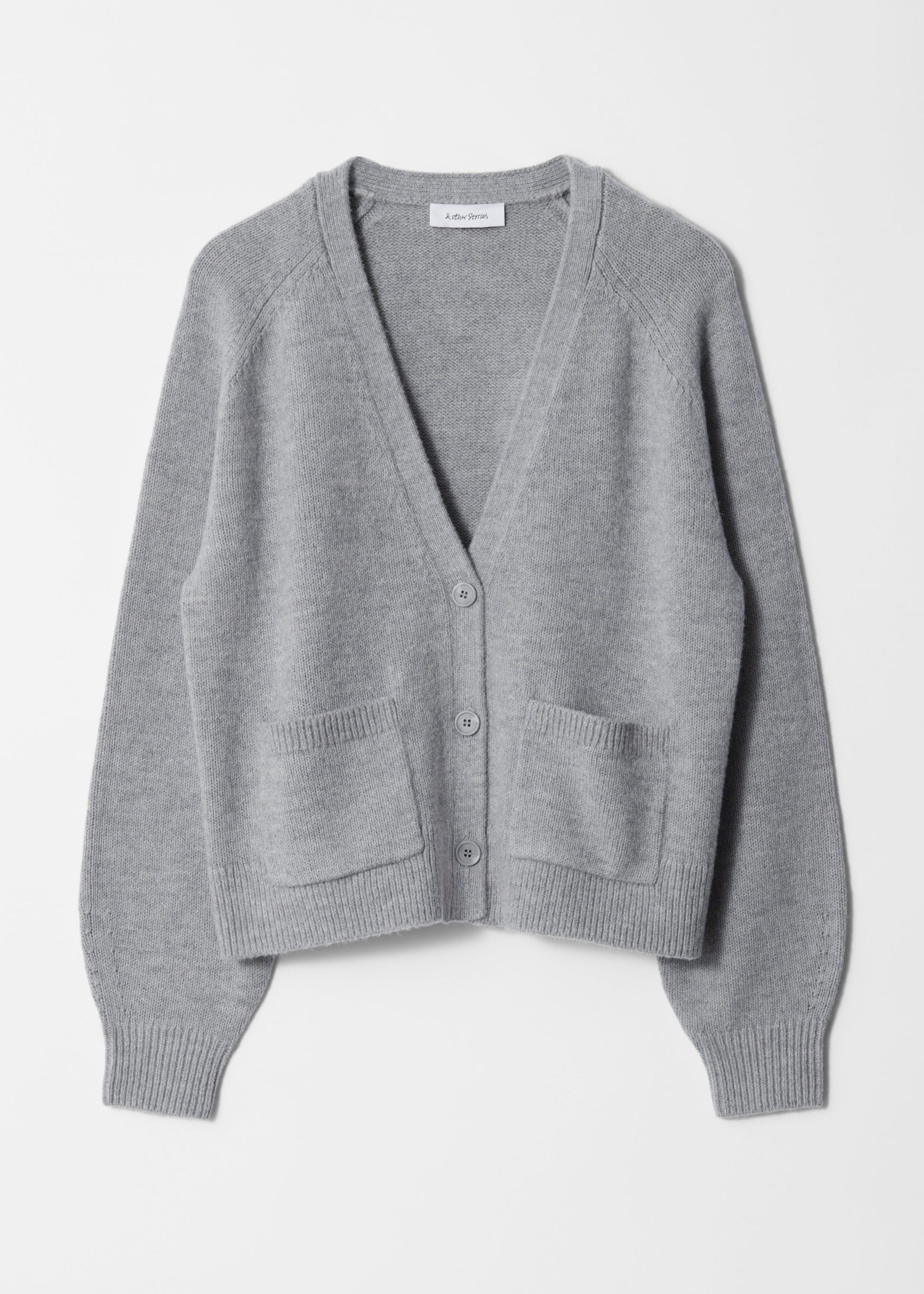 This cardigan is knitted from a soft wool and cotton blend. Cut in a short, loose silhouette, it features a v-neck, dual patch pockets, and ribbed trims. Finished with three button closures. Layer it over a tank top or slip dress for an easy, transitional look.
