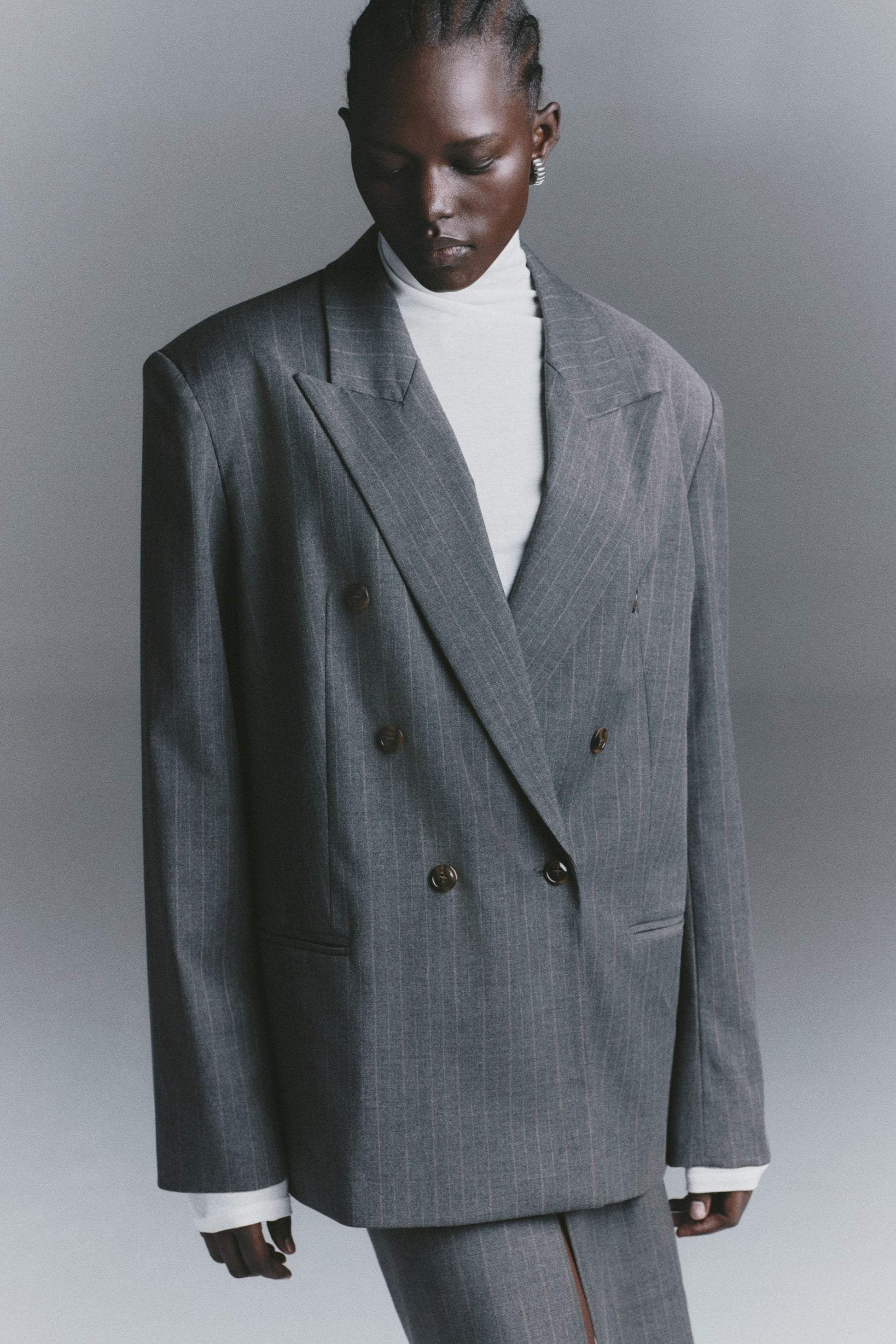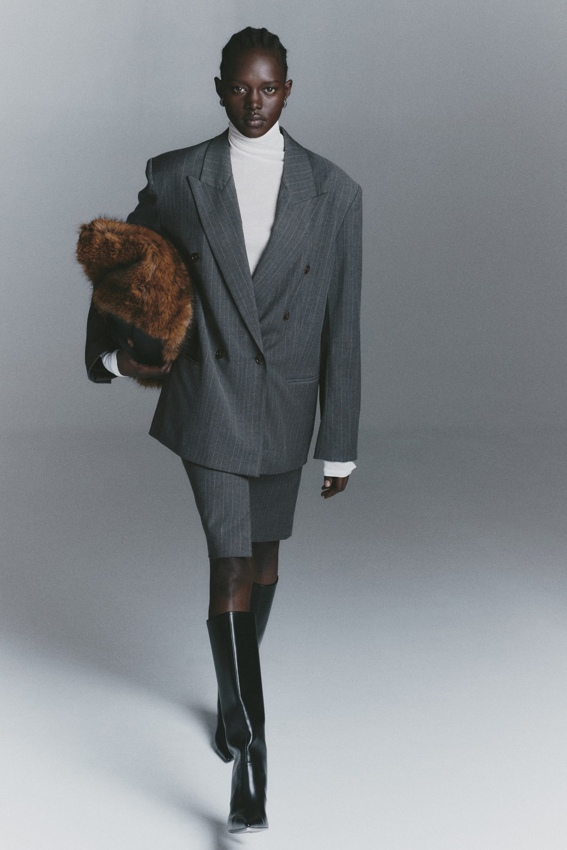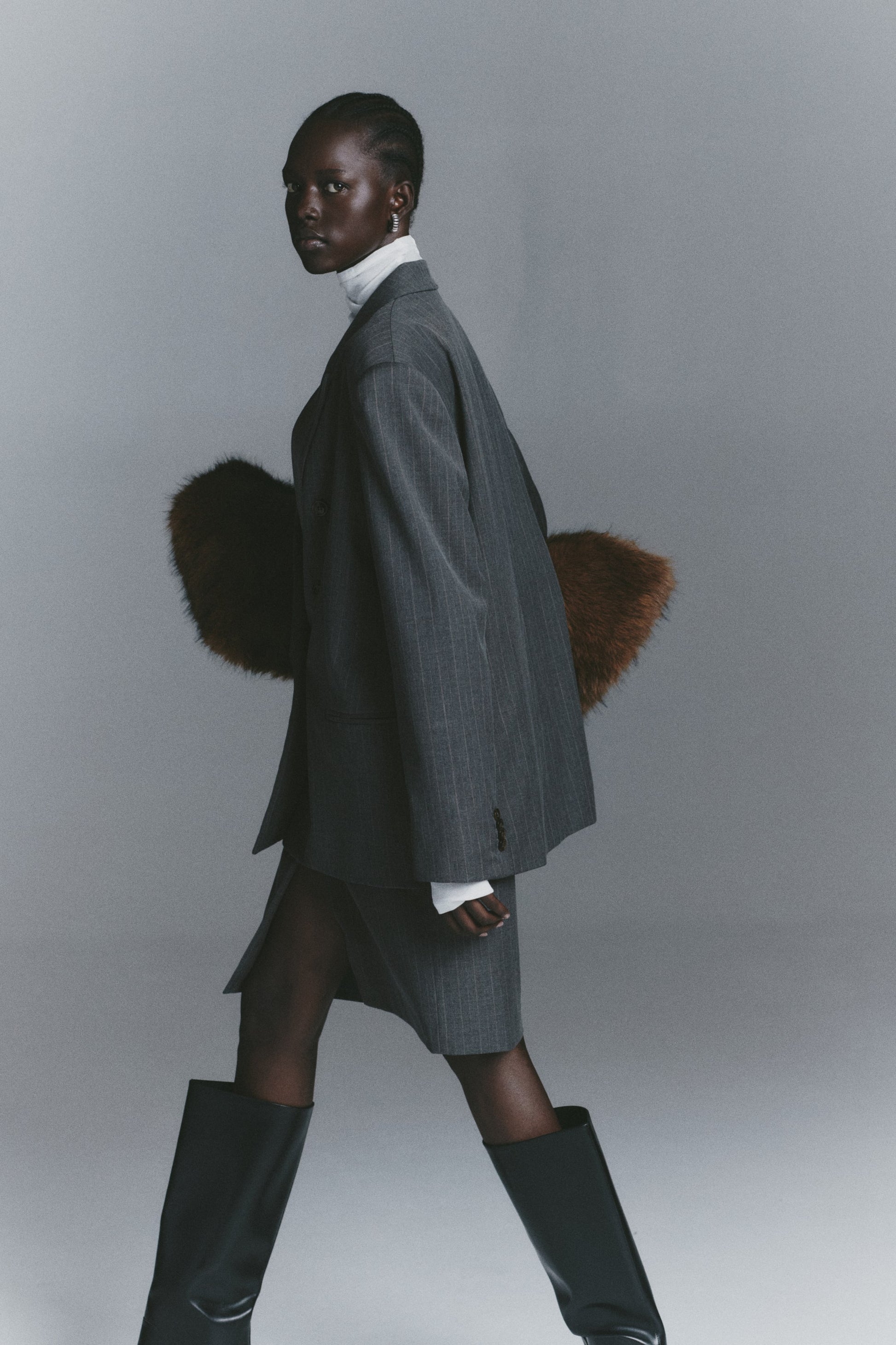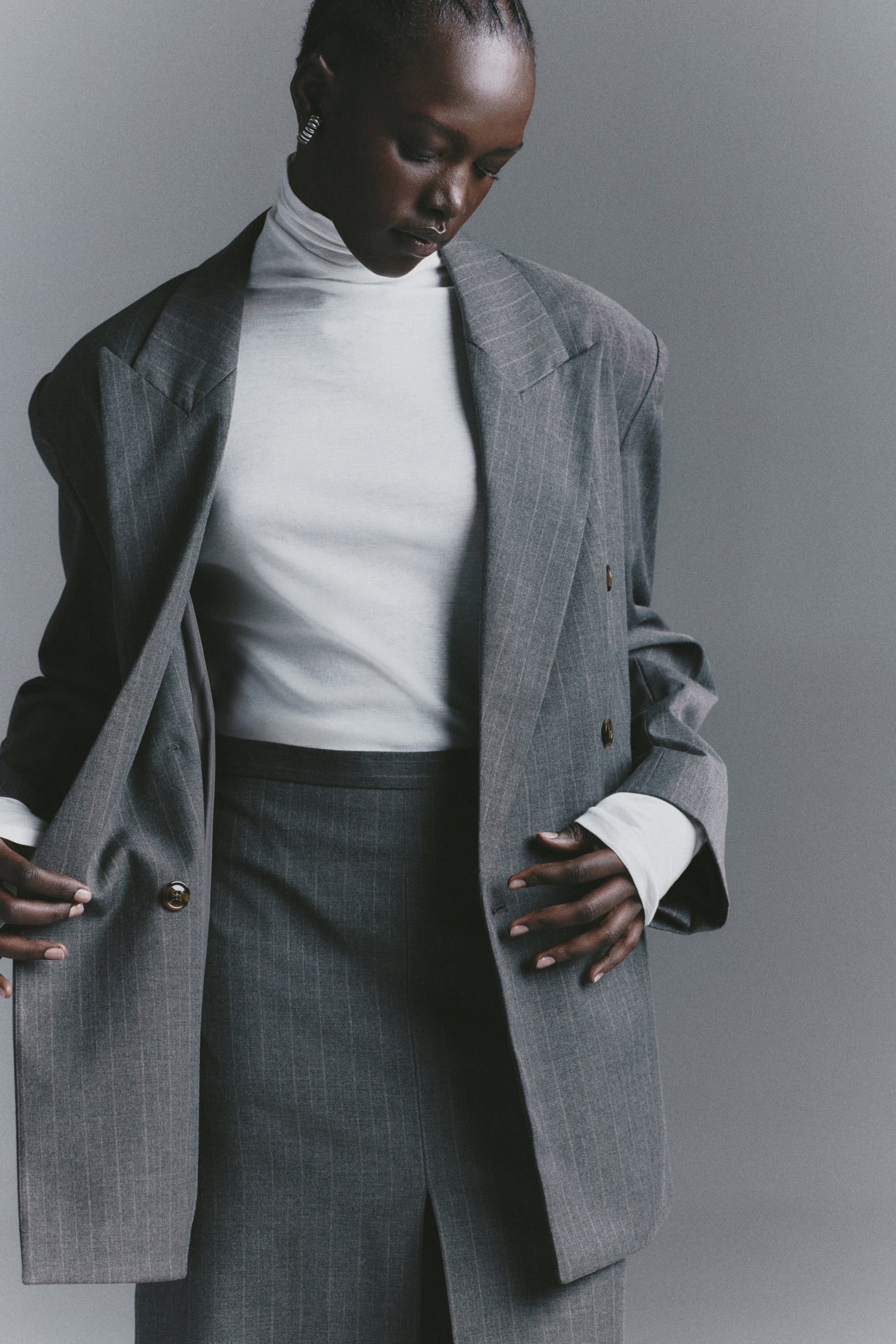 Knee-length skirt in woven fabric with a concealed zip at one side and jetted back pockets with a button. Straight-cut hem with a high slit at the front. Lined.