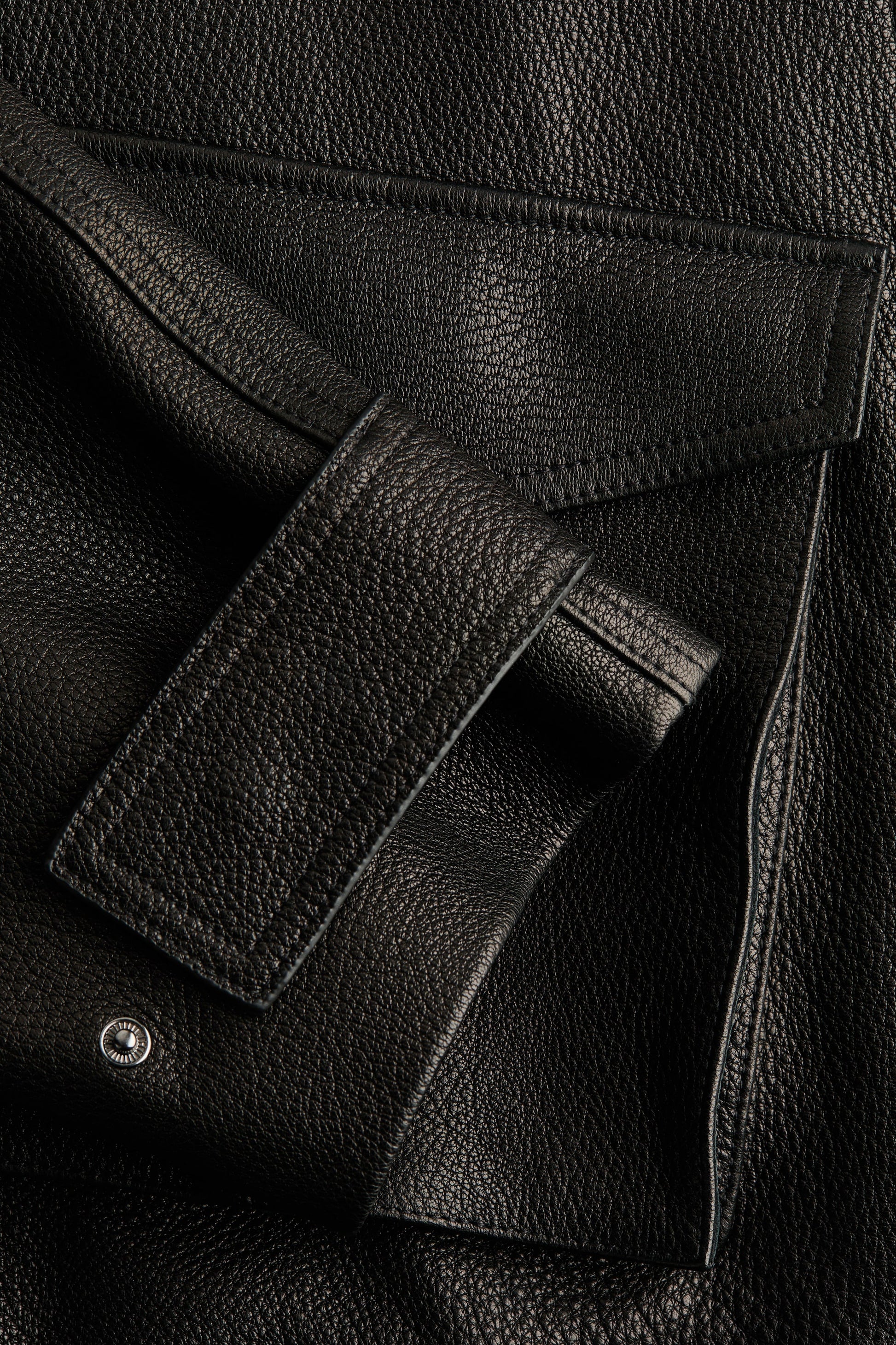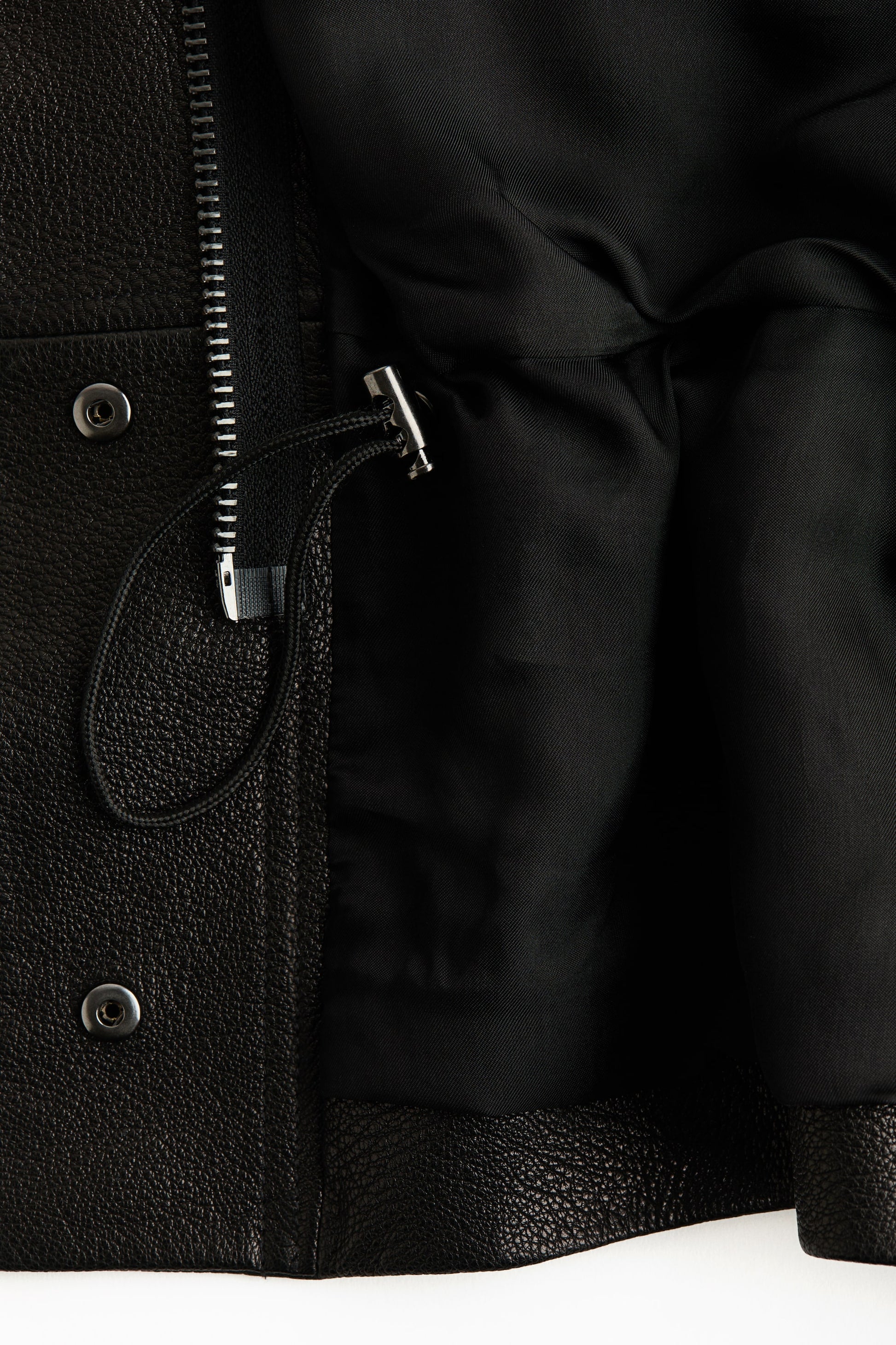 Jacket crafted from soft leather featuring a stand collar with a curved seam at the back, zip and wind flap with concealed press-studs down the front. Bellows chest pockets with a flap, press-stud and handwarmer pockets underneath, and a welt inner pocket. Adjustable press-stud tabs at the cuffs, internal drawstring at the waist and a flared peplum. Viscose lining.