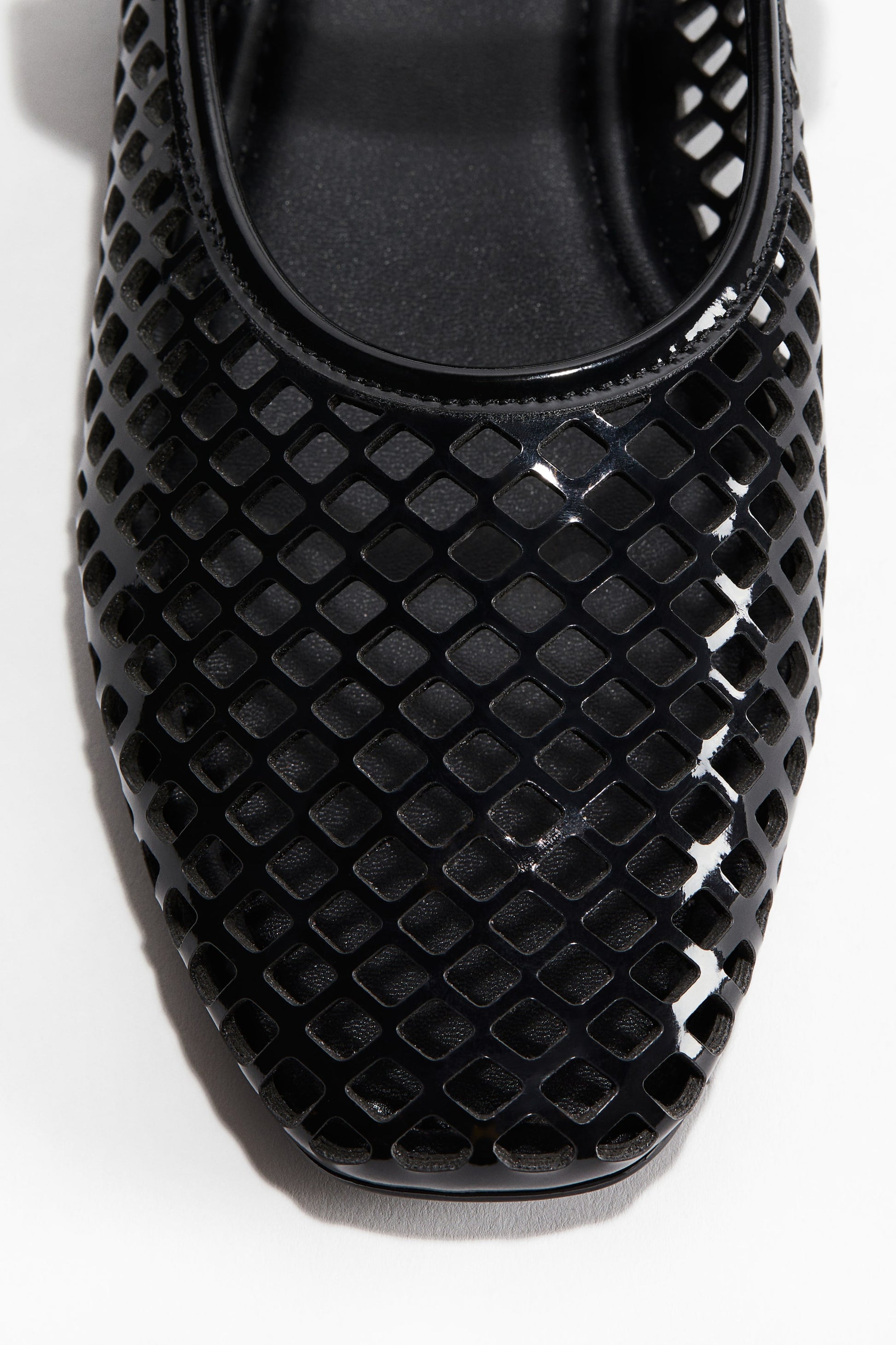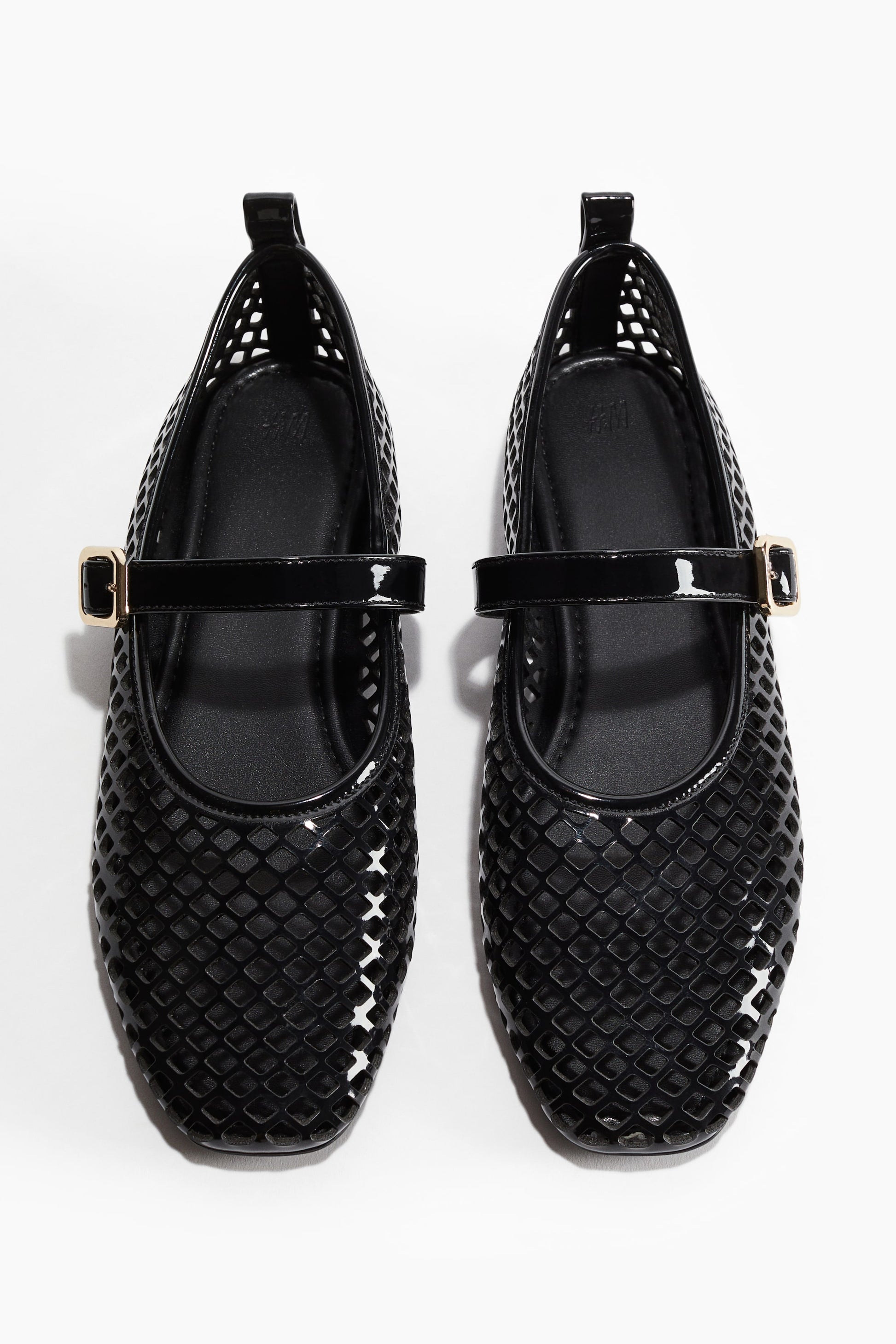 Perforated, Mary Jane-style ballet pumps in coated fabric. Rounded toes, an adjustable foot strap with a metal buckle and a loop at the back.
