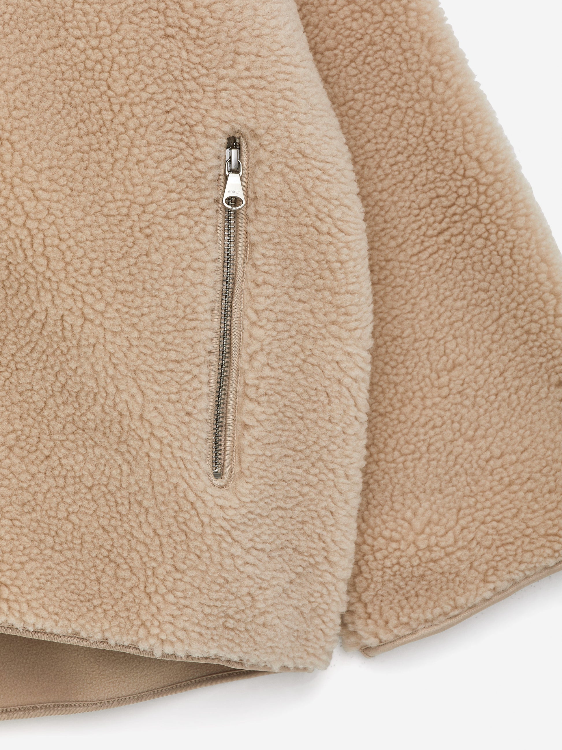 Soft pile jacket with a high collar and a metal zip at front. Front pockets with metal zippers.