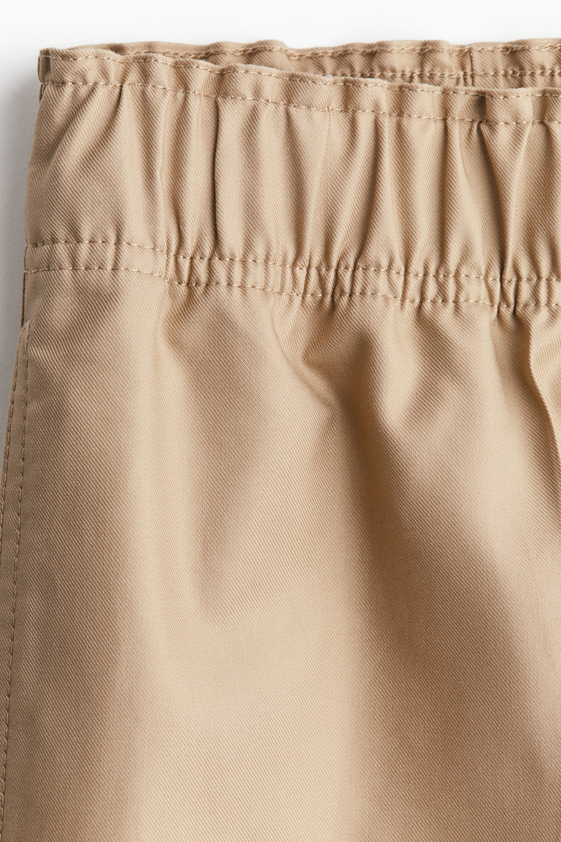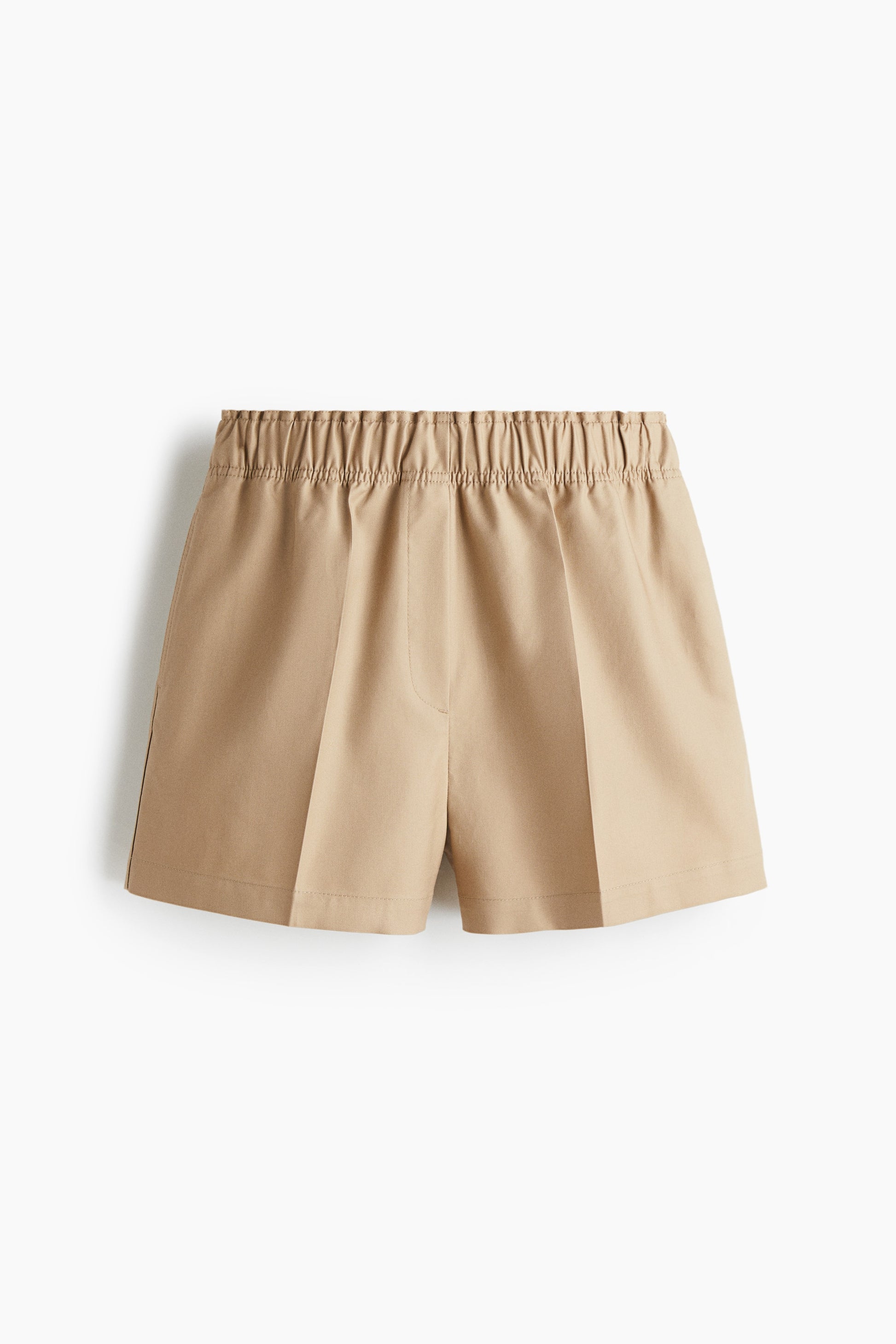 Loose-fit shorts in pima cotton twill featuring a high waist with covered elastication and a fake fly. Discreet side pockets, patch back pockets and creases down the front and back.