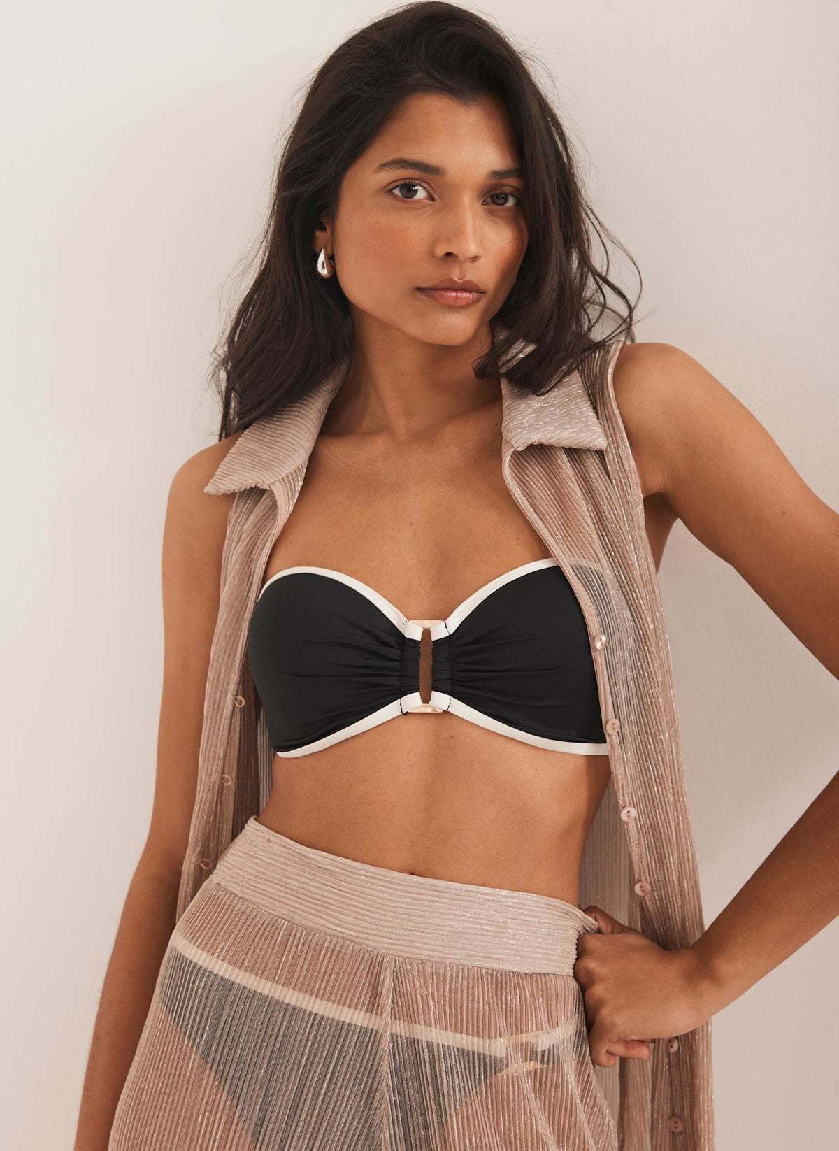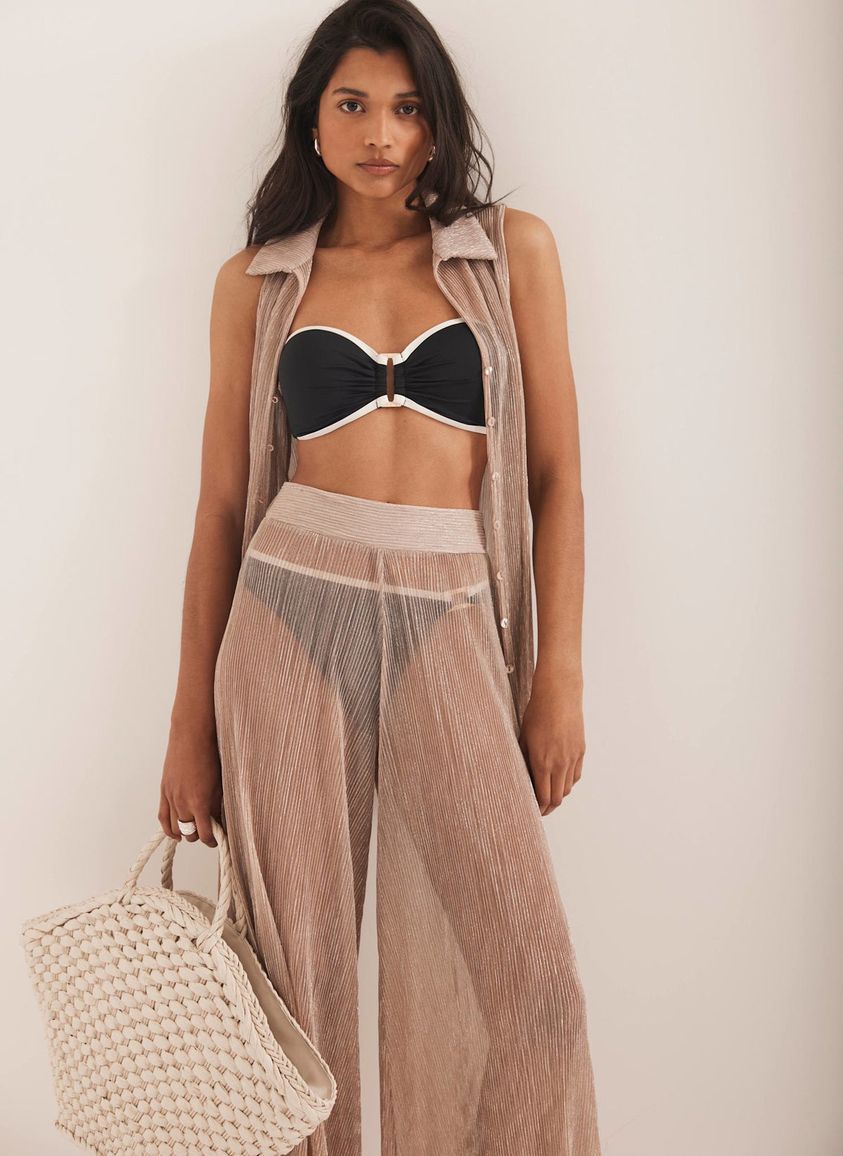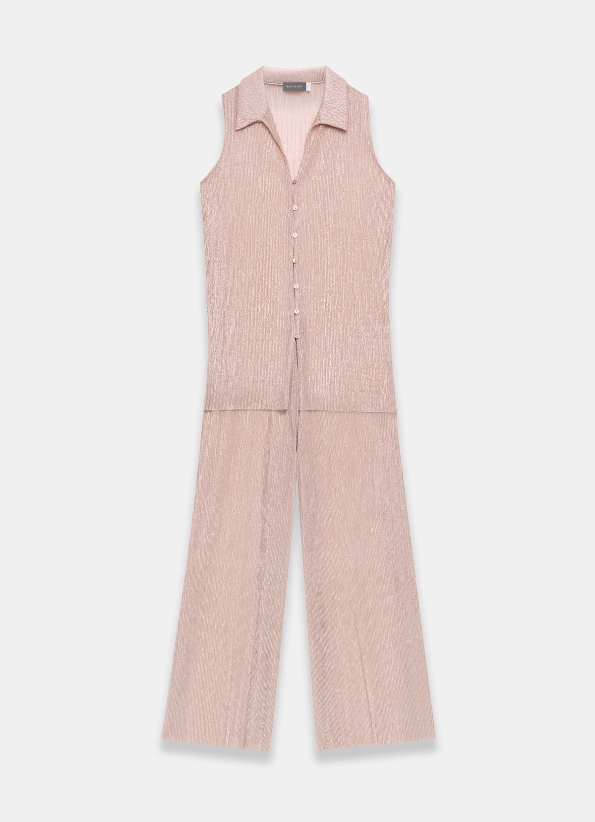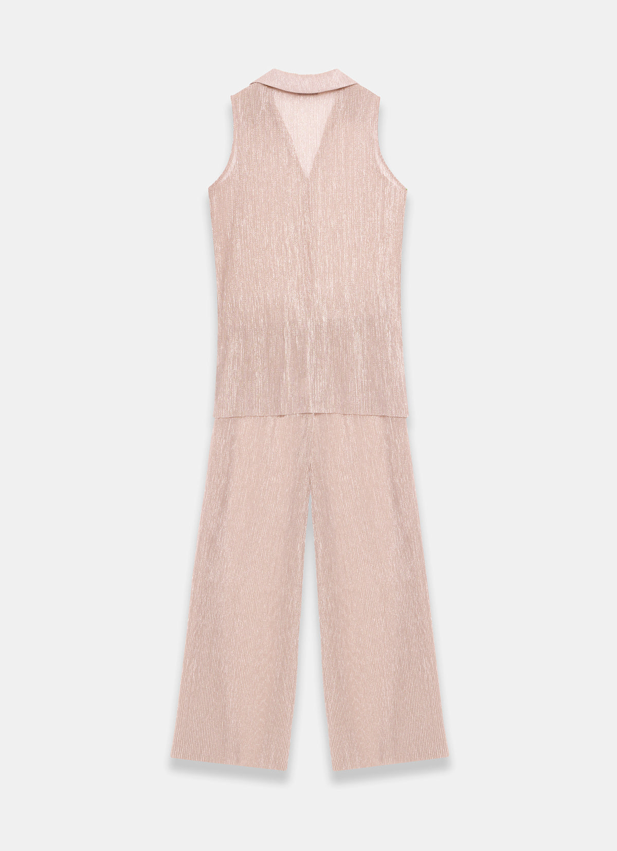 - Pale pink metallic plisse set featuring a sleeveless longline top with a classic collar, button fastening through the front with matching high-waisted, wide leg full-length trousers.