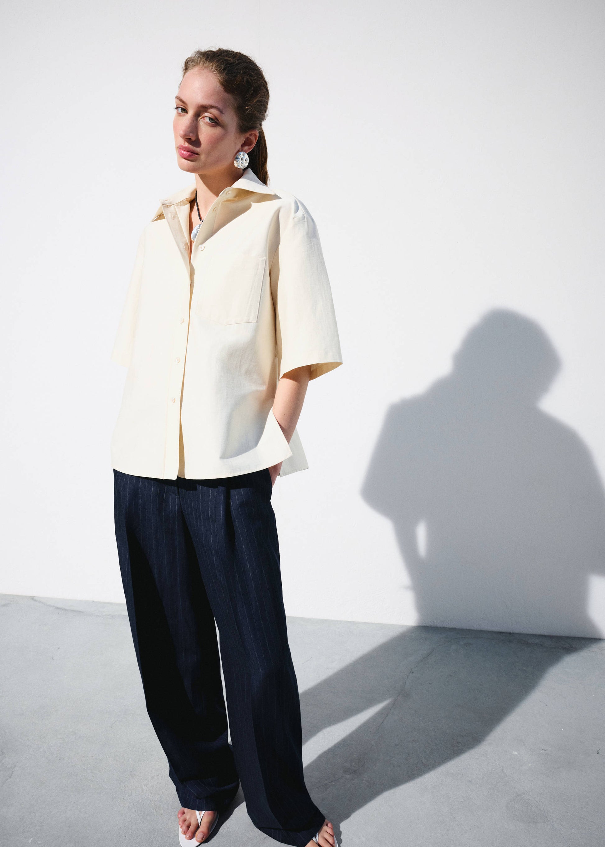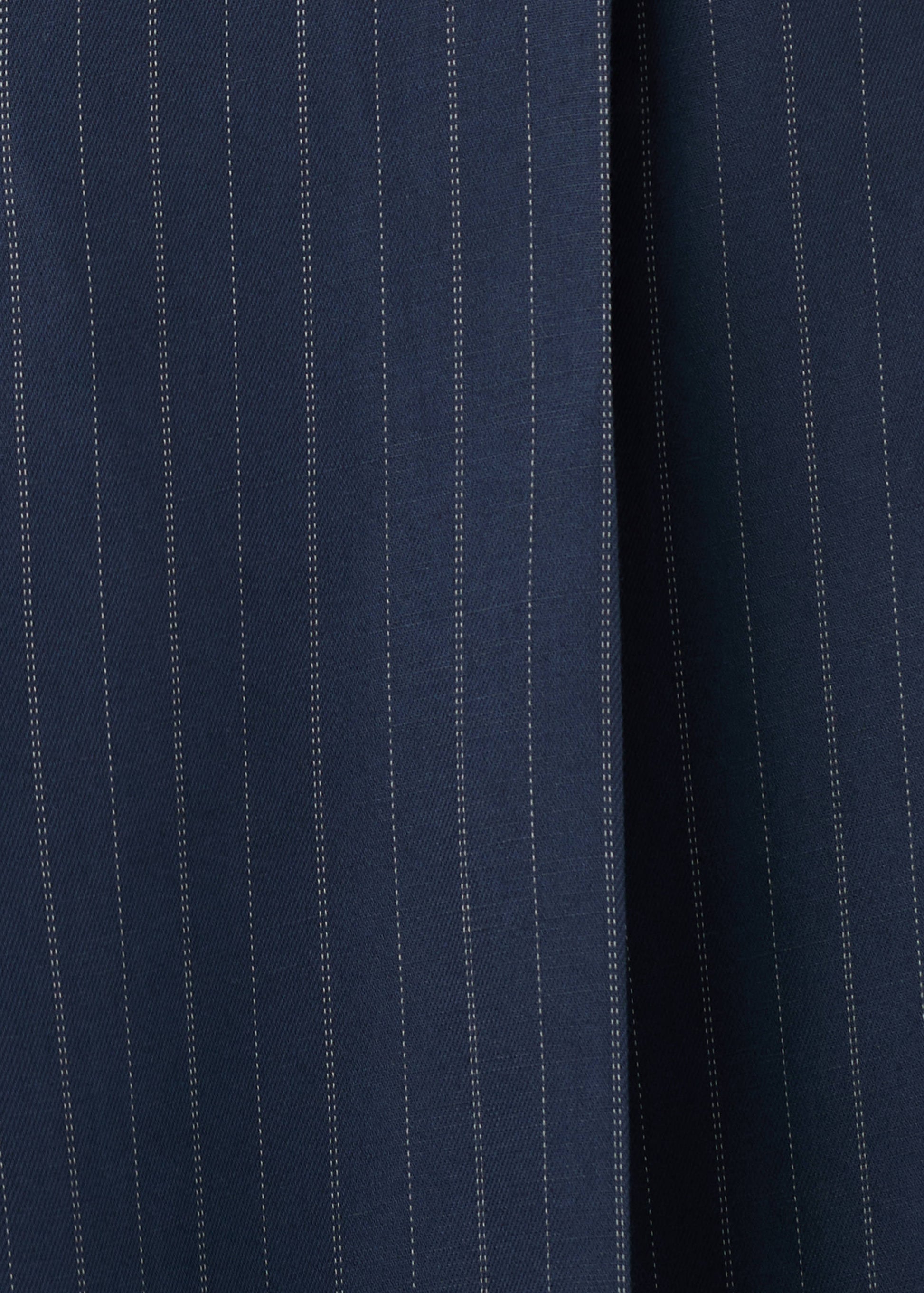 Linen mix. Straight design. Long design. Suit style. Dart detail. Pinstripe pattern. Belt loops. Mid-rise. Two side pockets. Zip, button and concealed hook-and-loop fastener with placket. Inner lining. Total look. Online Exclusive. Selection Collection