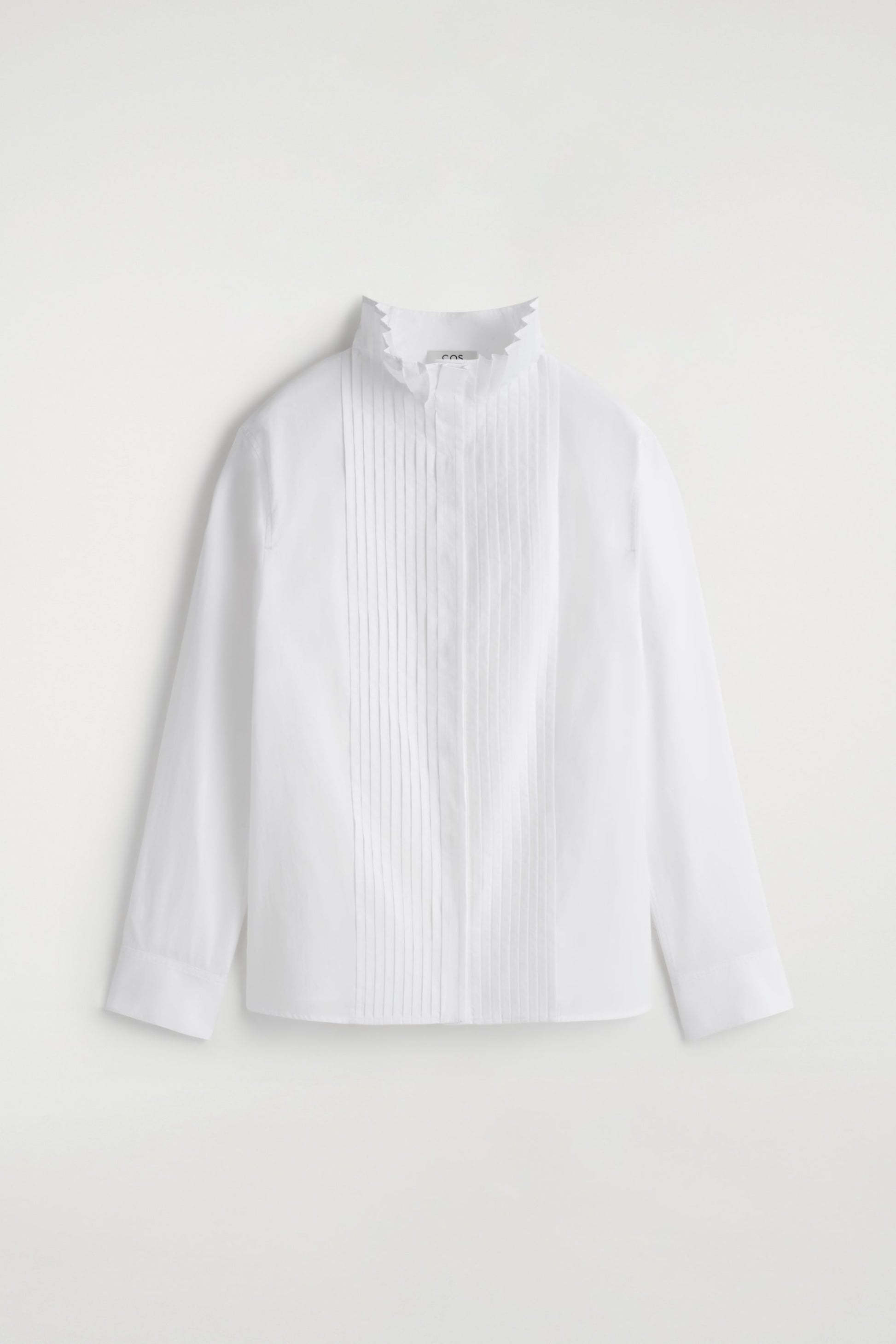Defined by sophisticated pintucks, this modern blouse is crafted from soft cotton in a crisp white tone. It's designed with a funnel-neck collar, pleated cuffs and concealed buttons.