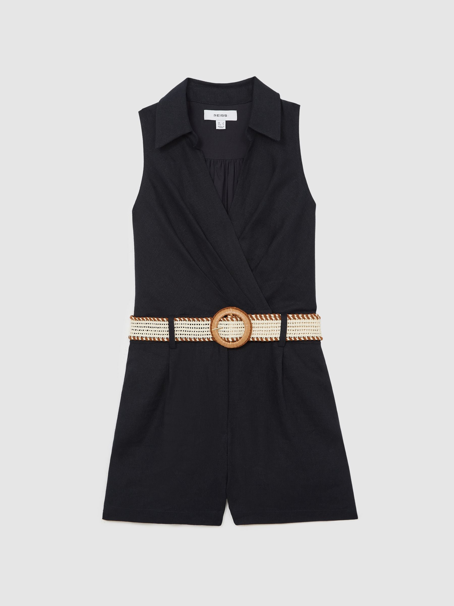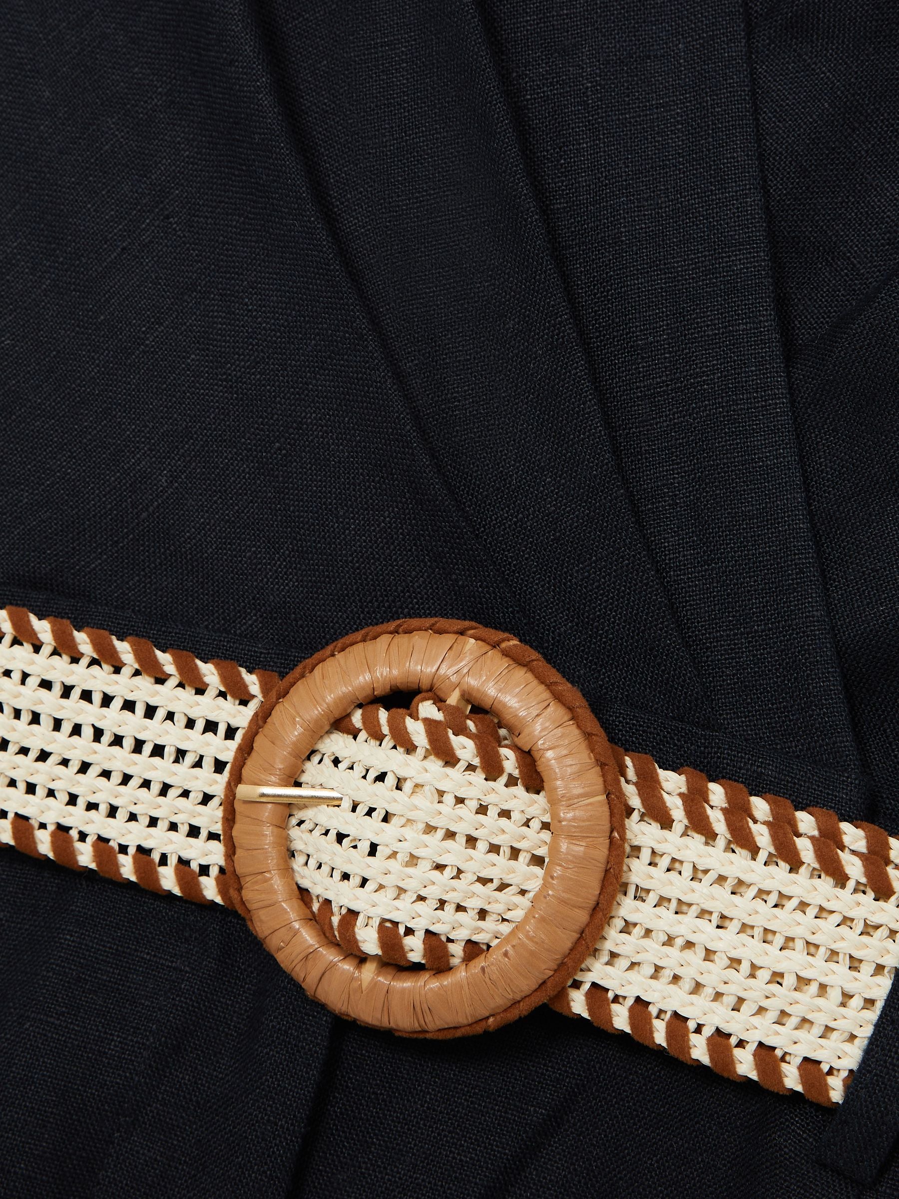 The Mila playsuit is crafted from 100% linen for a lightweight, breathable feel. A wrap-style V-neckline and spread collar lend a polished finish, while a woven raffia belt adds a natural, summer-ready touch.100% linenSpread collarRaffia beltWrap-style V-necklineSleeveless The model is wearing a size 8 Measurements of model Height 5 10" 177.8cm