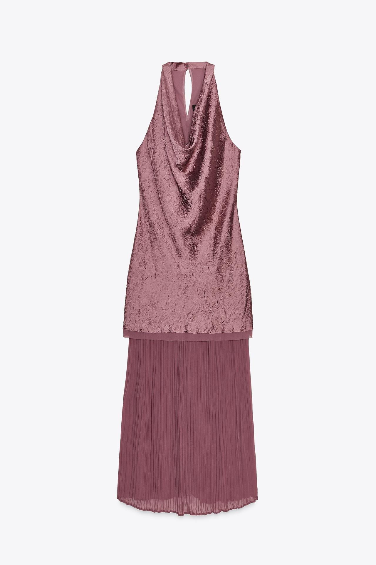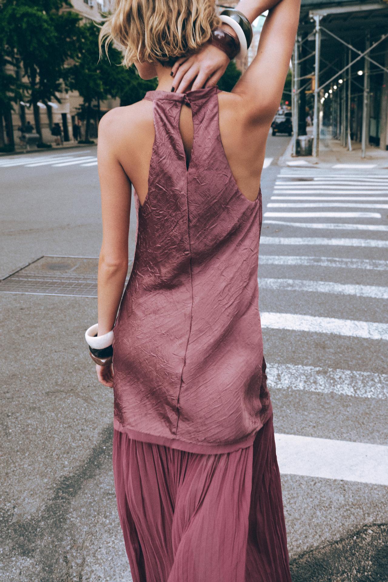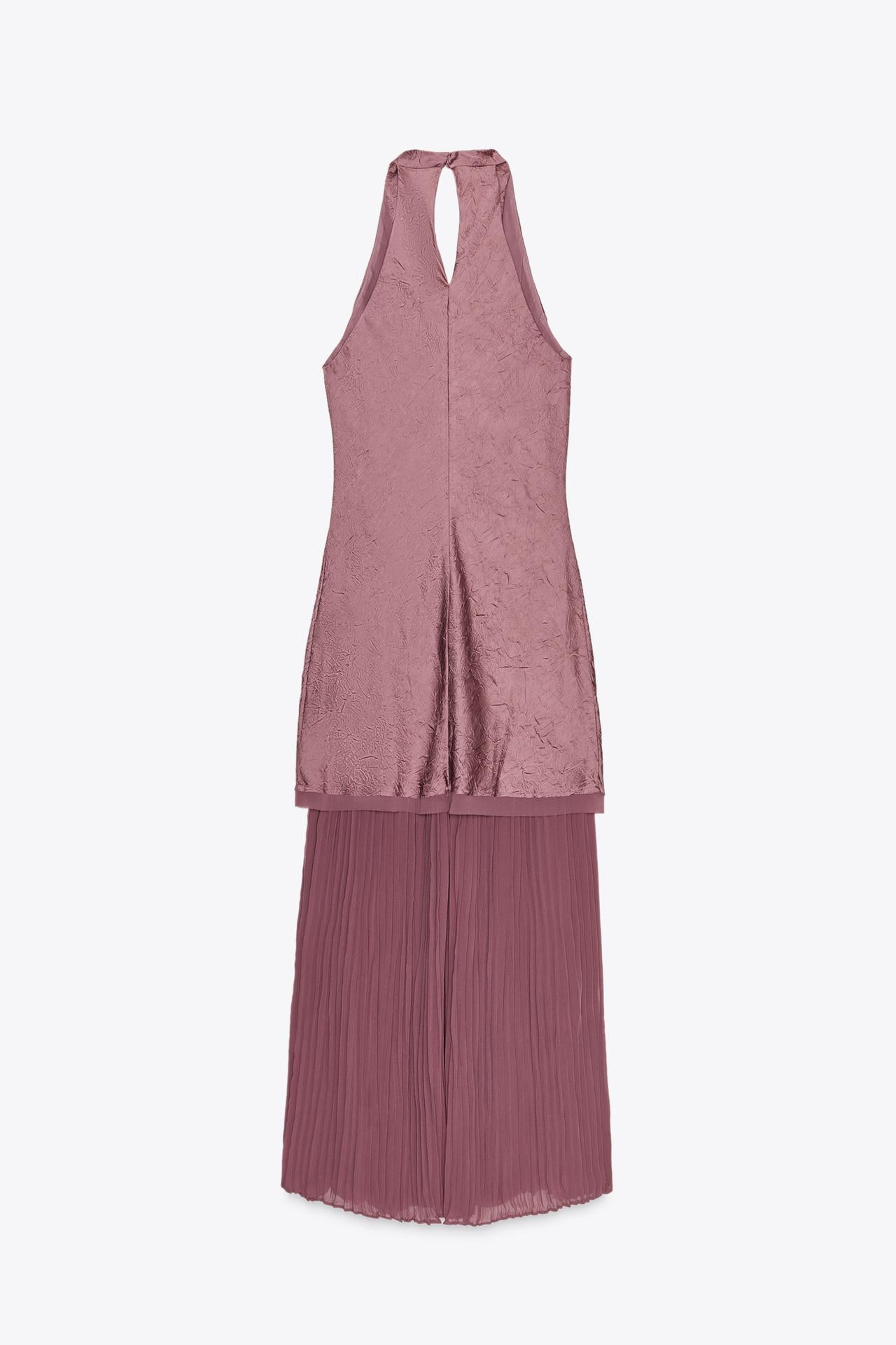 Flowing halter neck dress. Featuring textured fabric detail combined with a pleated hem. Back fastening with an opening and hidden buttons.
