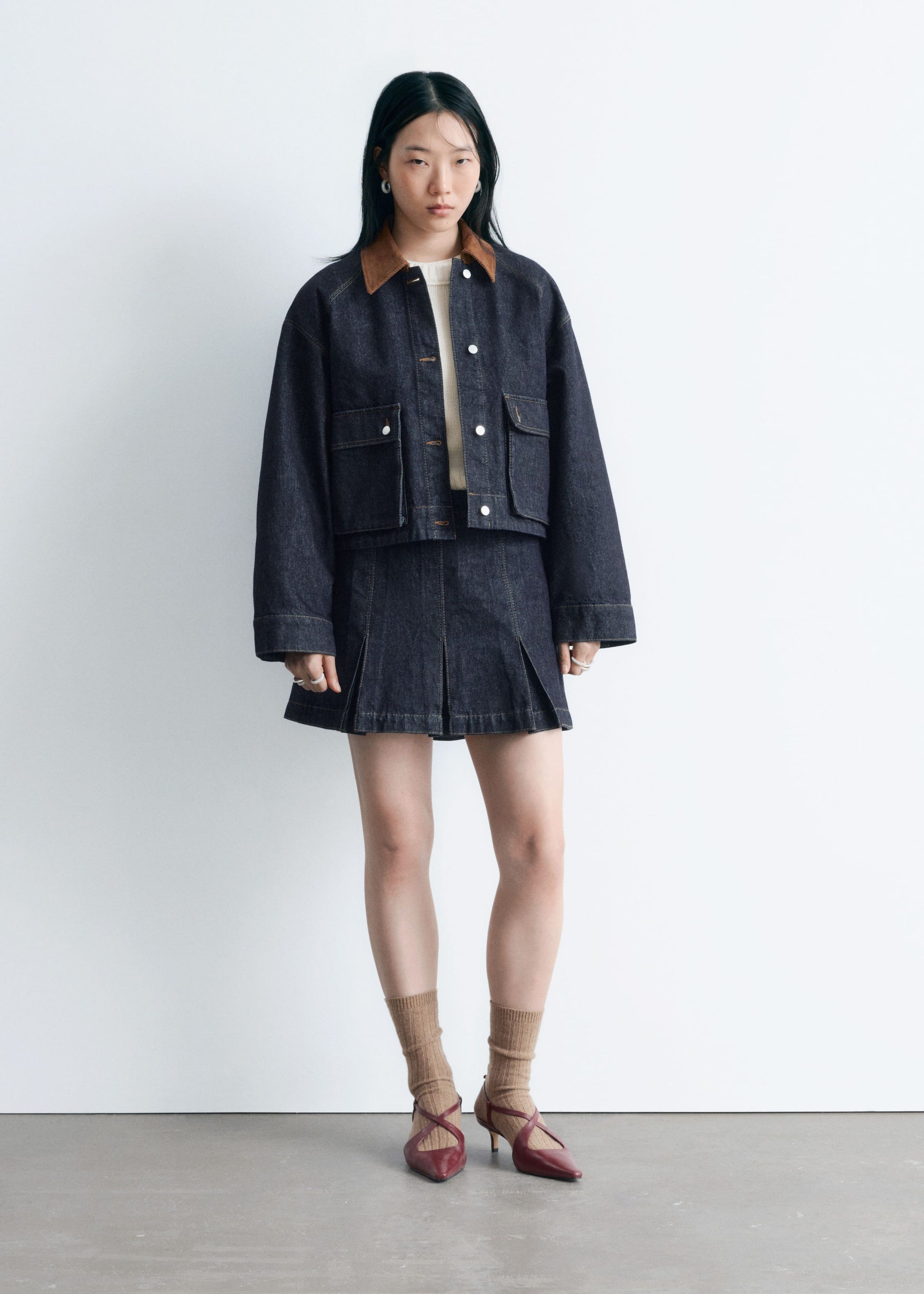 Crafted from rigid denim, this mini skirt is cut in an A-line silhouette, featuring box pleats at the hem and contrasting topstitched seams. Finished with a subtle side zipper.