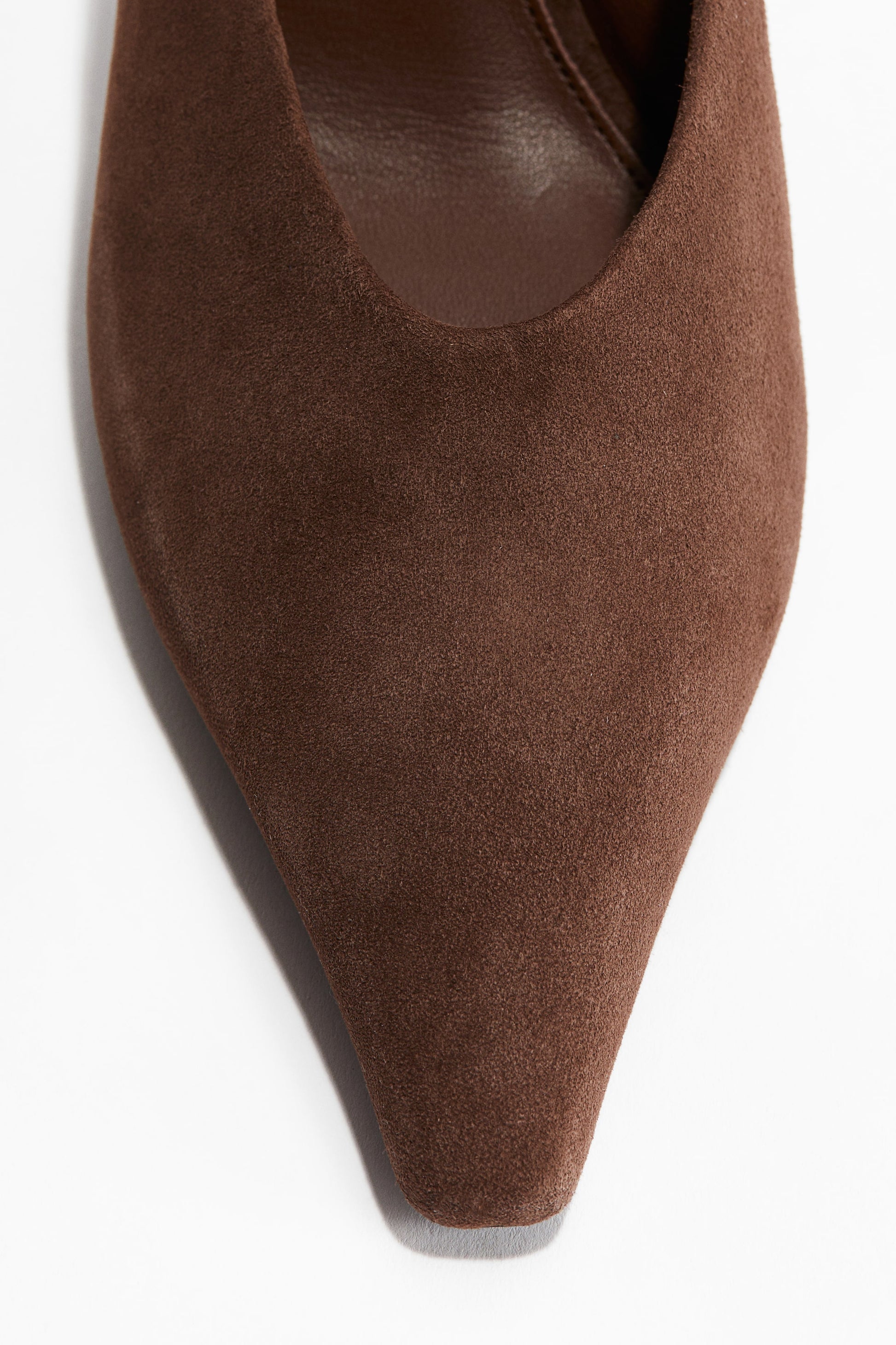 Mules in soft suede with pointed toes and covered heels. Leather insoles.