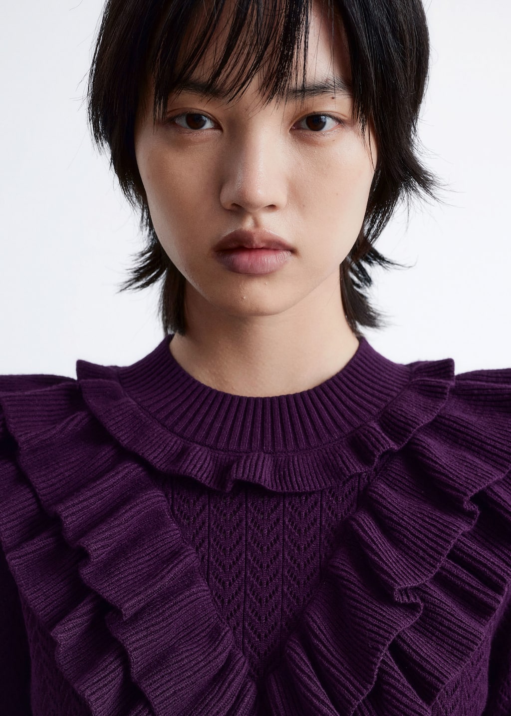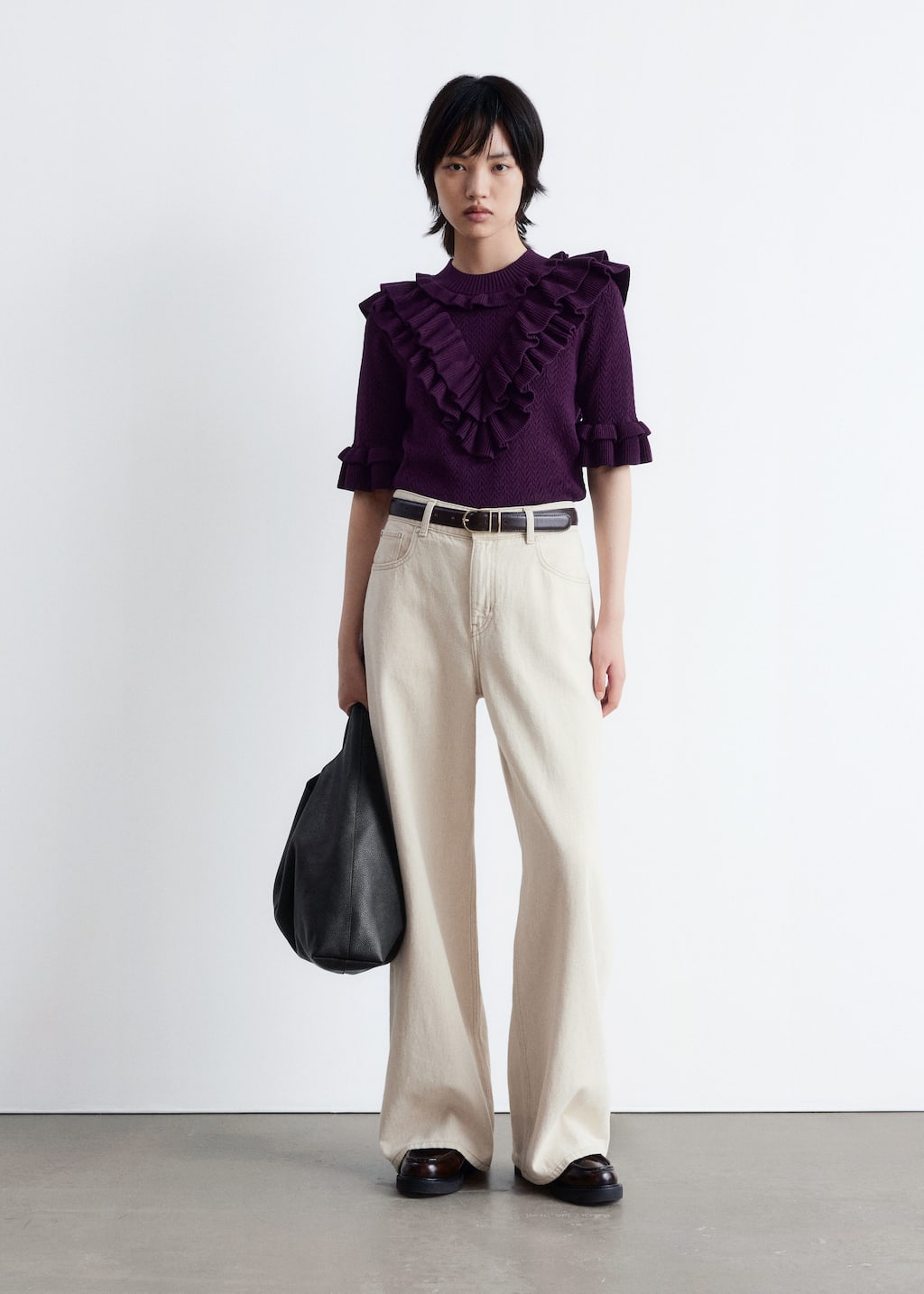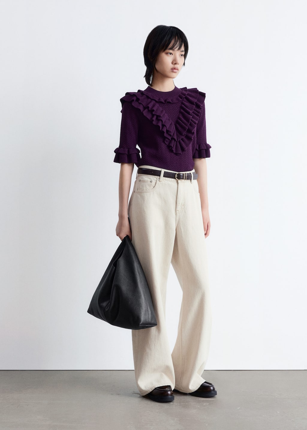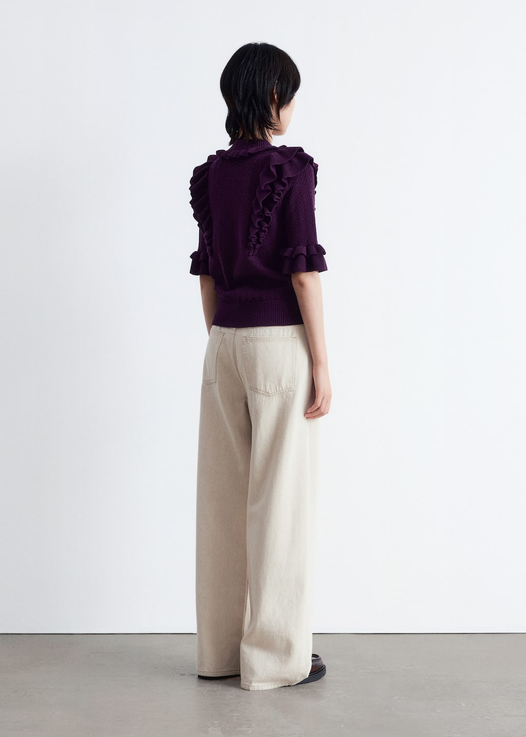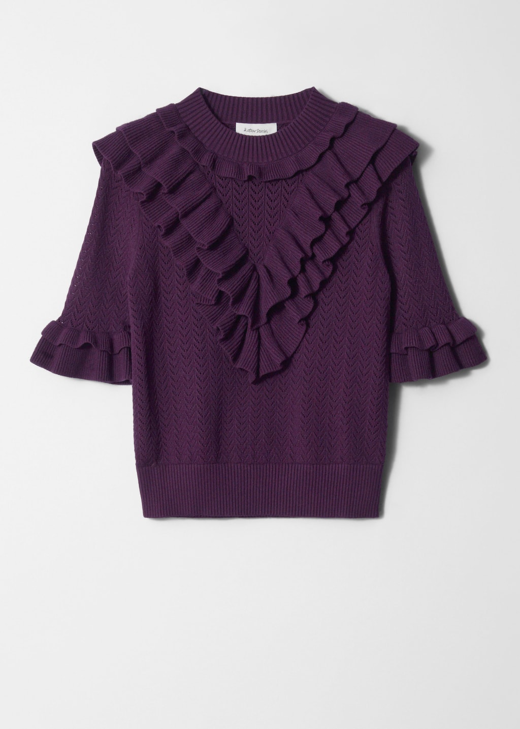 This top is crafted from a soft pointelle-knit fabric. Designed with a round neck, short sleeves, and layered ruffles that trace the neckline, sleeves, and a dramatic v-shaped front panel. Finished with a ribbed neckline and hem. Style with tailored trousers or high-waist denim for contrast.