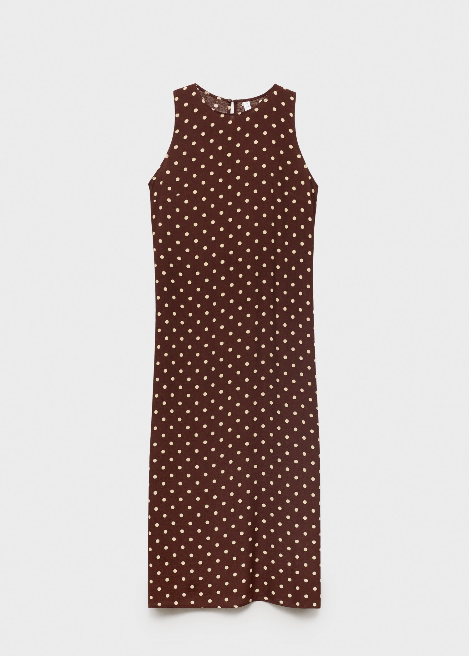 Midi design. Straight design. Spots print. Round neckline. Sleeveless. Wide straps. Adjustable back tie. Back slit detail. Button closing on the neck. Available Plus. The blue colour is an online exclusive.