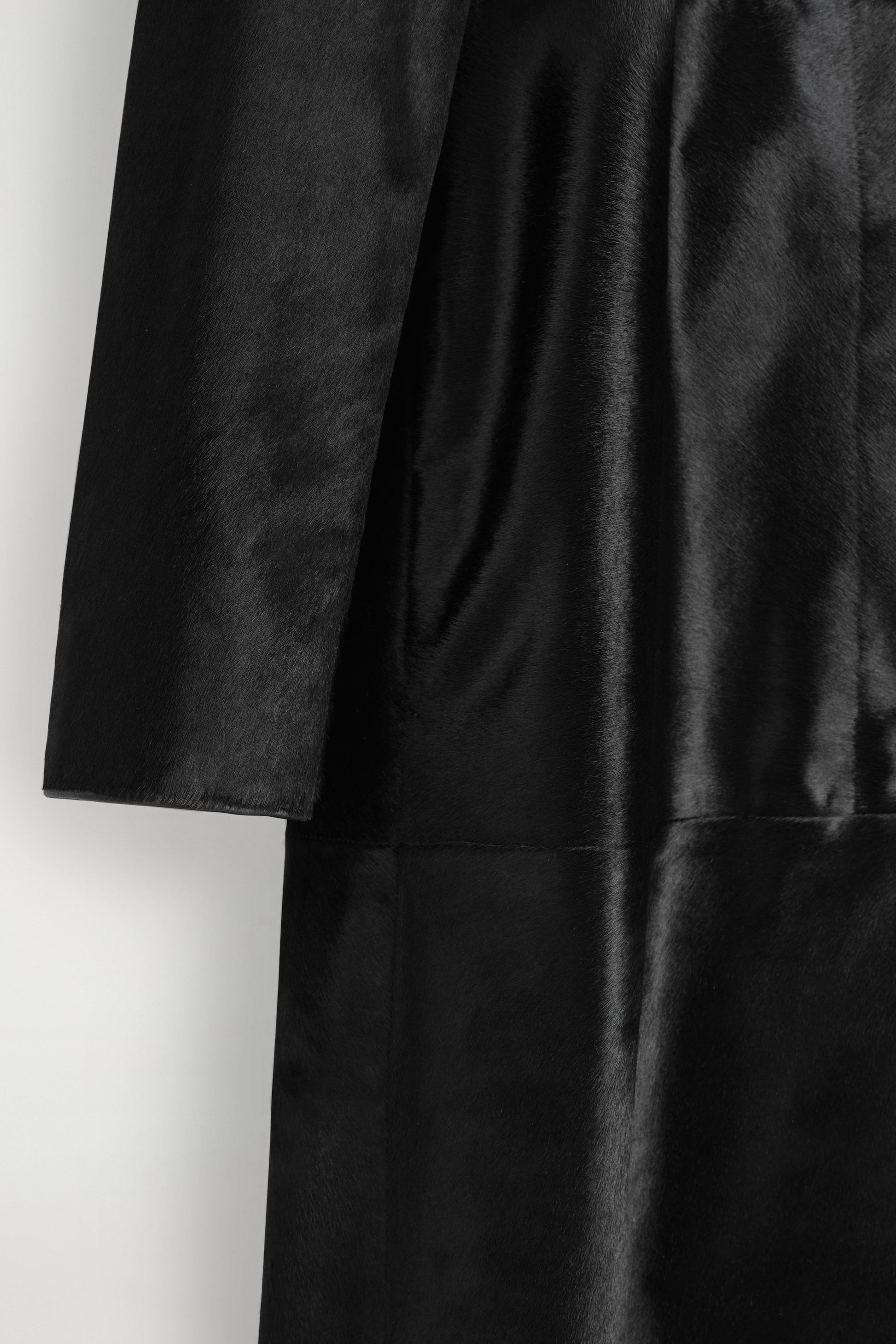 Autumn Winter 2025 takes the modern wardrobe to new heights: the epitome of quiet confidence. Luxurious in its tactility, this striking coat is crafted from richly textured pony-hair leather that has a subtly glossed sheen. It's cut in a clean, minimal silhouette with a collarless neckline, storm flap, concealed press studs and a tonal hanger loop – a signature of the capsule. Leather piping borders the edges for a refined finish.