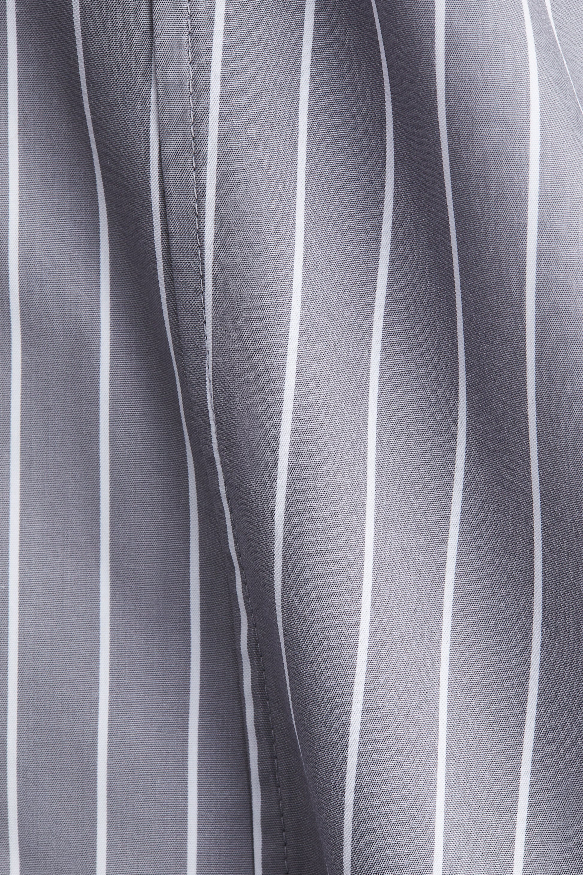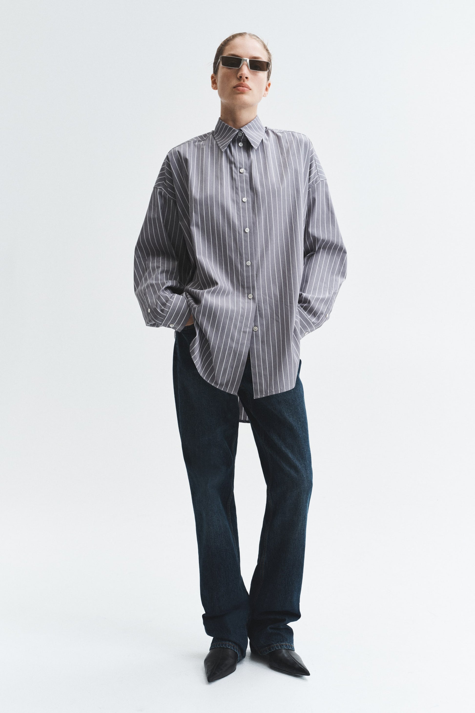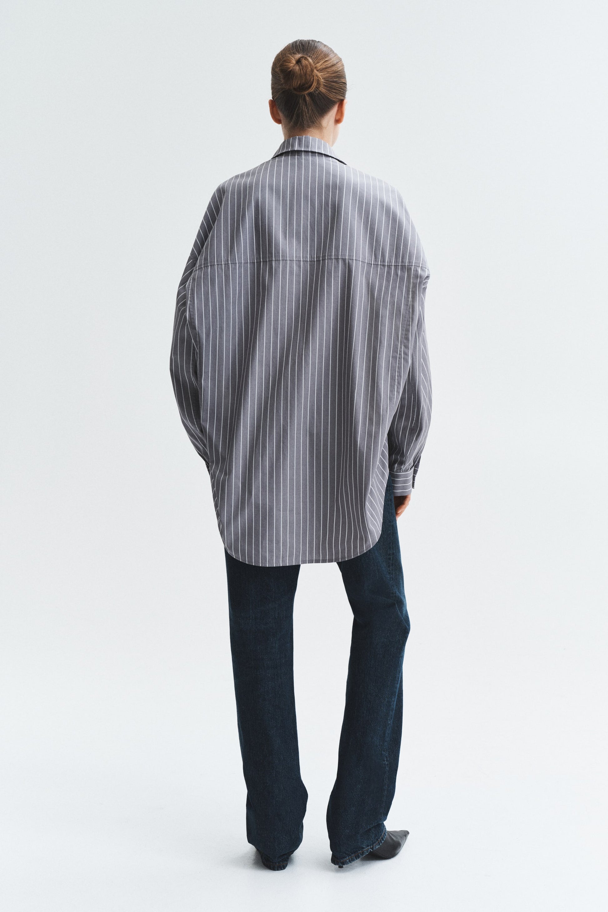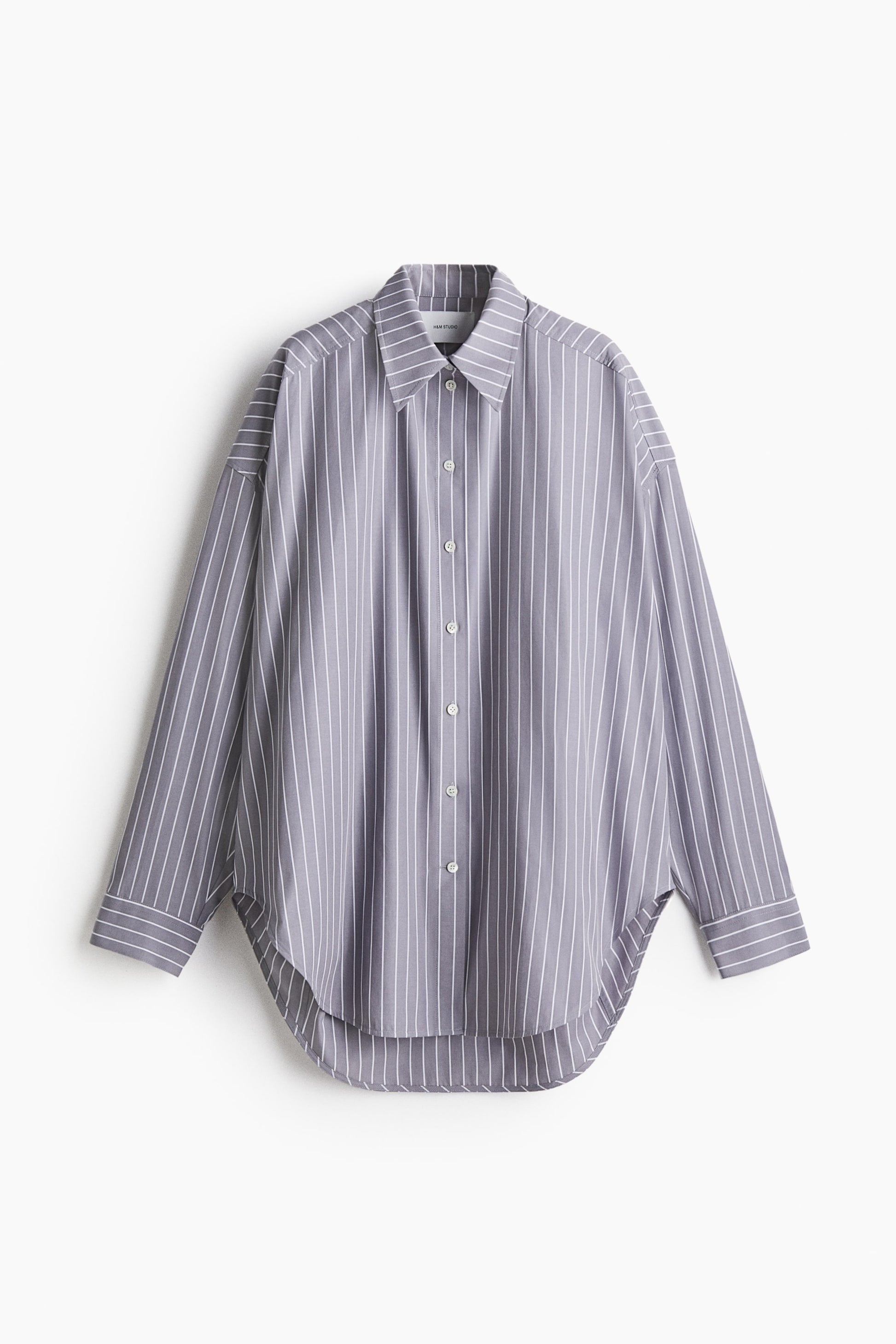 Loose-fit shirt in crisp cotton poplin with a pointed collar and buttons down the front. Double-layered yoke, dropped shoulders and long, wide sleeves with buttoned cuffs and a sleeve placket with a link button. Curved hem with high side vents. Slightly longer at the back.