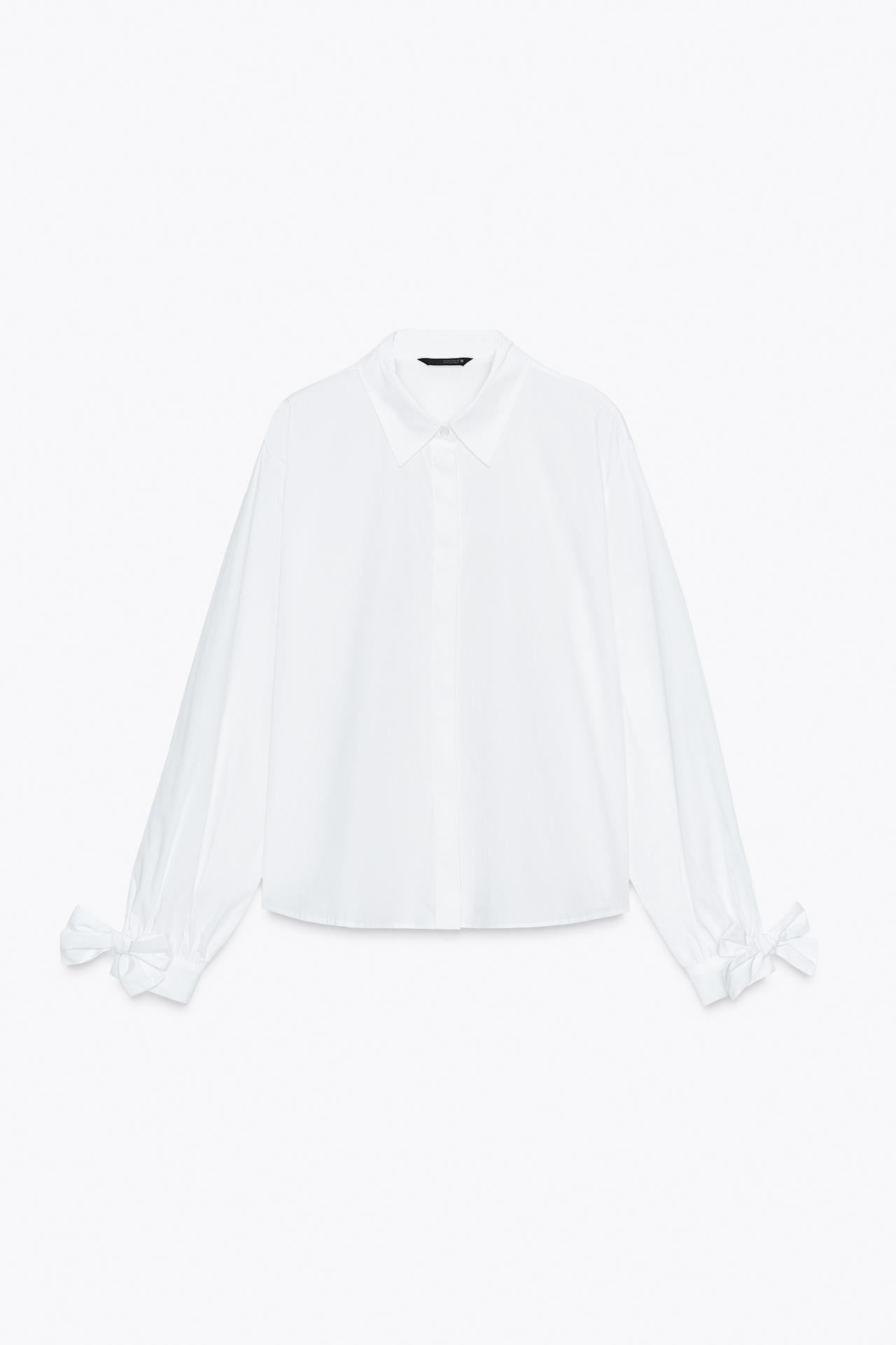 Collared, long sleeve shirt with tie detail. Front fastening with hidden buttons on the placket.