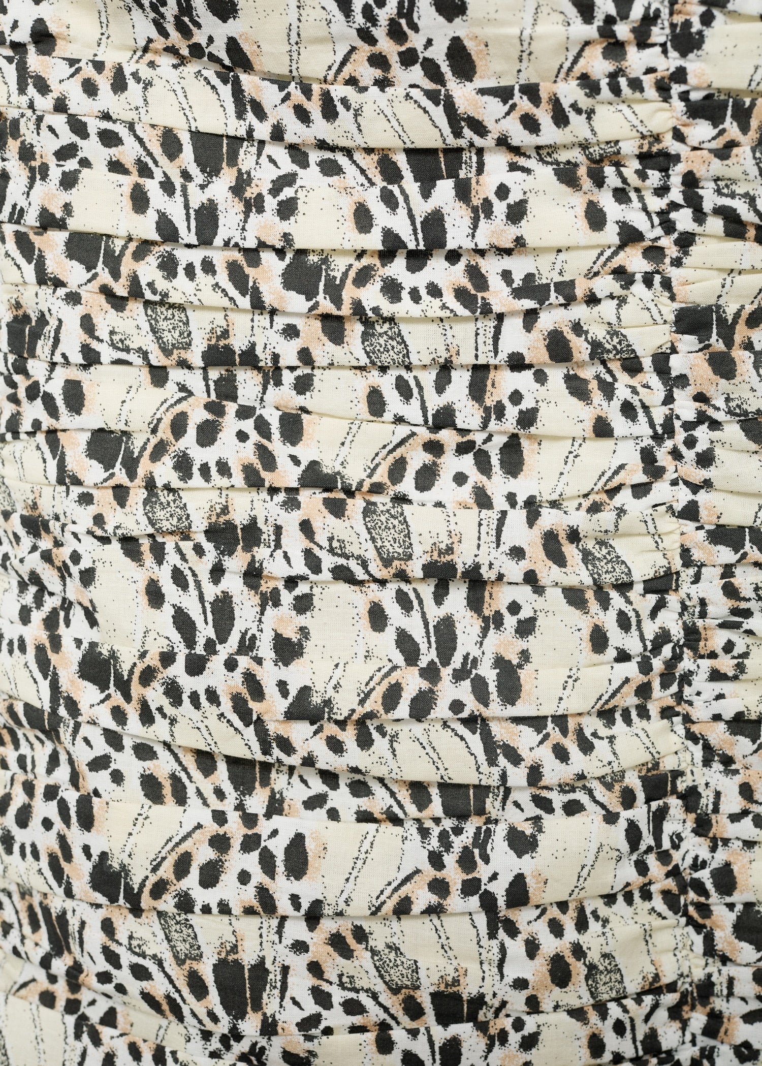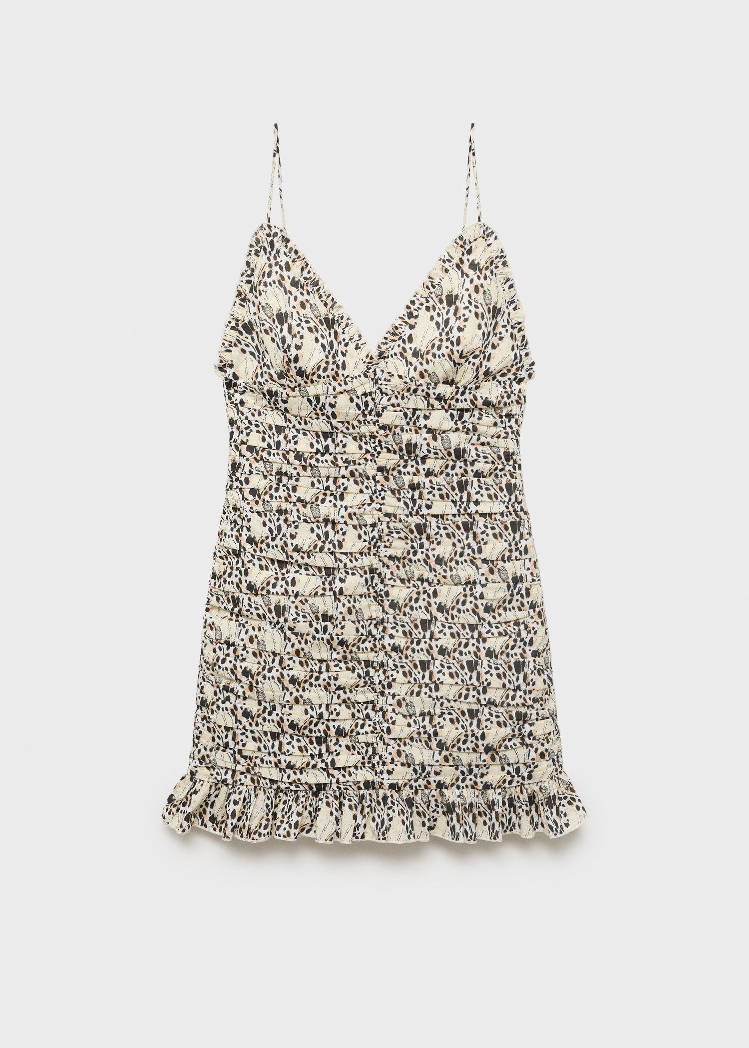 100% cotton fabric. Short design. Printed design. Butterfly print. V-neckline. Thin straps. Ruched body. Concealed zip fastening. With inner lining. Ruffle hem.