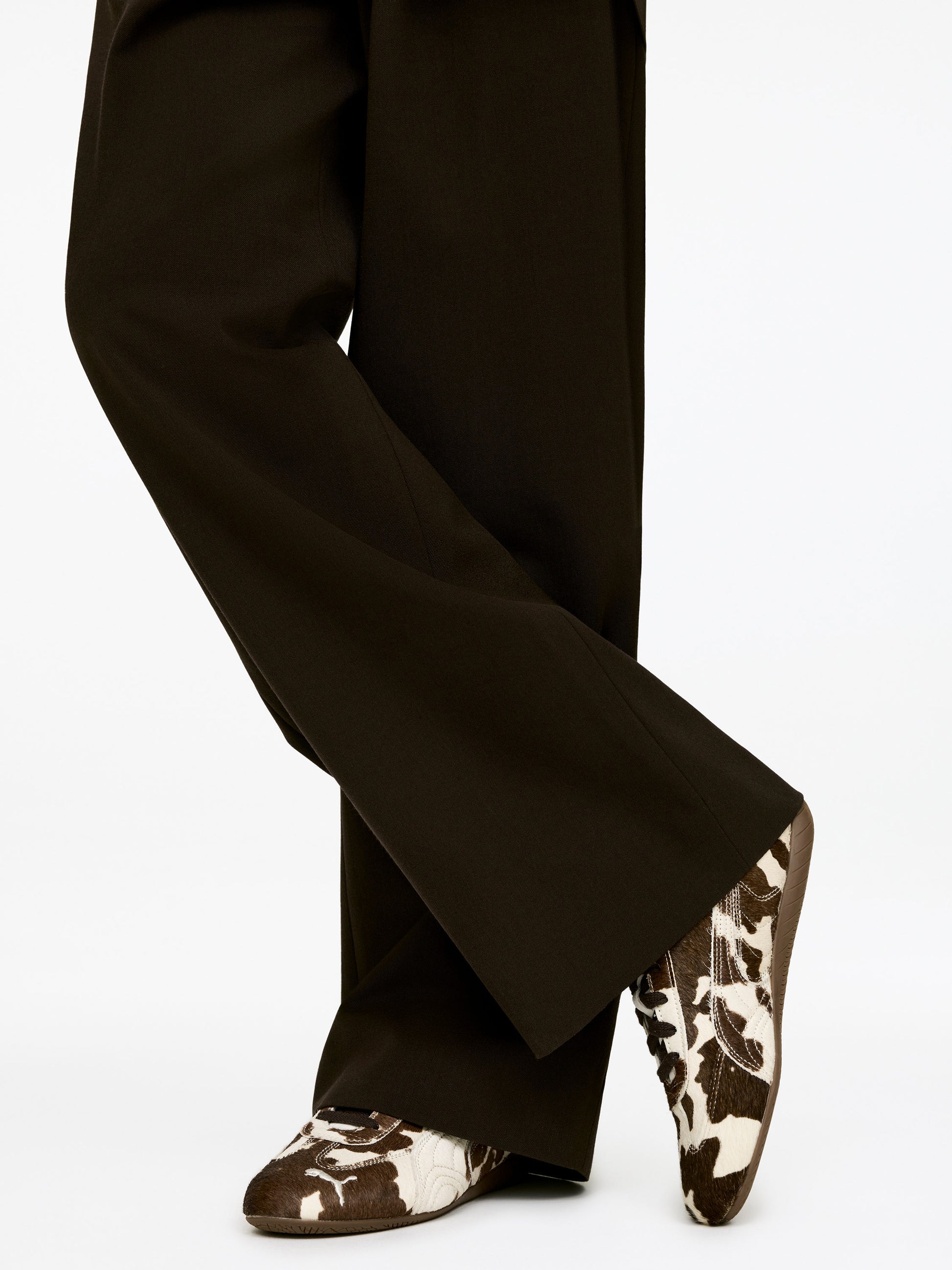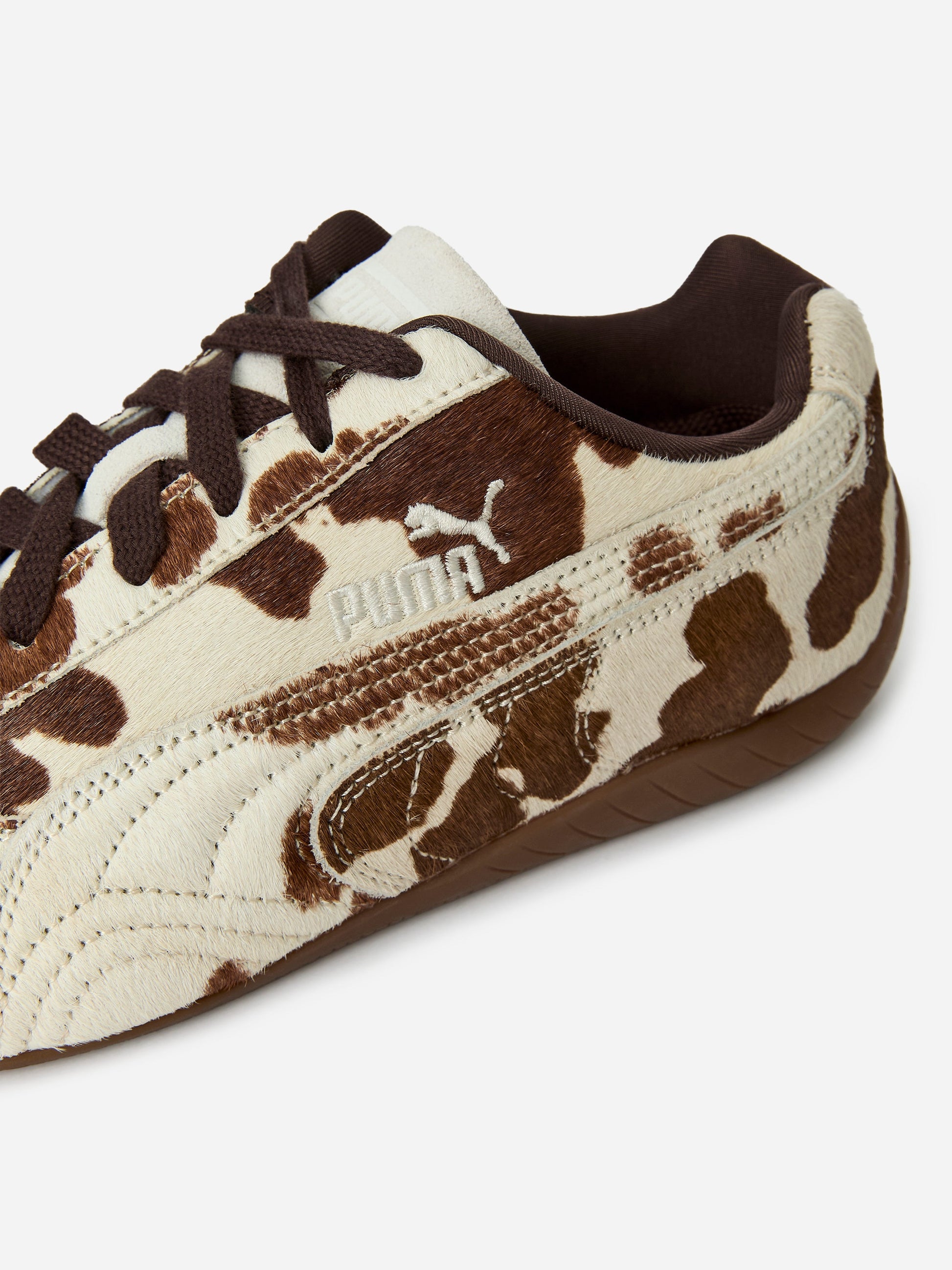 This edition of the PUMA Speedcat features a faux cow hair upper in cream and brown, a gum rubber sole, and subtle PUMA branding.