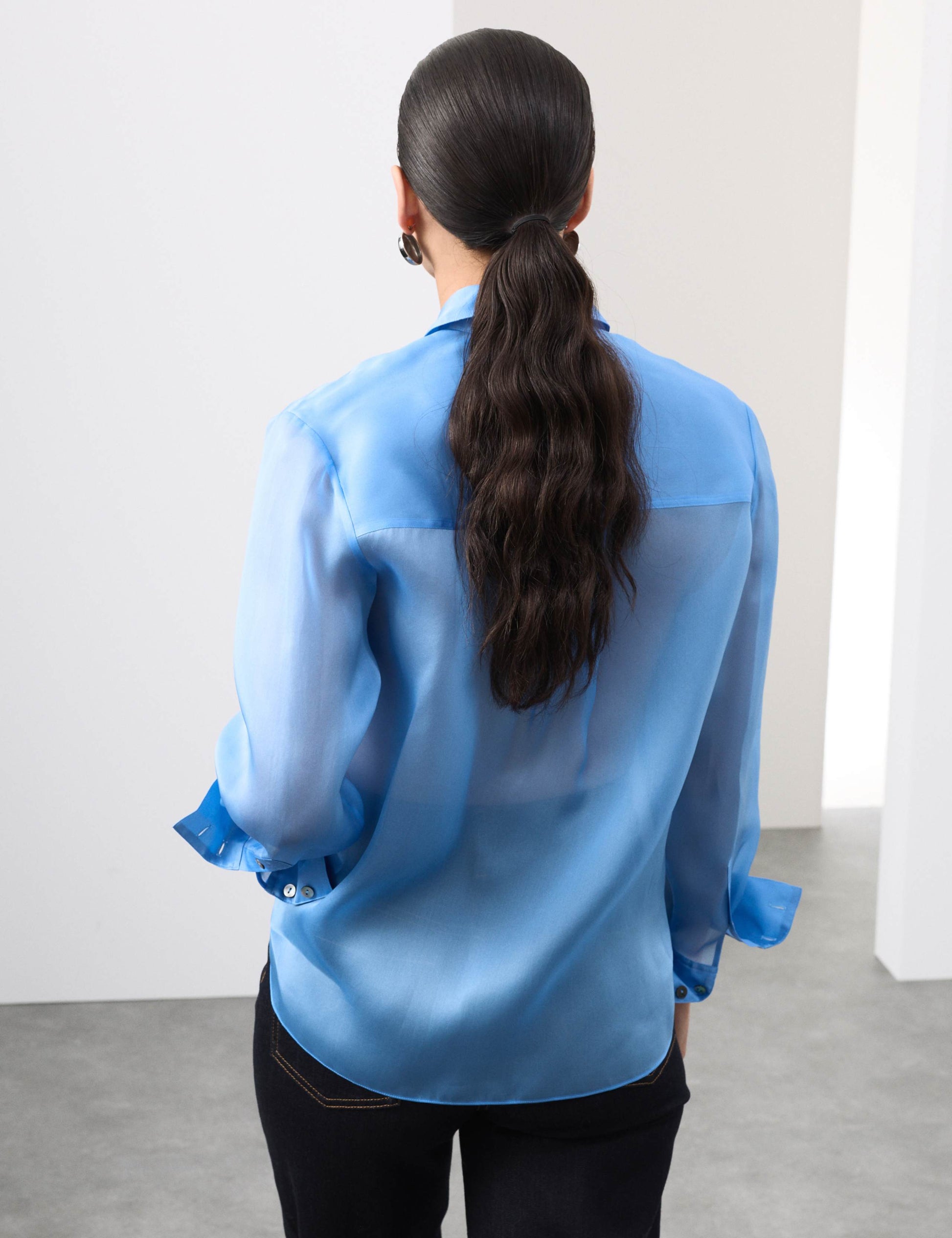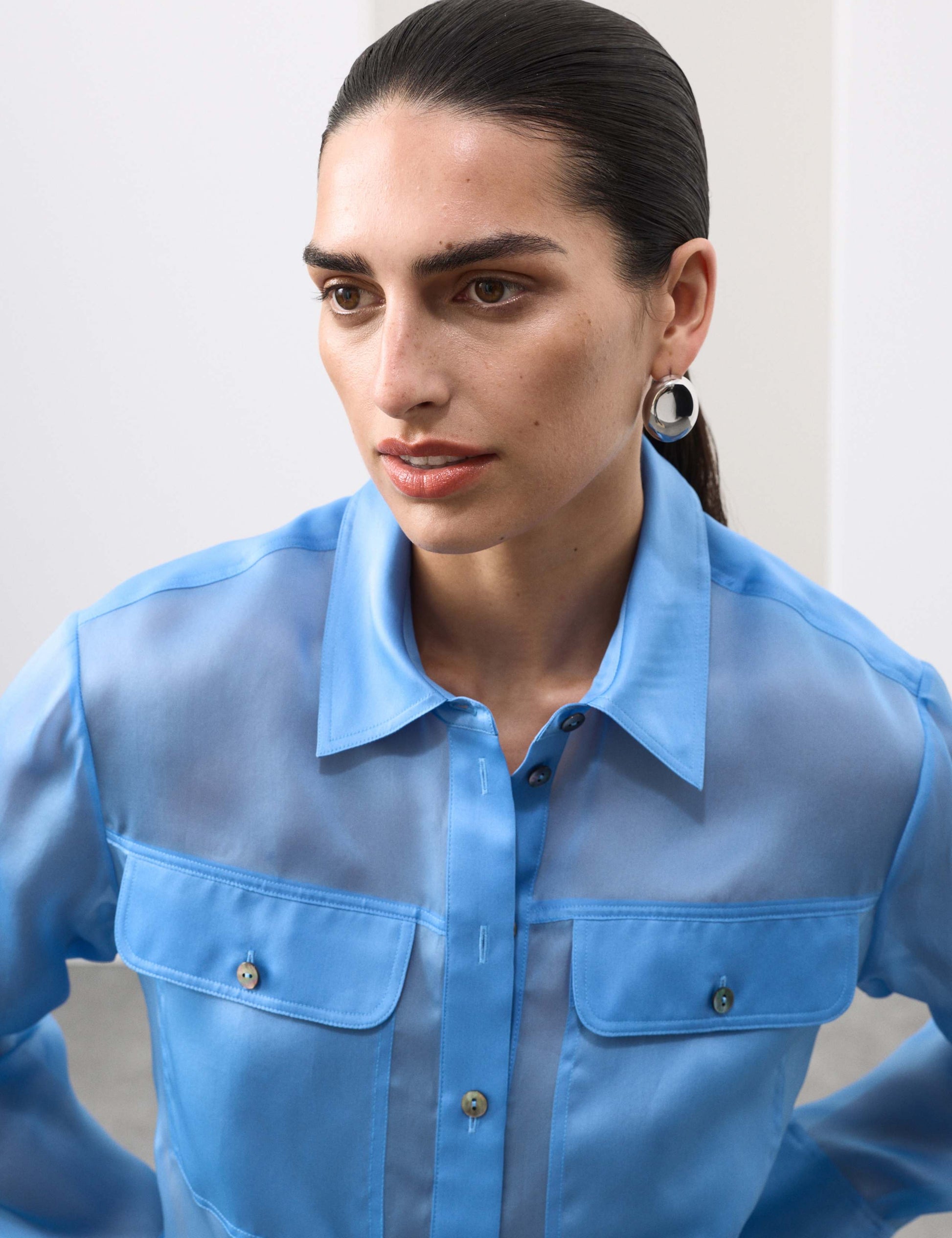 This utility shirt from our Autograph collection is crafted from pure silk organza for an opulent look and feel. Designed in an easy relaxed fit, it features a classic collared neckline and cuffed long sleeves. Pearly buttons add lustrous detail to the front placket and two chest pockets. A gently curved hem provides a feminine finish.