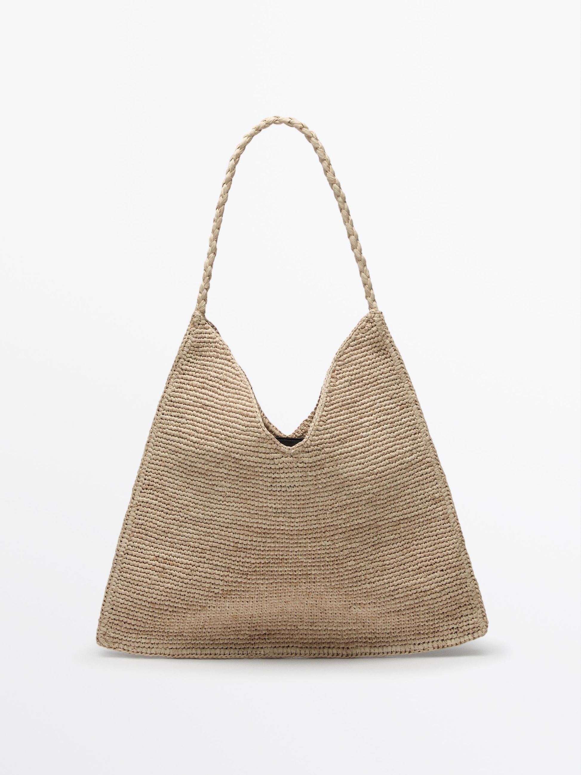 Natural raffia bag. A handleshoulder strap. Magnetic snap-button fastening. Handle. An inside pocket. Flower detail incorporated.