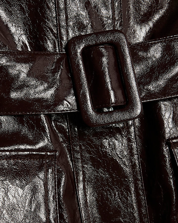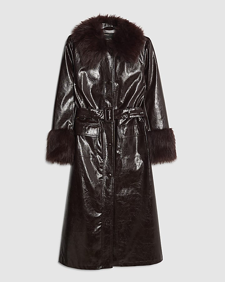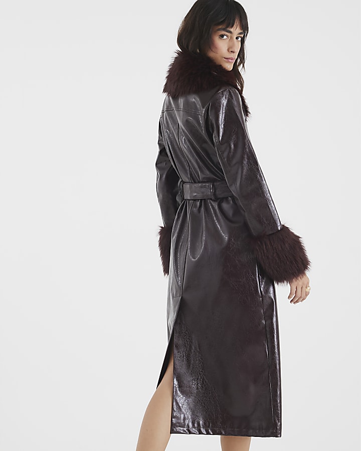 Red Faux Fur Trim Belted Trench Coat
