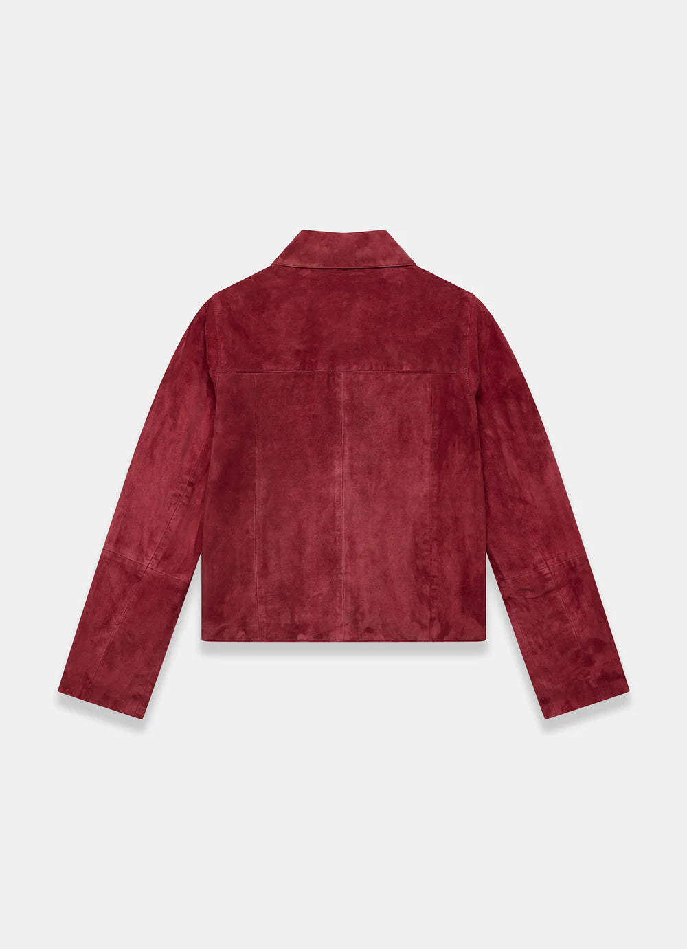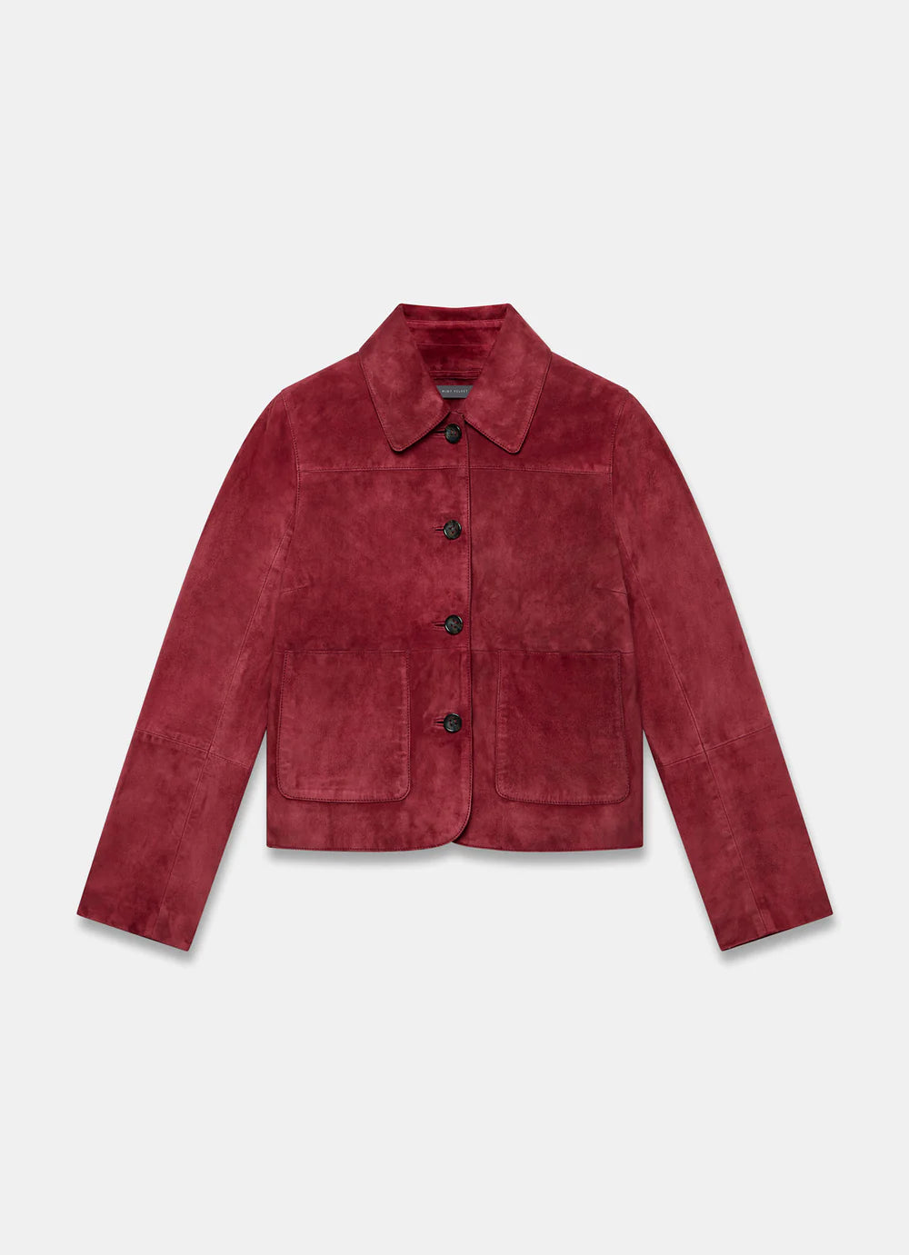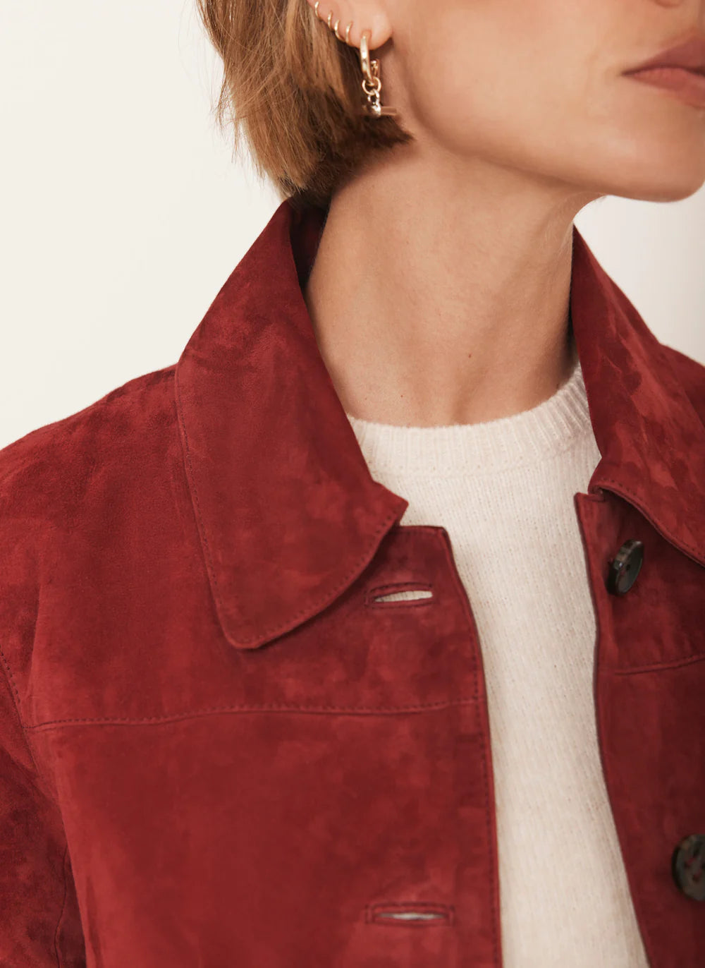 - Red tone suede jacket with a classic collar, long sleeves, square pockets with button fastenings through the front.