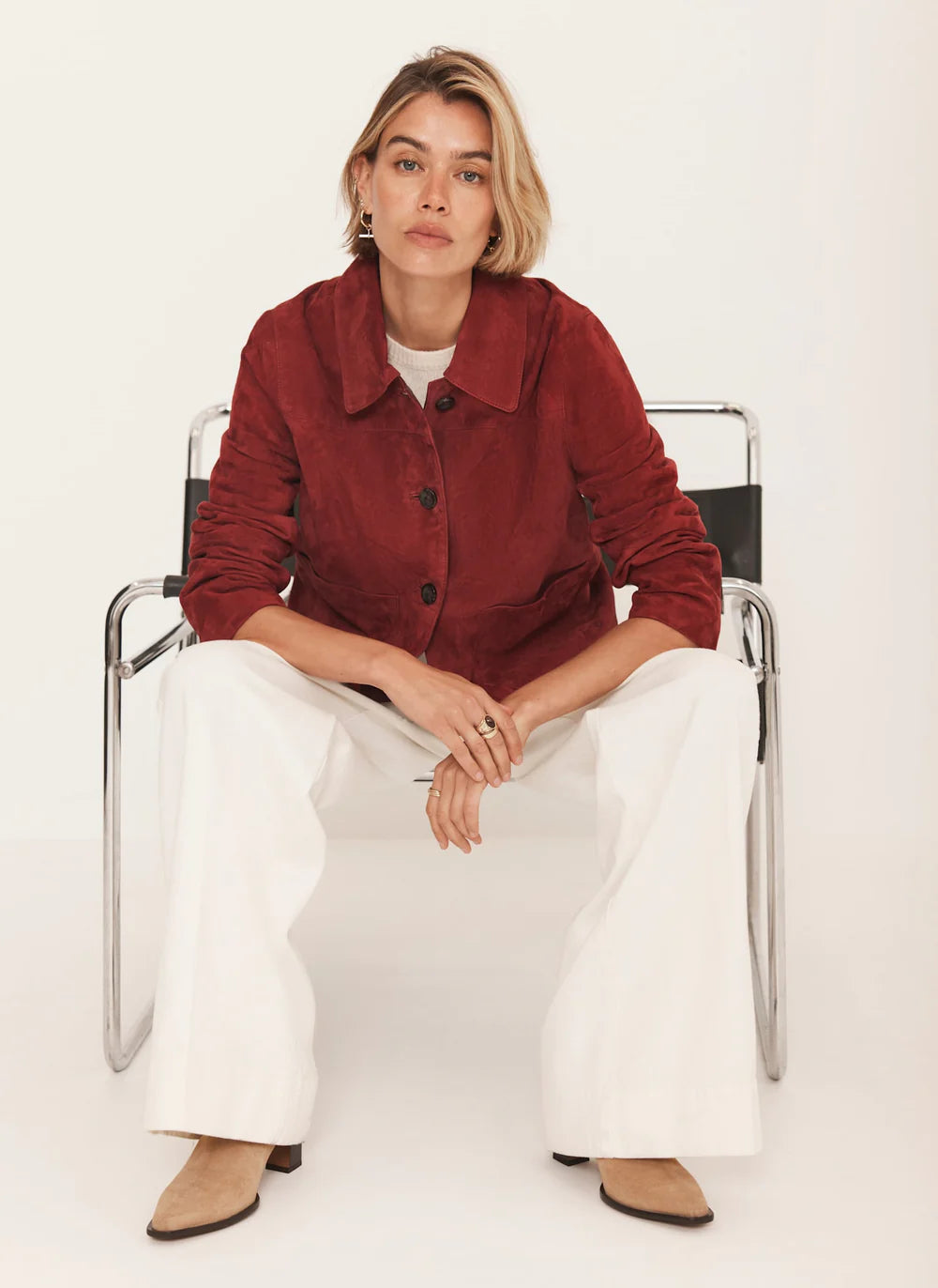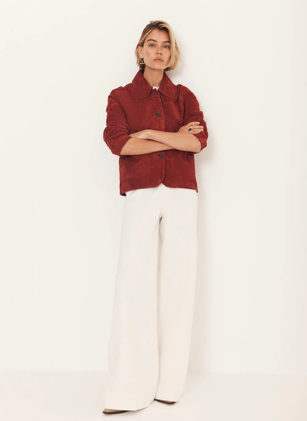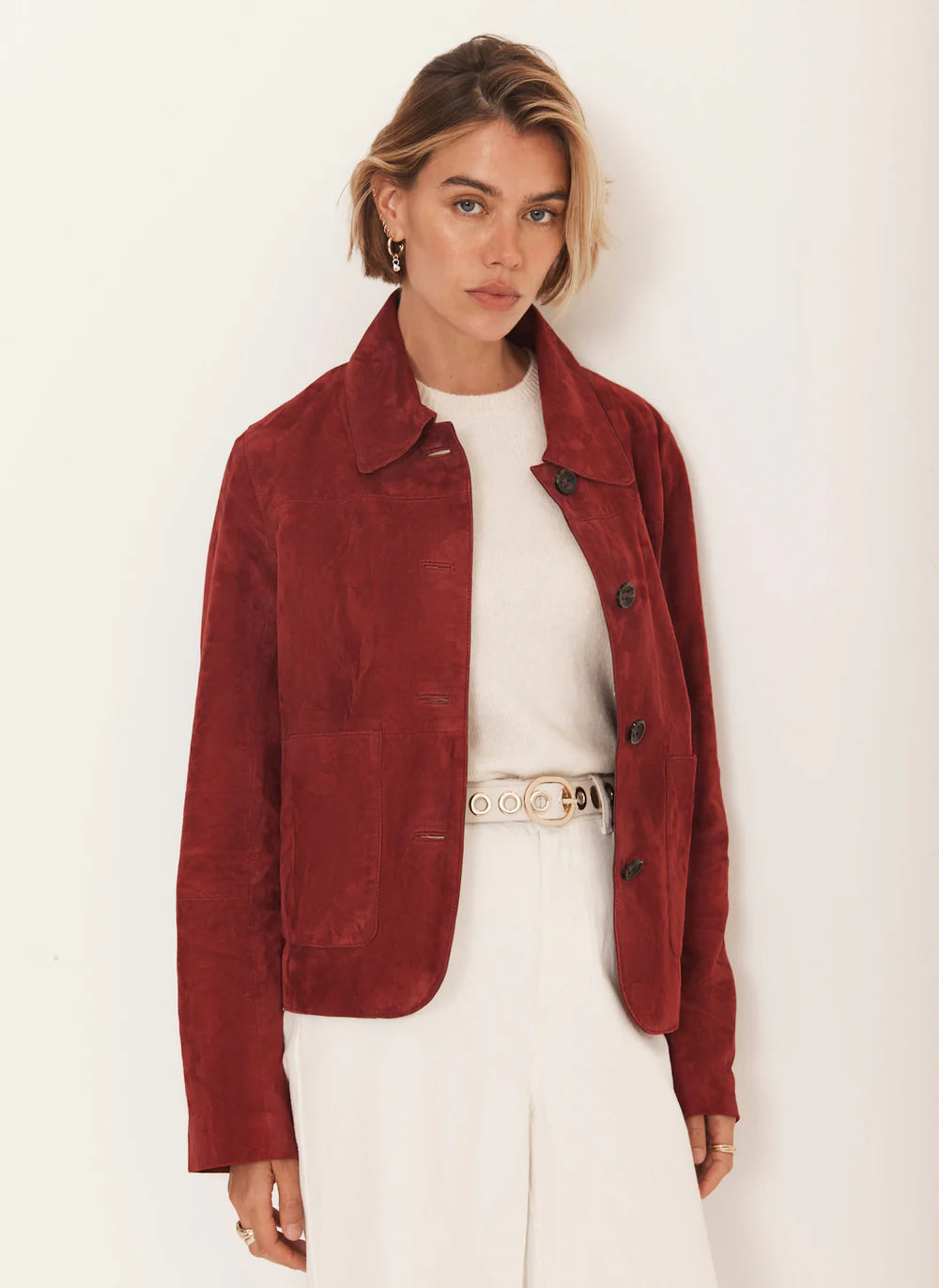 - Red tone suede jacket with a classic collar, long sleeves, square pockets with button fastenings through the front.