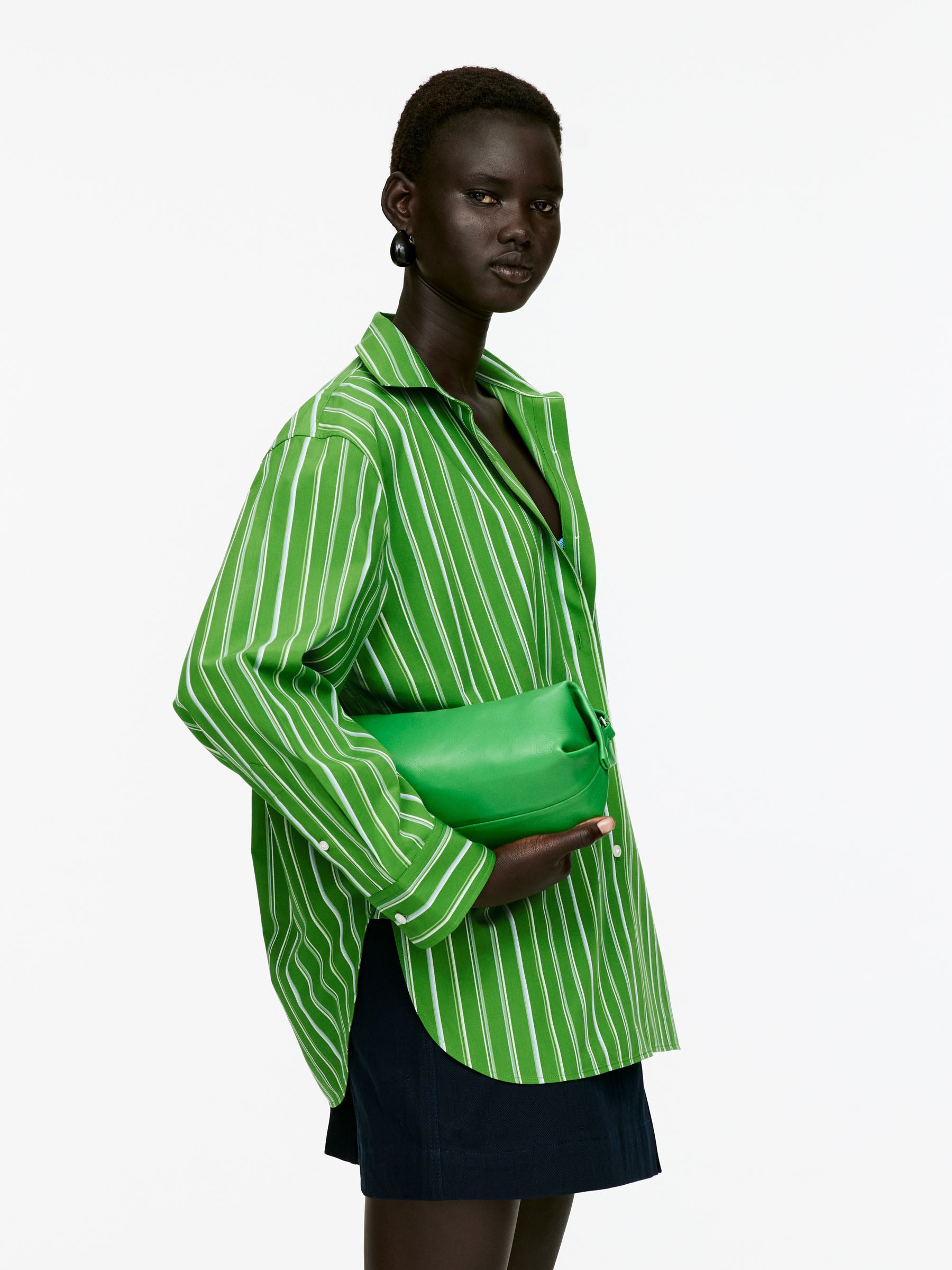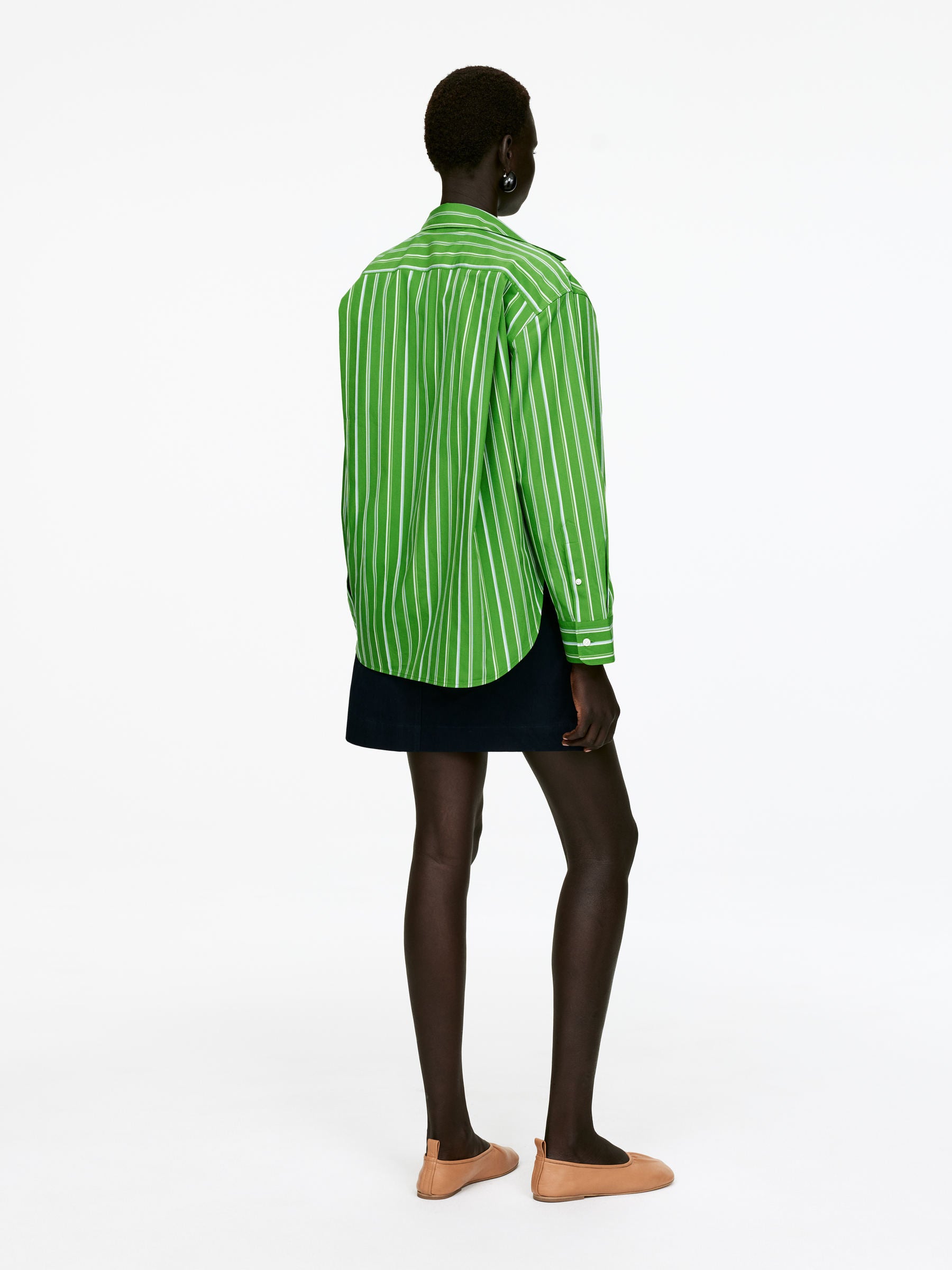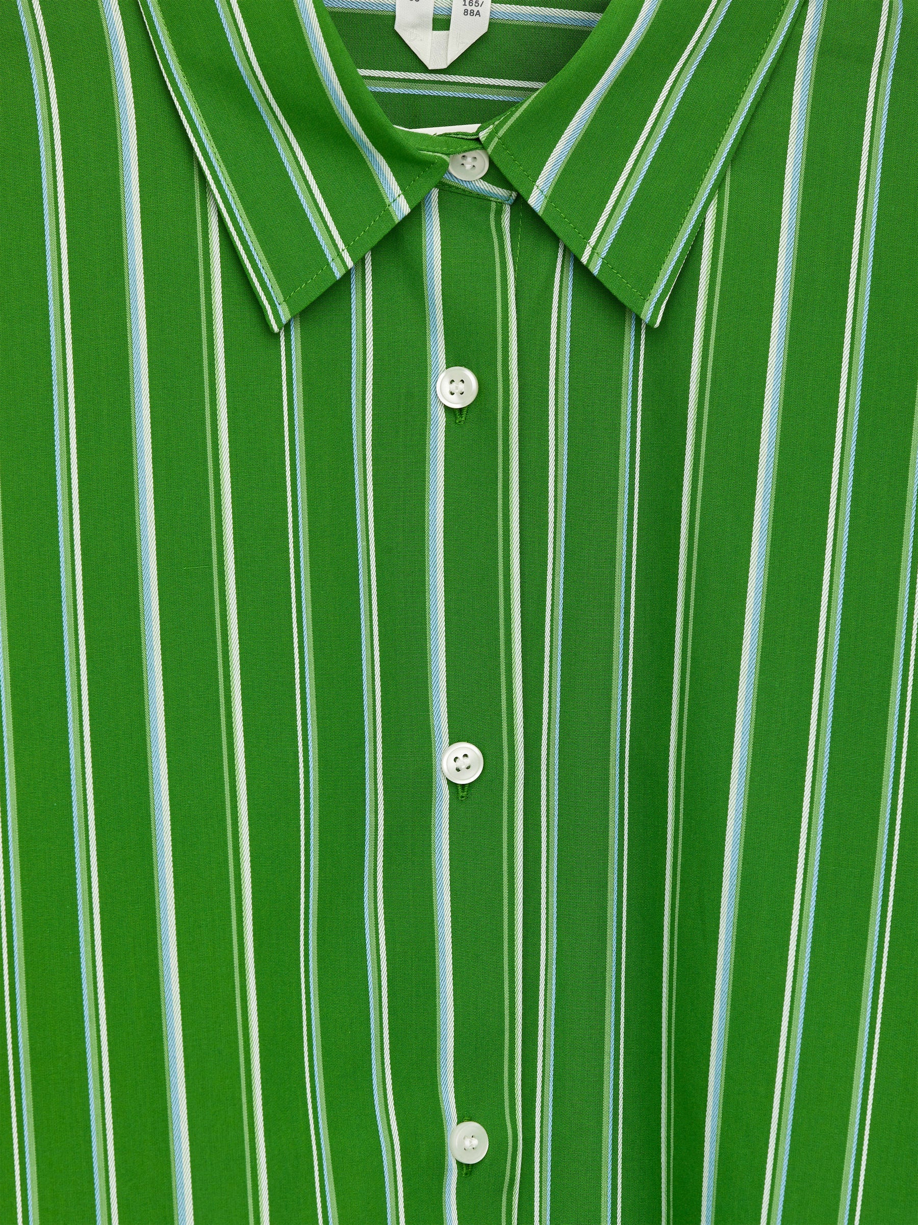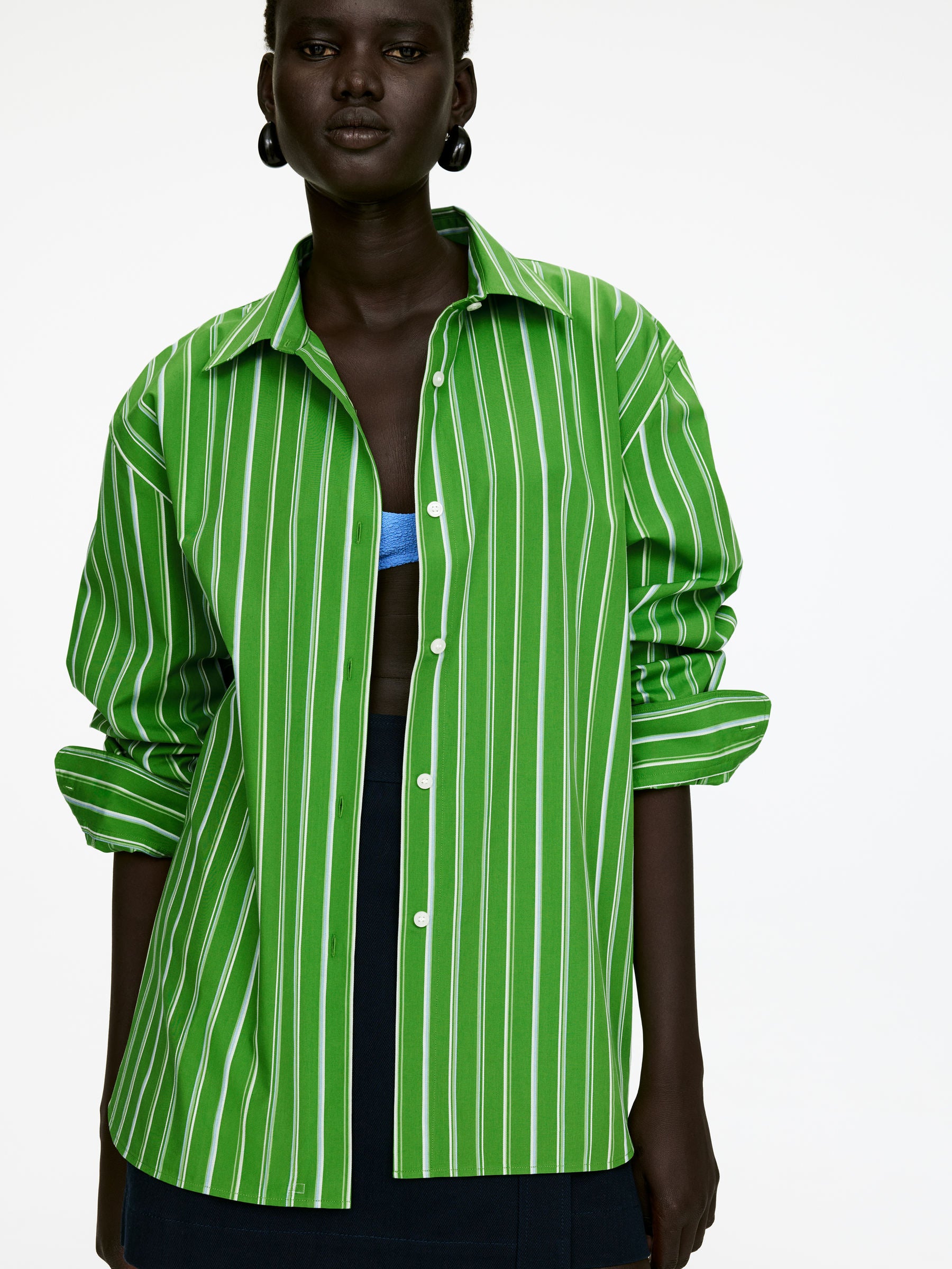 Shirt sewn from a crisp poplin weave made of cotton. This shirt features a pattern of yarn-dyed stripes. A long-sleeve style cut for a relaxed silhouette with slightly dropped shoulders.