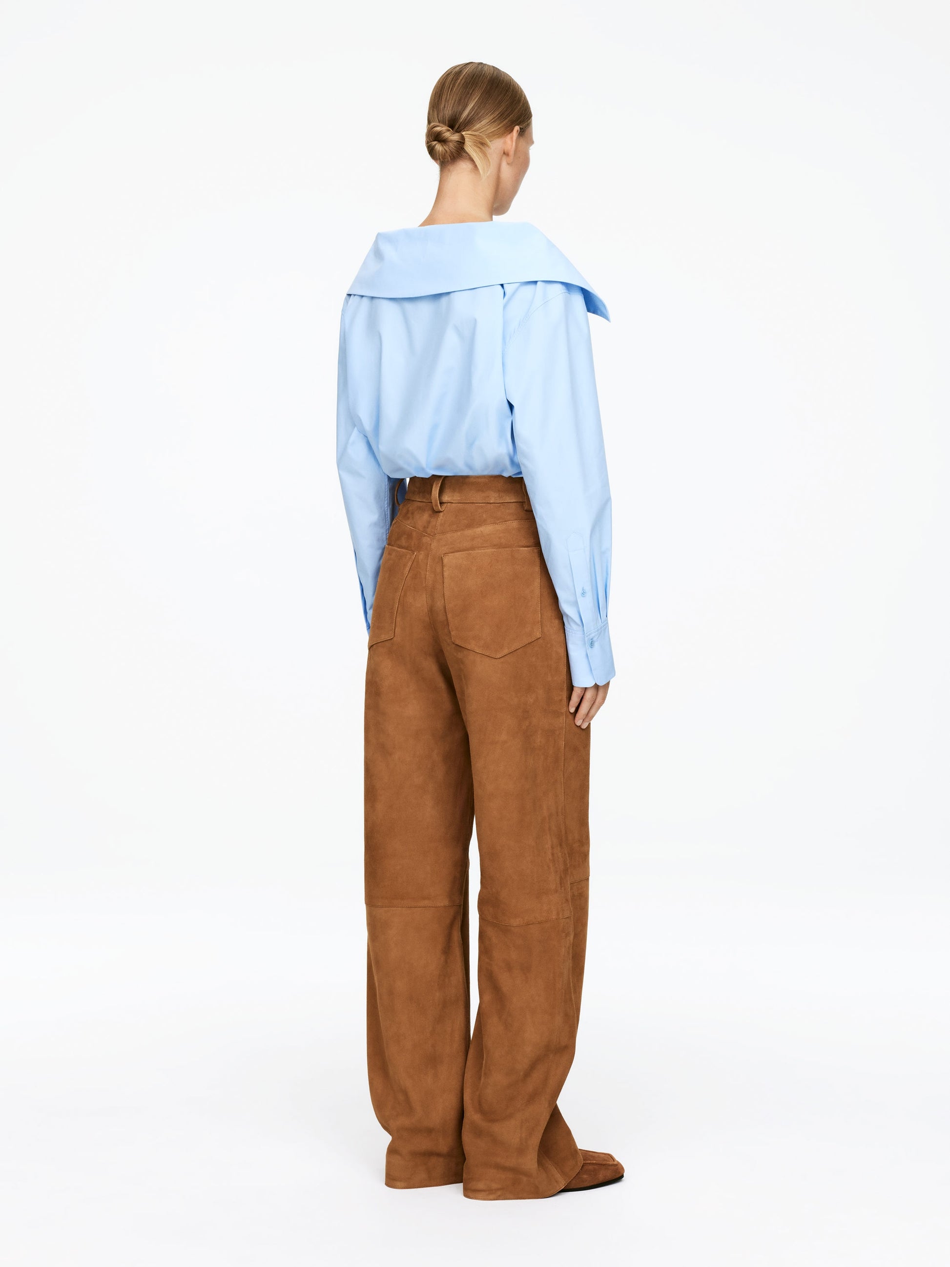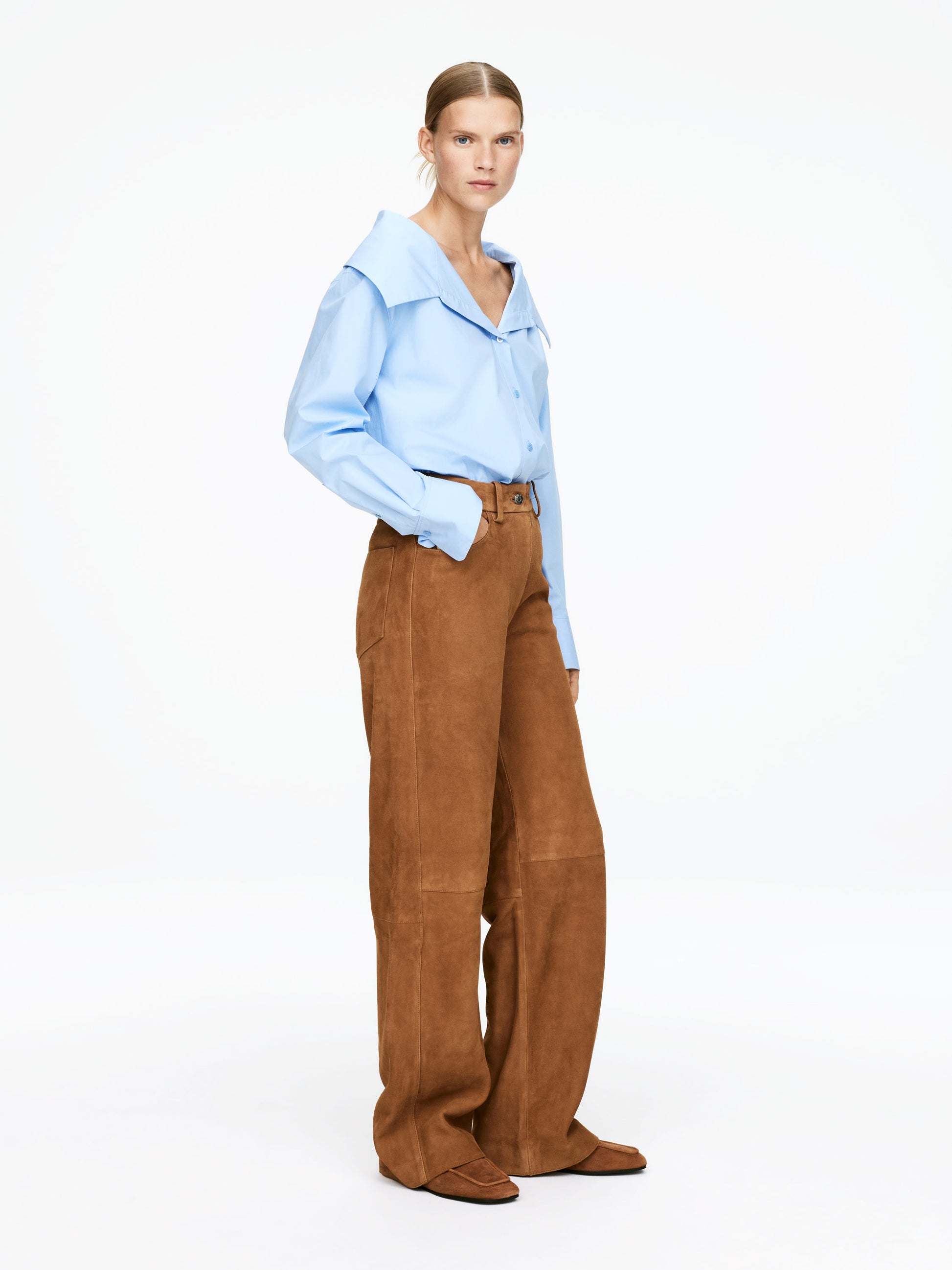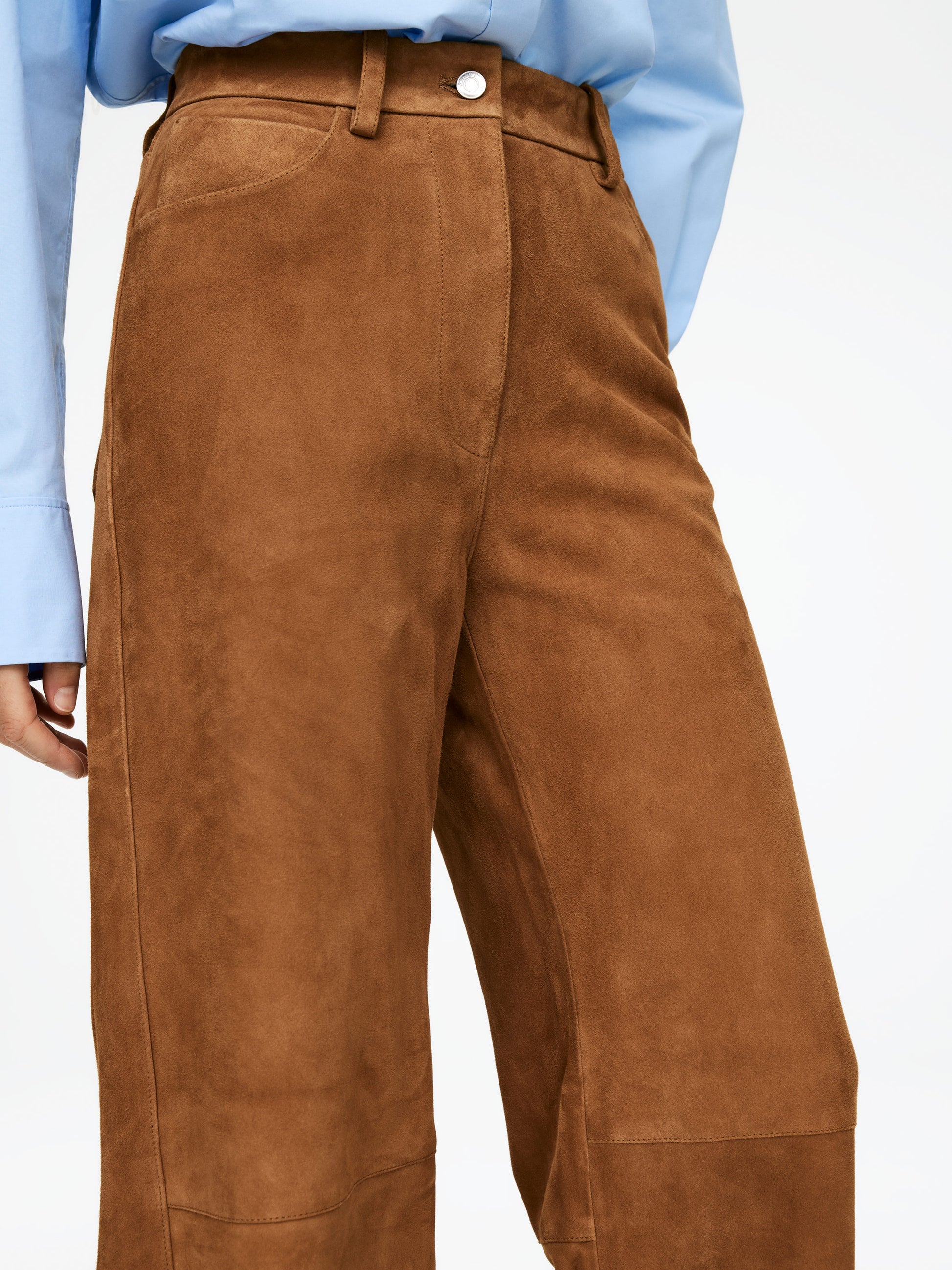 Relaxed trousers crafted from suede that has undergone a chrome-free tanning process. Featuring a high waist, slanted side pockets, and front pleats.
