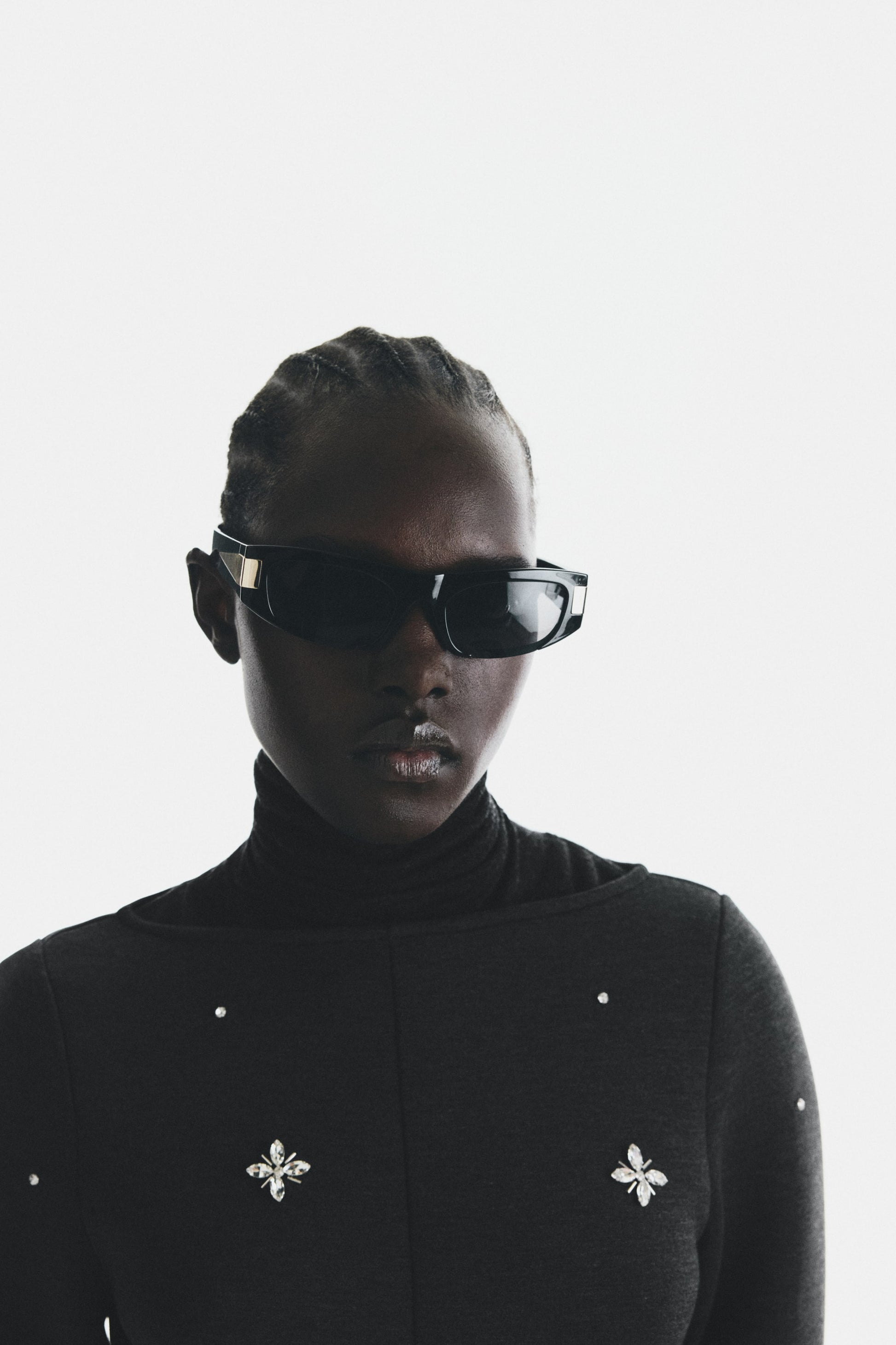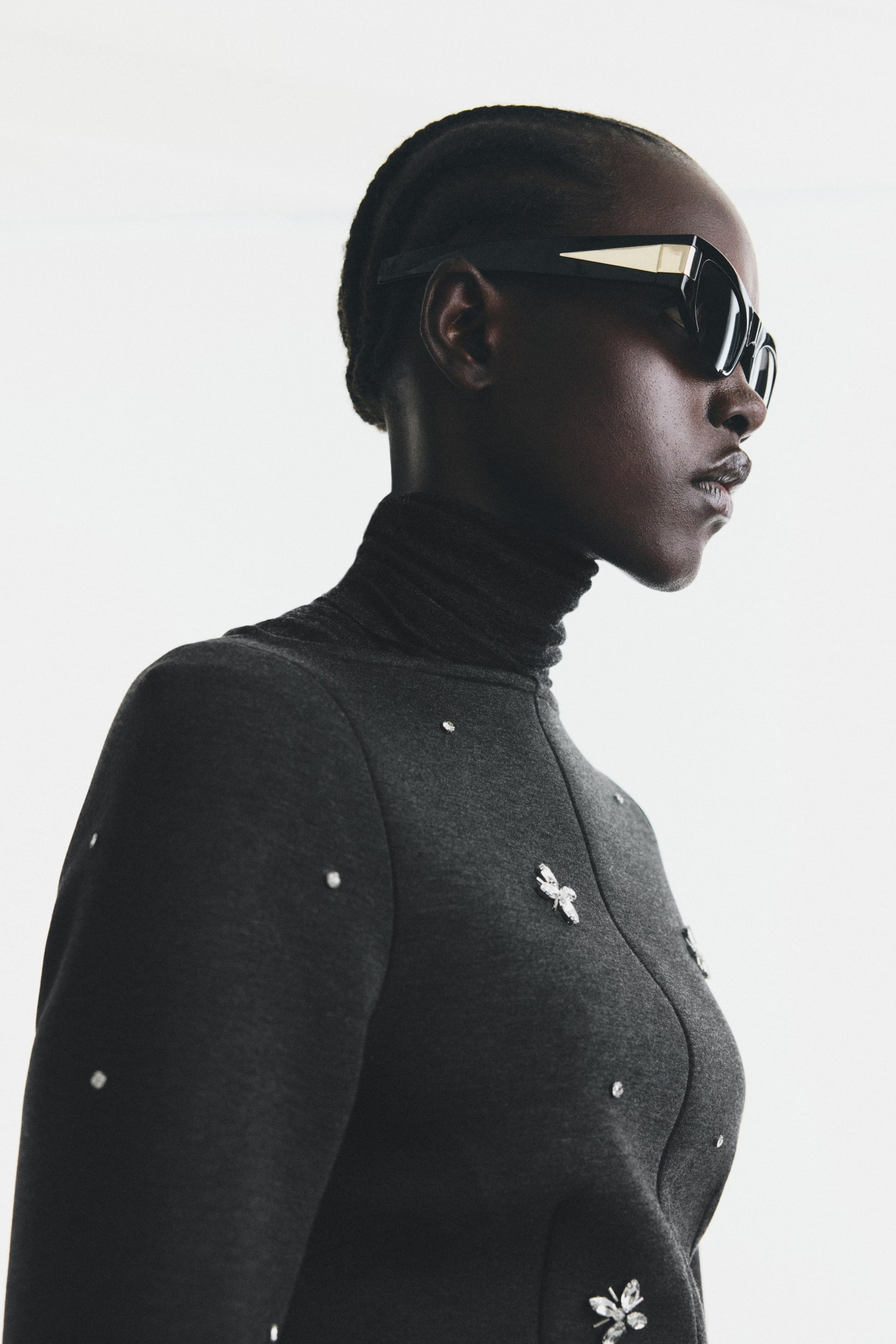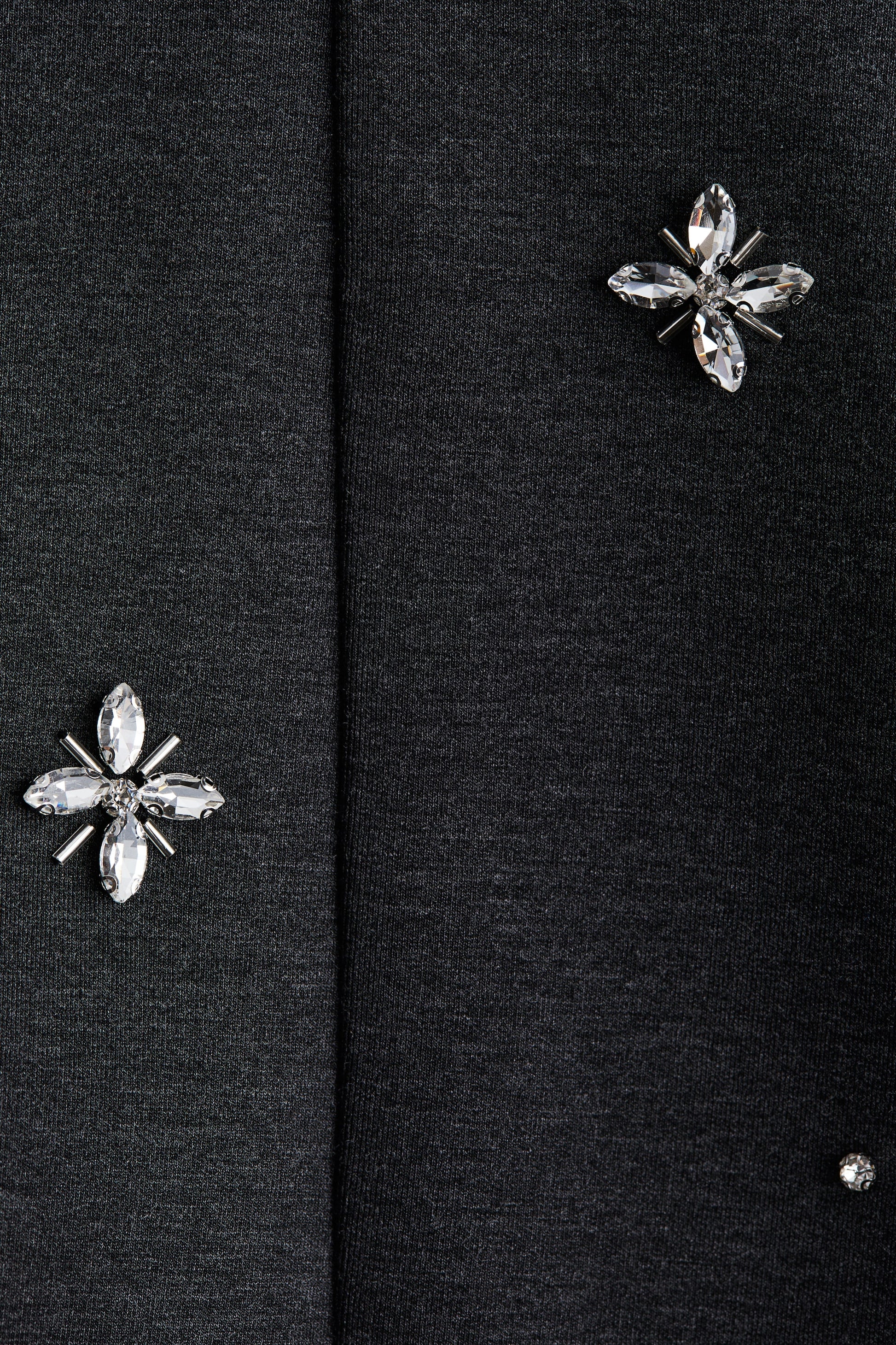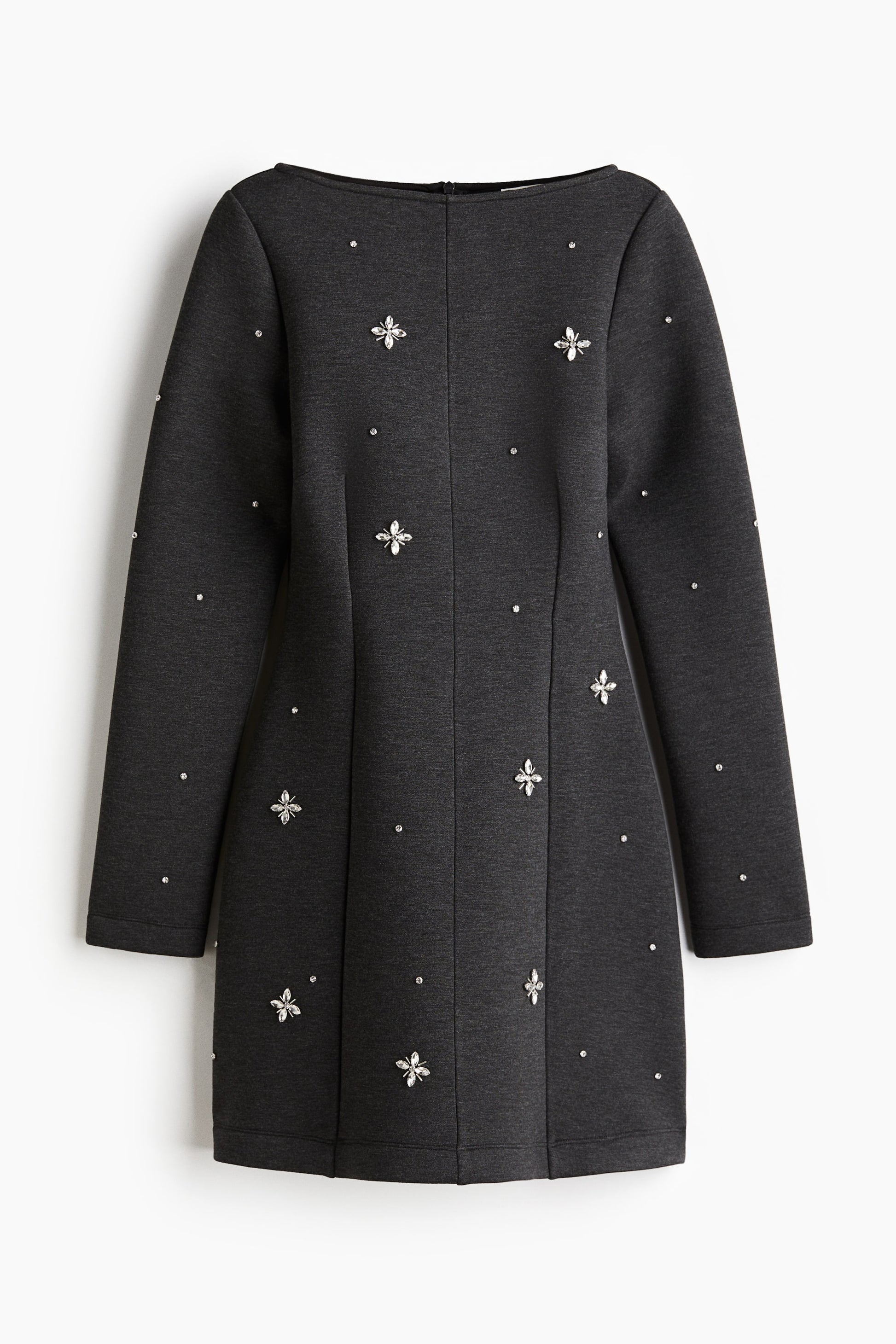 Fitted mini dress in scuba jersey embellished with sparkling rhinestones on the front and sleeves. Boat neckline, concealed zip at the back and long sleeves.