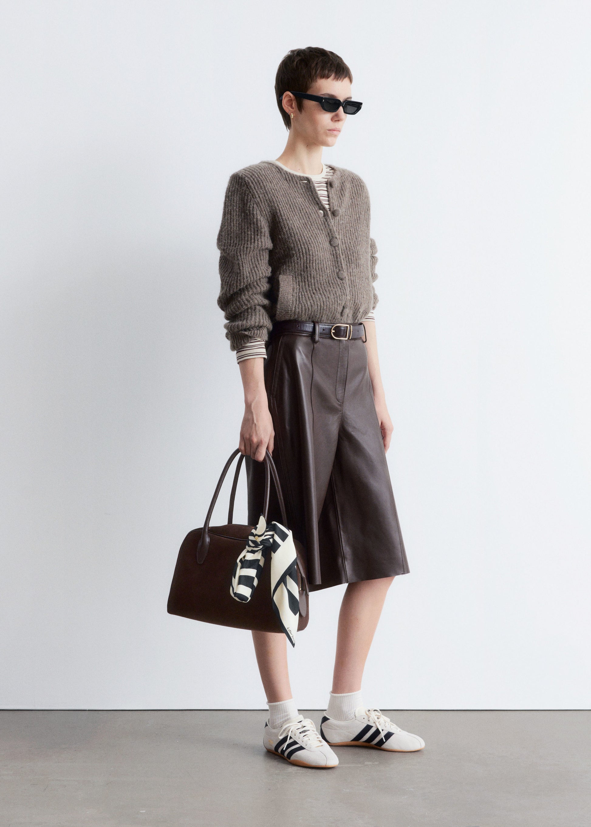 This cardigan is knitted from a soft blend of merino and alpaca wool in a ribbed finish. Cut in a boxy silhouette, it features a round neckline, long sleeves, and subtle front pockets. Light shoulder pads add gentle structure, while tonal knit-covered buttons create a clean, streamlined look. Layer over t-shirts and tanks.
