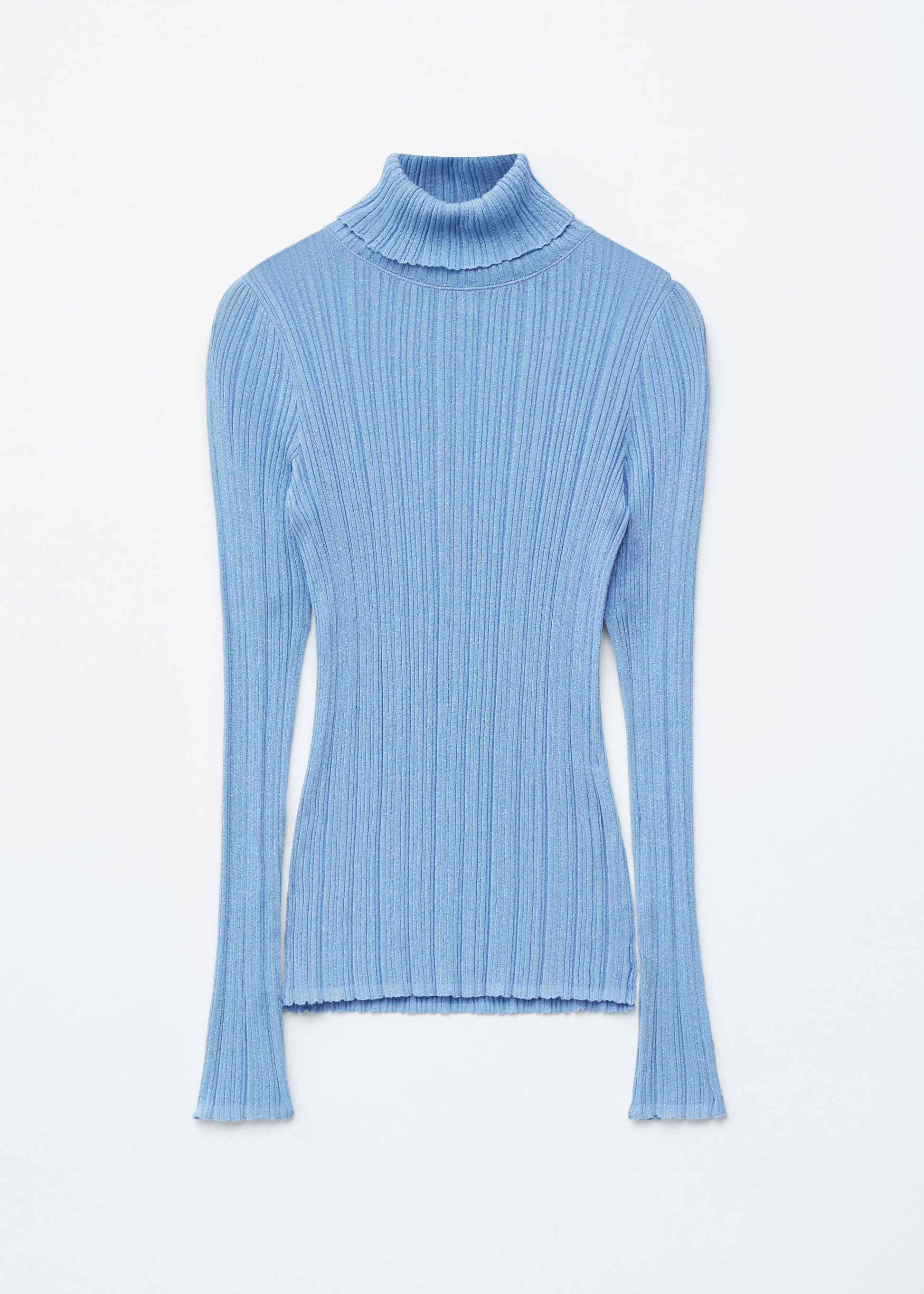Knitted from a thin, stretchy lurex fabric with a subtle metallic sheen. This slim-fit turtleneck features a finely ribbed texture, long sleeves, and a classic roll neck. Style it with denim or tailored separates.