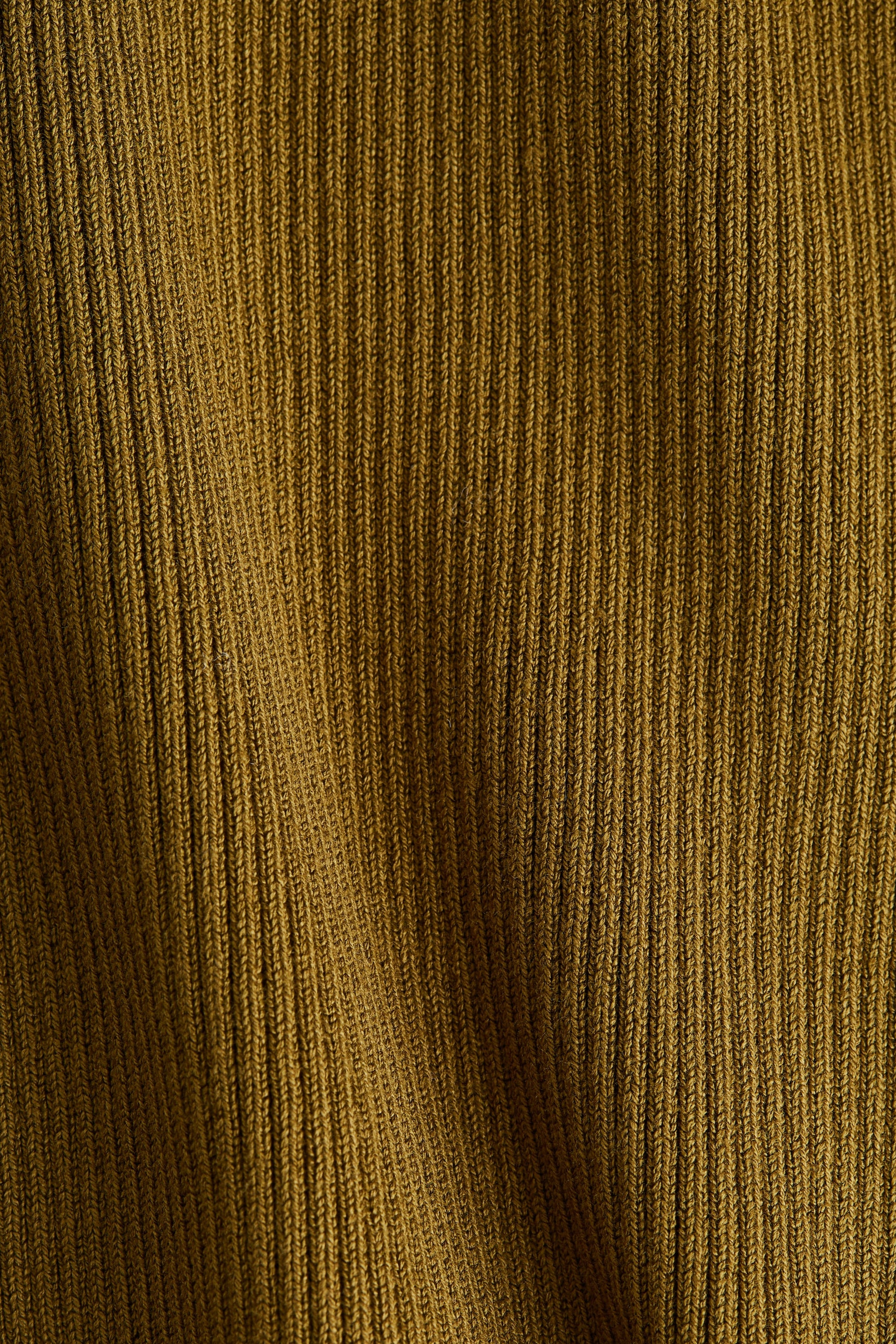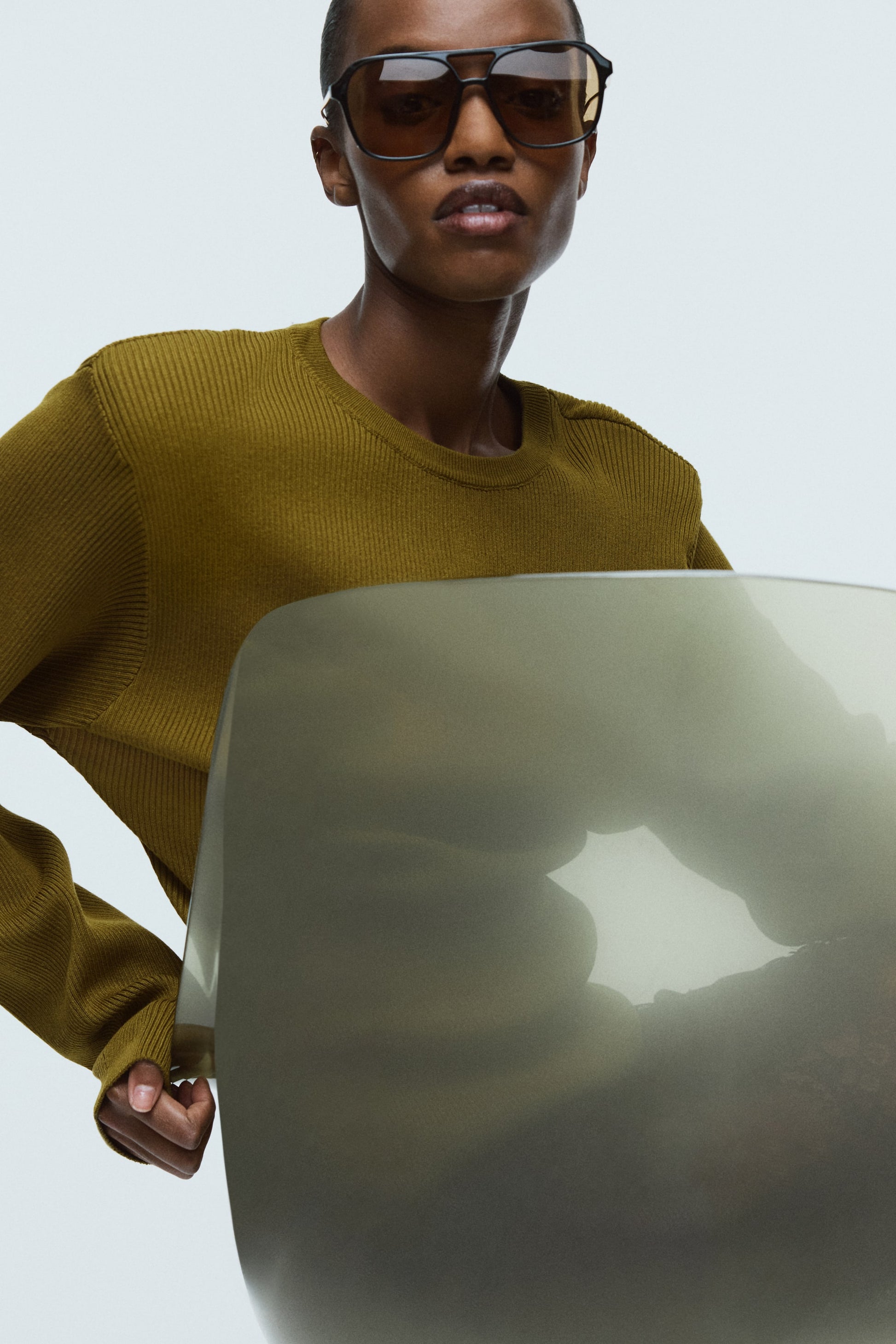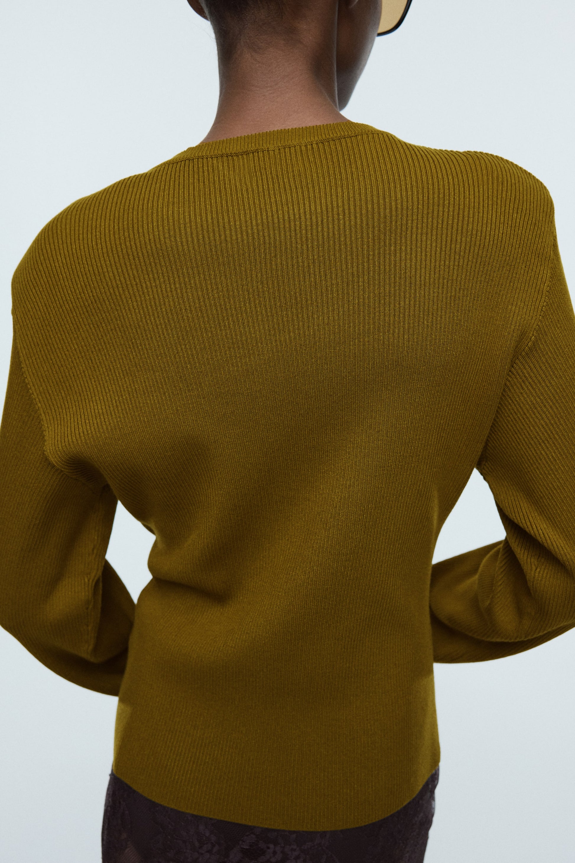 Fitted top in a rib knit with a round neckline, shoulder pads and long sleeves.