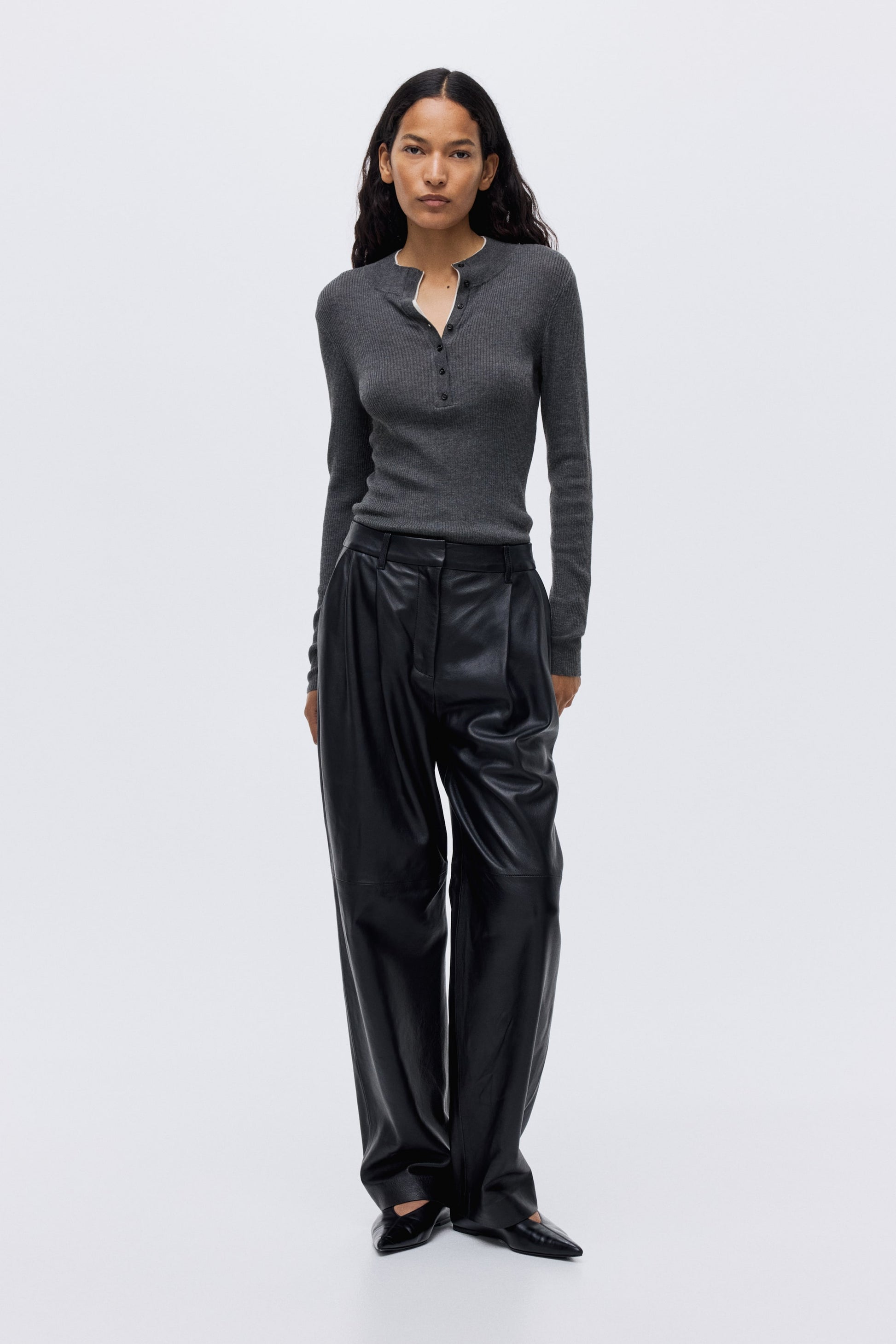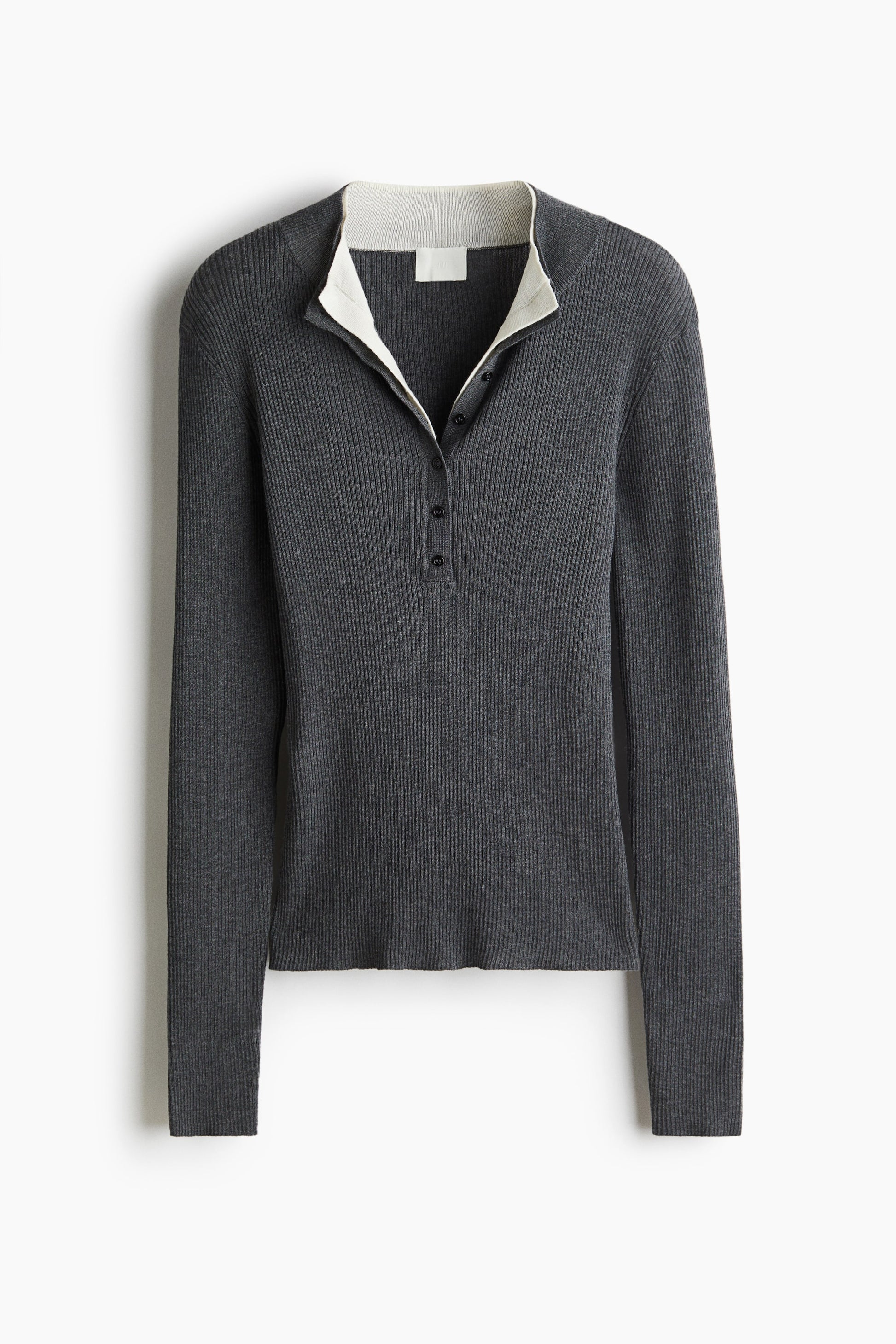 Fitted, long-sleeved top in a soft rib knit featuring a stand collar and a button placket, both with a loose lining in a contrasting colour that creates a layered look.