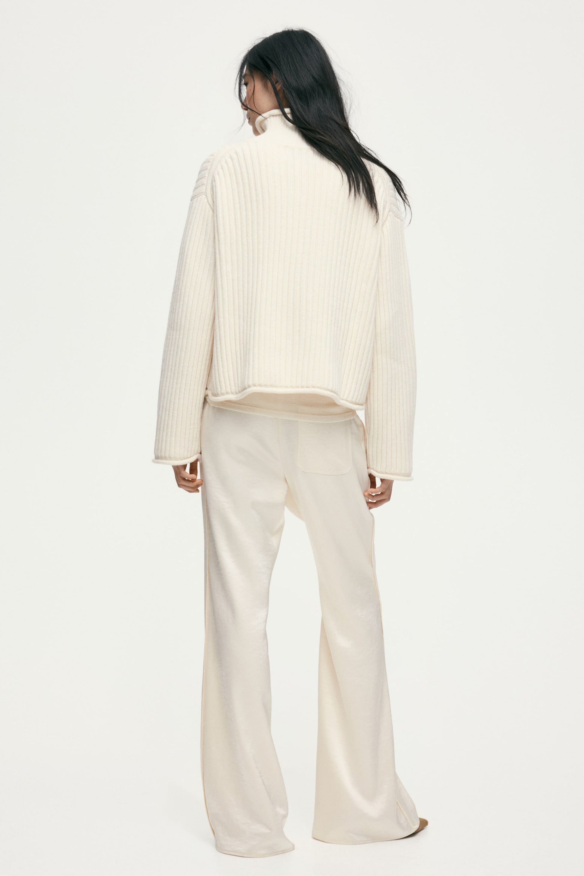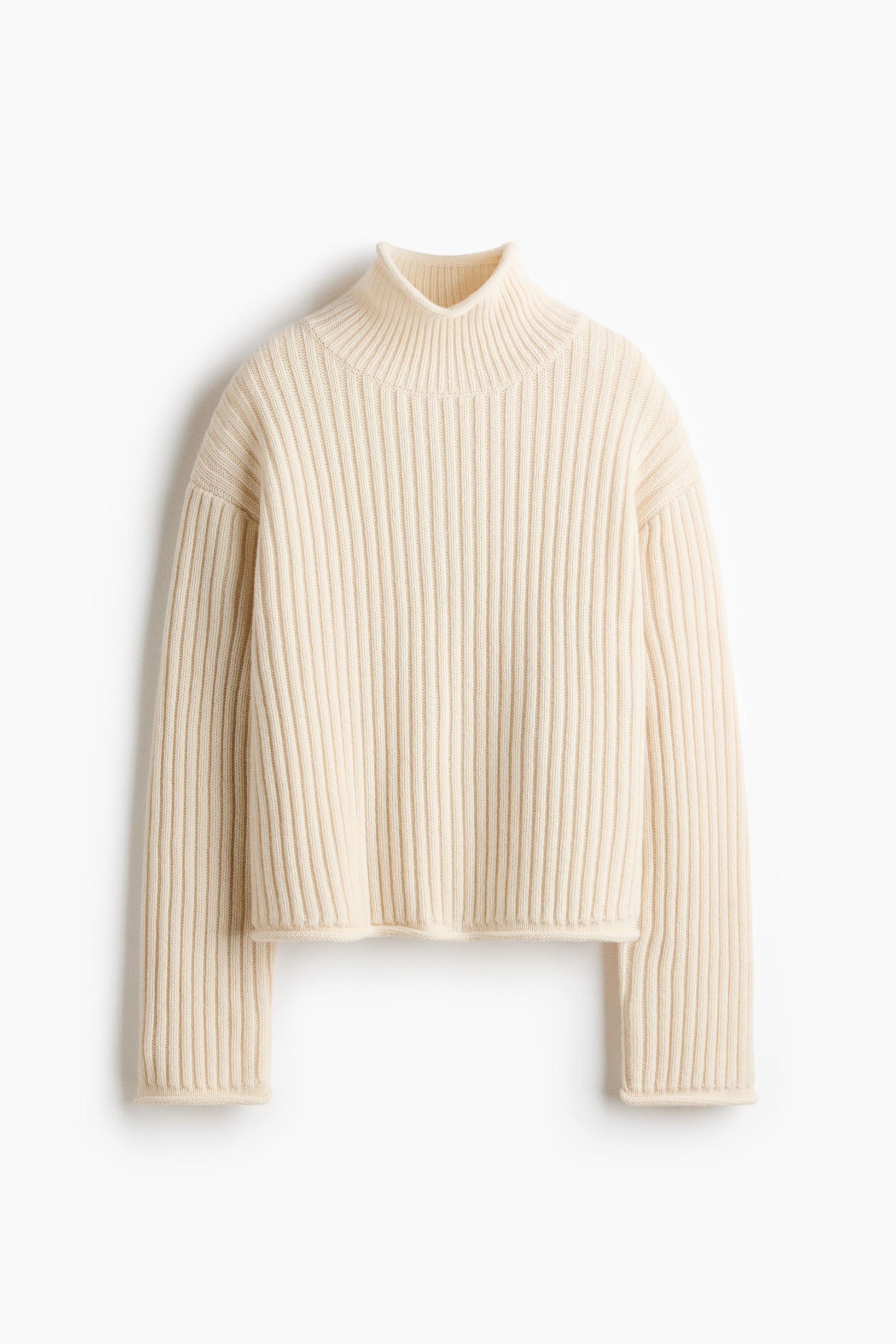 Loose-fit jumper in rib-knit wool with a high collar, dropped shoulders and long sleeves. Roll edges around the collar, cuffs and hem.