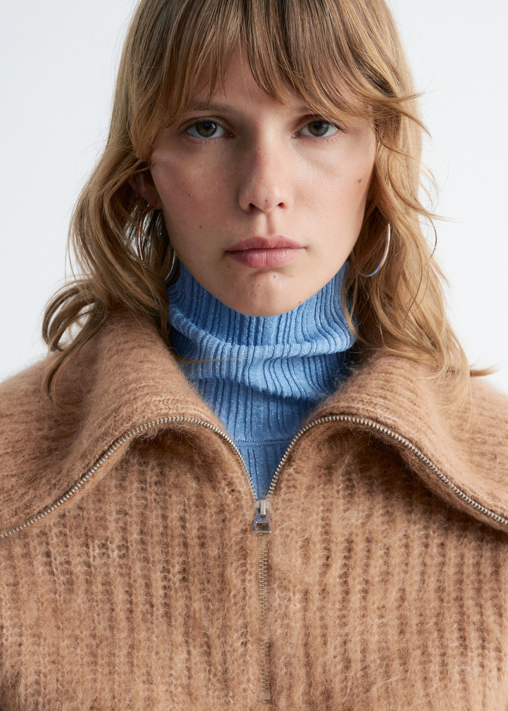 This sweater is knitted from a wool-mohair blend with a ribbed, brushed texture. Cut in a loose silhouette, it features a large zip-up collar that can be folded down and a ribbed hem that sits at the waist.