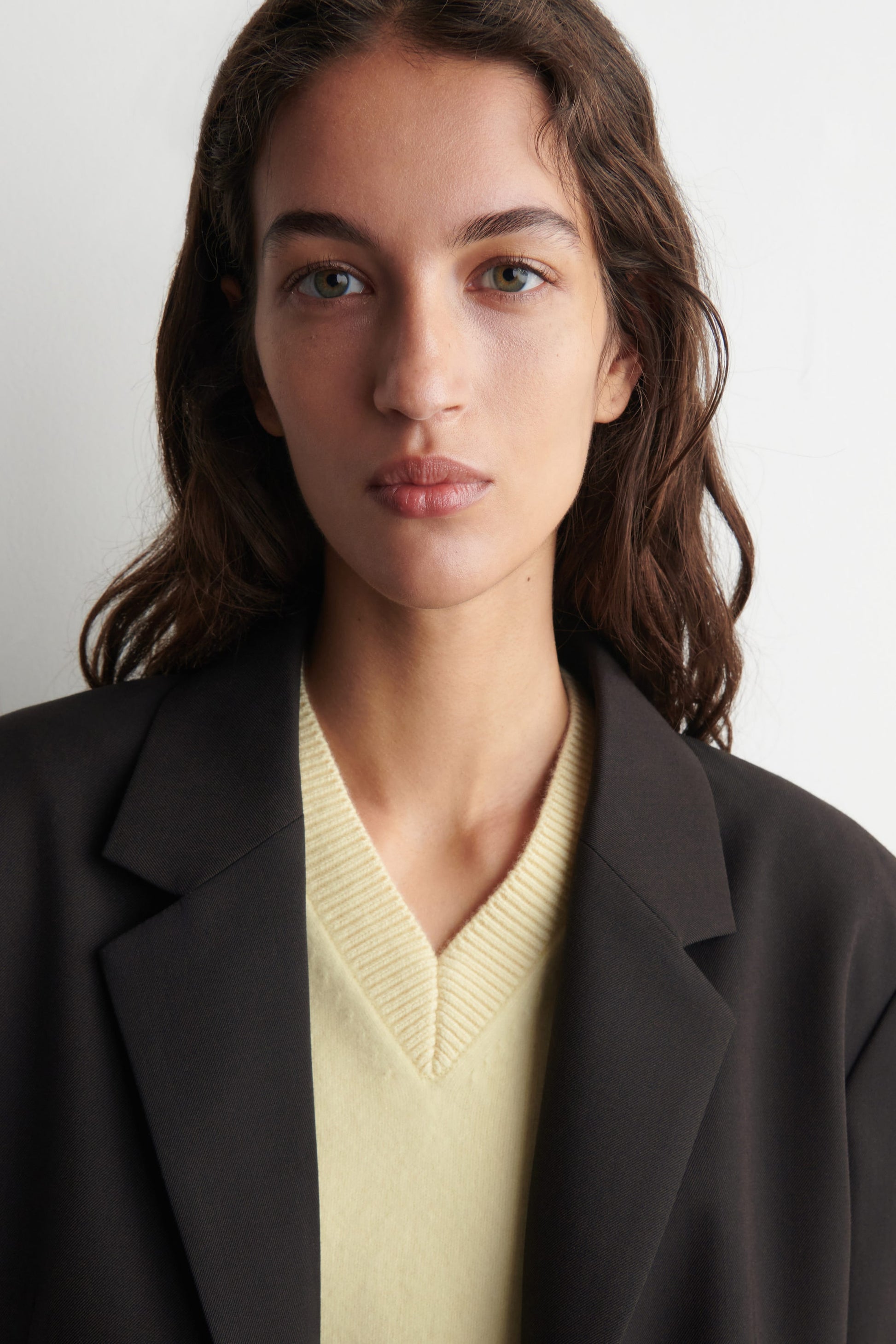 Sculptural in shape, this butter-yellow jumper is knitted from an RWS wool blend that's double-faced for a premium hand feel. It's cut in a V-neck silhouette and has ribbed trims and rounded, curved sleeves.