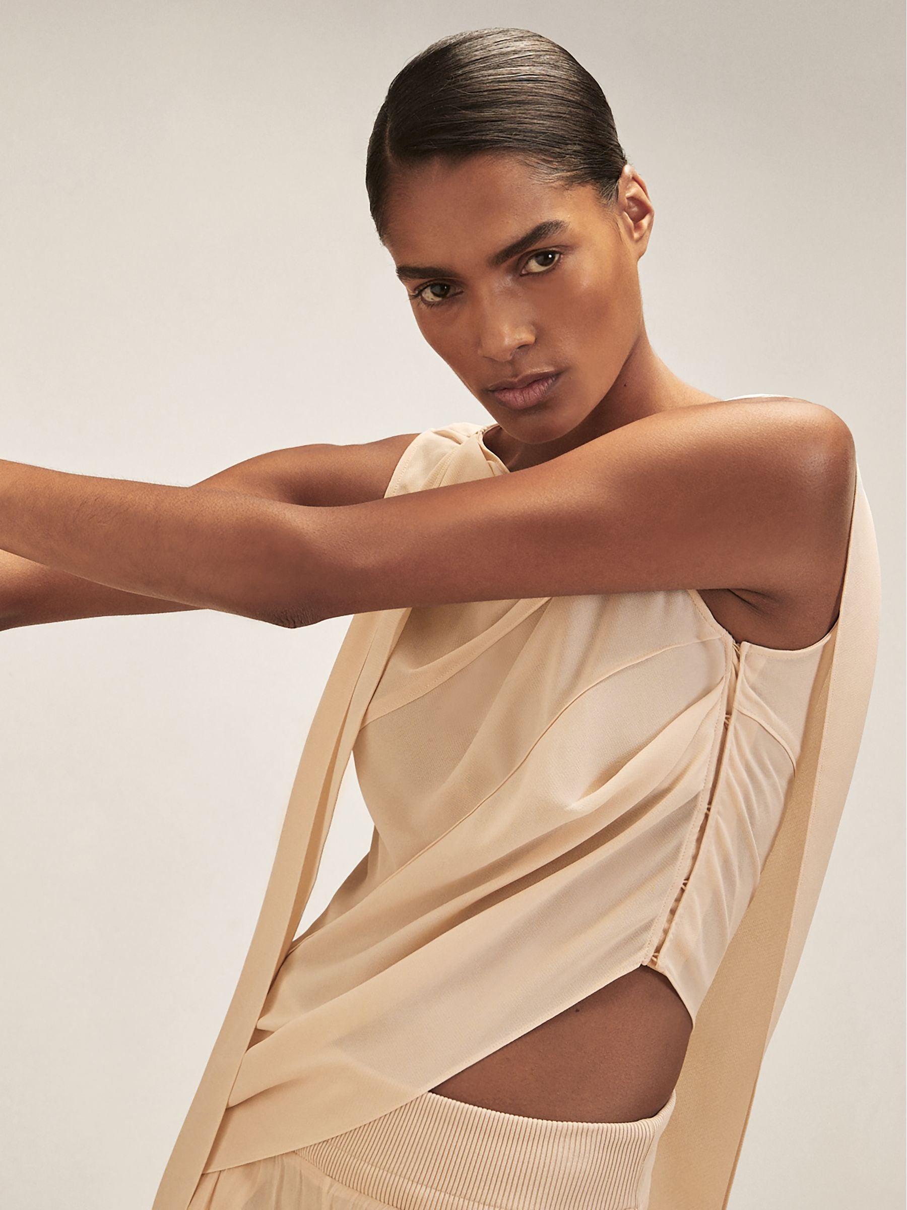 Swathes of crepe chiffon wrap asymmetrically around the body, lending the Misa top a drapey, semi-sheer silhouette.Concealed side buttons and long sashes that trail below the hem enhance its graceful movement and understated elegance. Crepe chiffon Asymmetric panels Concealed side buttons The Reiss x Royal Ballet collection draws inspiration from the artistry, grace, and costumes of The Royal Ballet, with 10% of sales being donated to the Royal Opera House and Covent Garden Foundation (Charity Number 211775). The model is wearing a size 8 Measurements of model Height 5ft 10' 177.8cm.