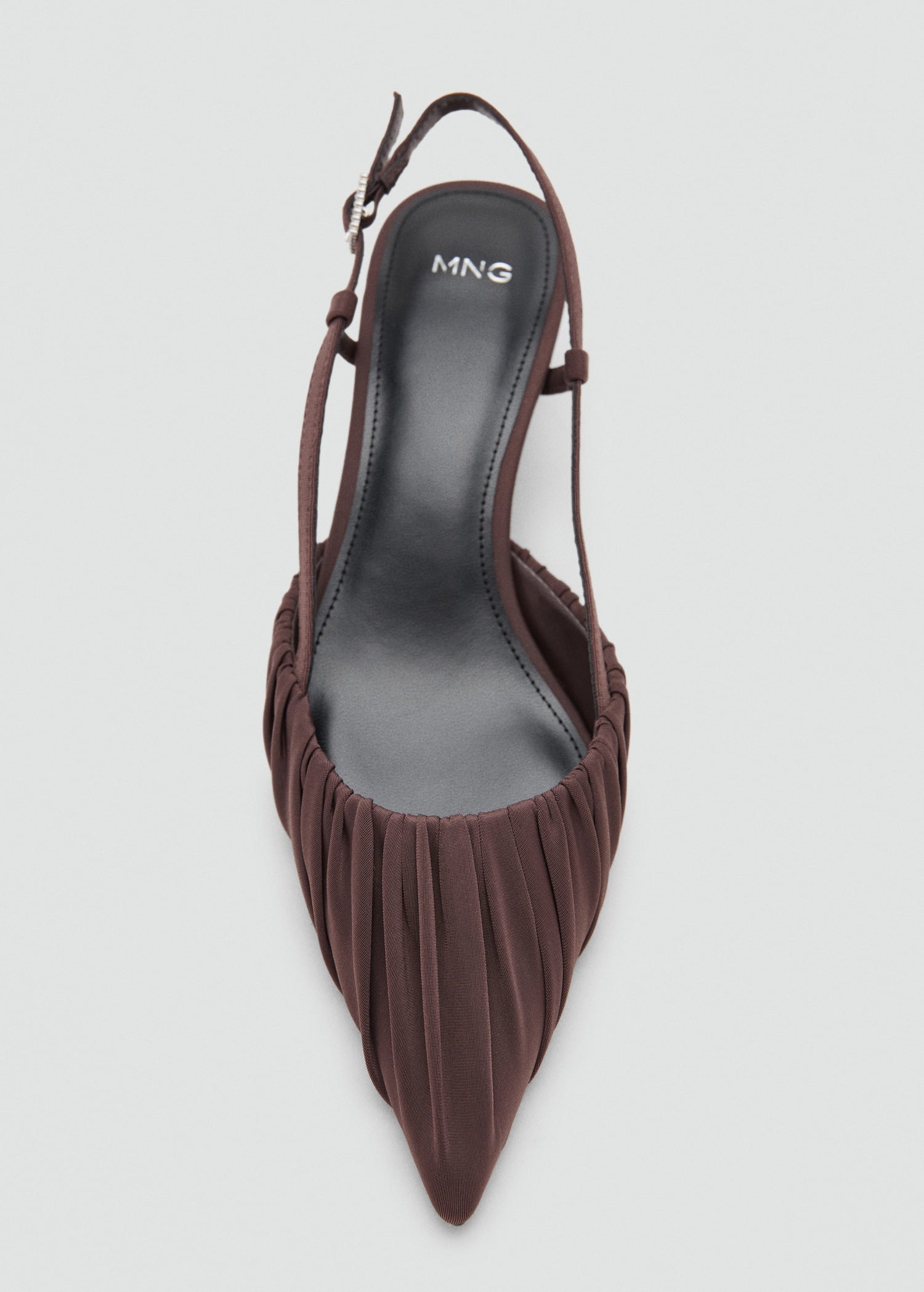 Ruched fabric. Pointed. Kitten heel. Buckle closure at the ankle. 5 cm heel.
