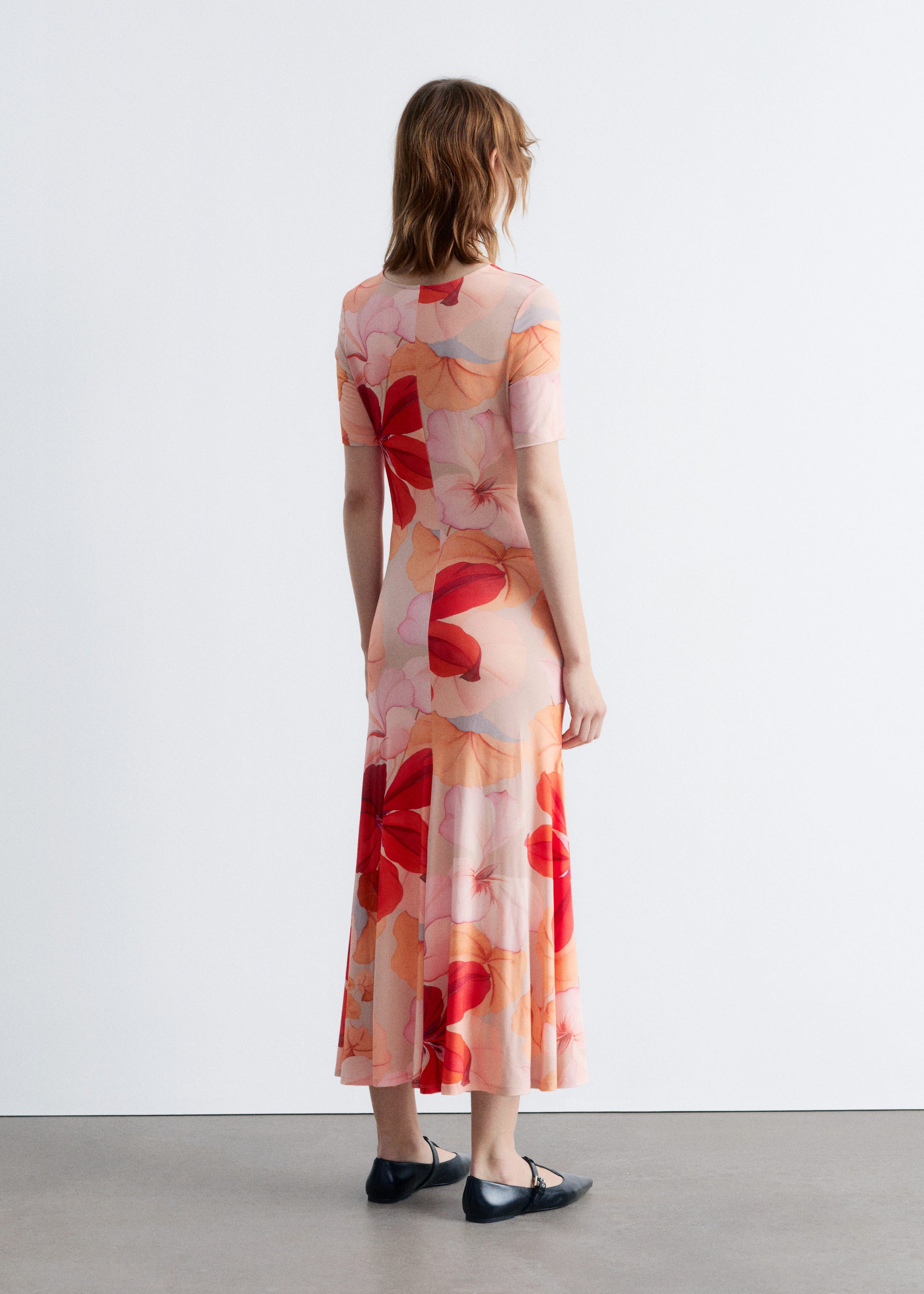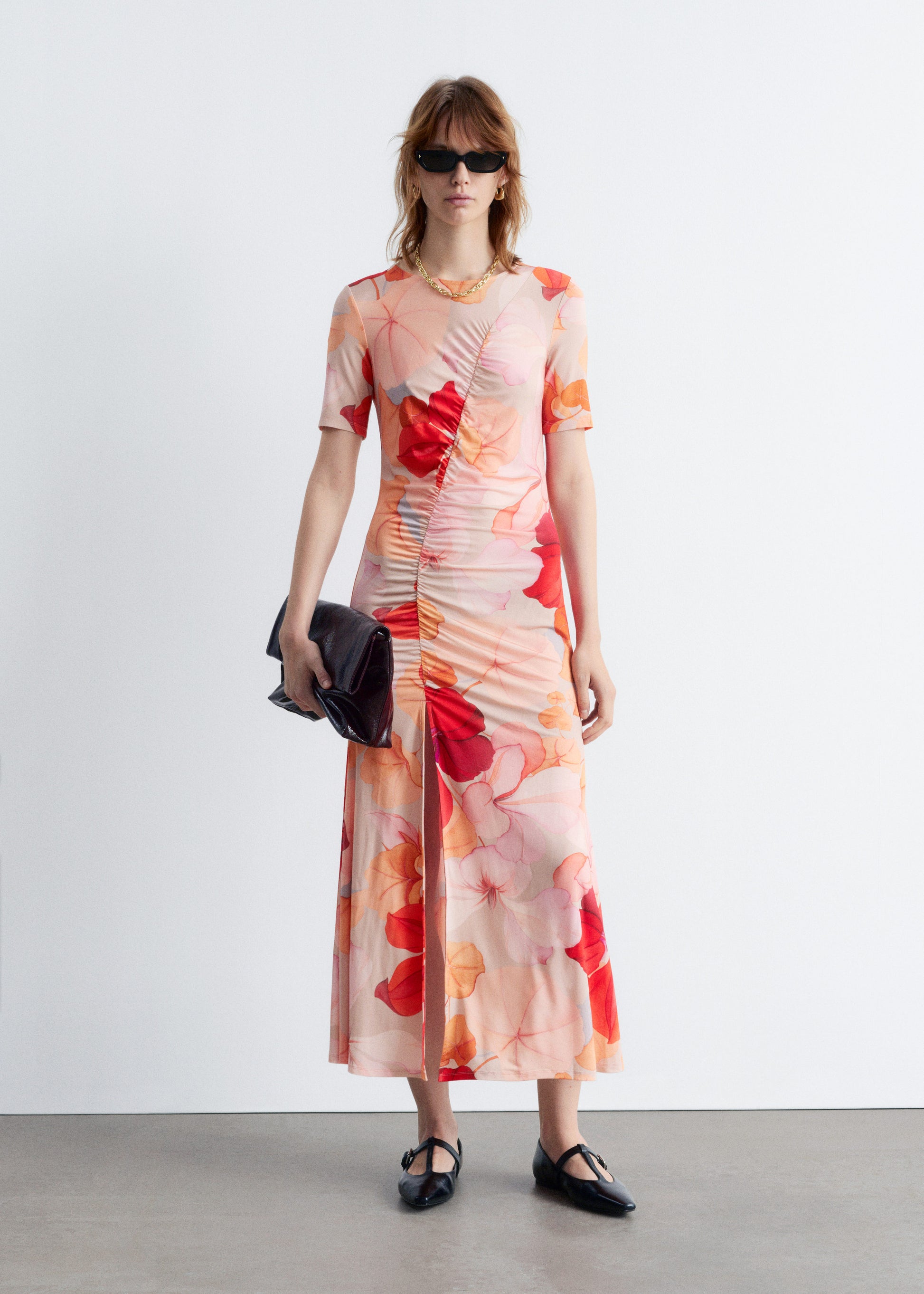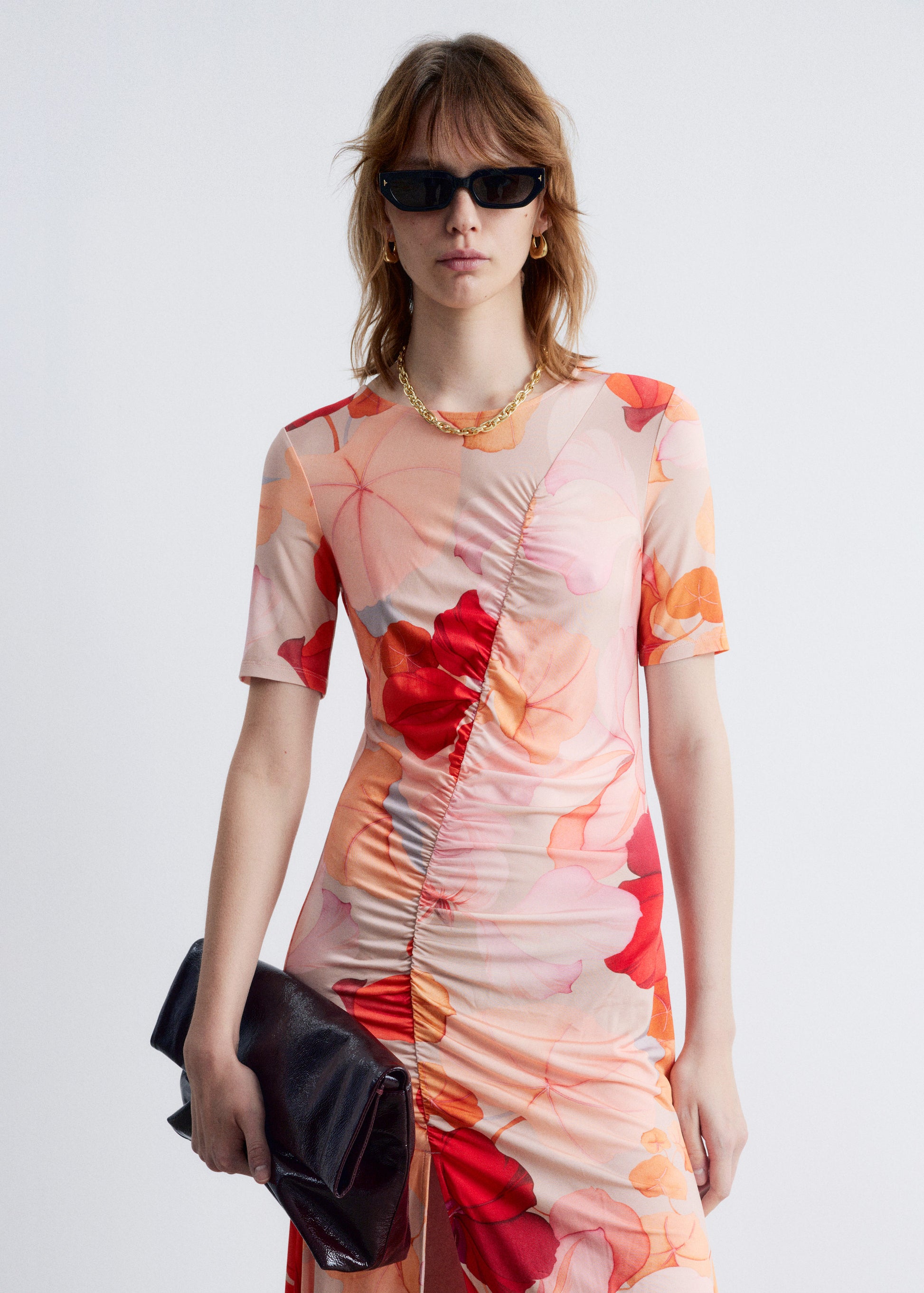 This midi dress is knitted from a lightweight fabric with a soft drape and all-over abstract floral print in tonal shades of peach, blush, and crimson. Designed with short sleeves and a close-fitting silhouette that shapes into a flared skirt accented by a front slit. It features side-gathered ruching that runs diagonally across the body, creating soft texture and subtle asymmetry. Pair with minimalist flats or leather sandals.