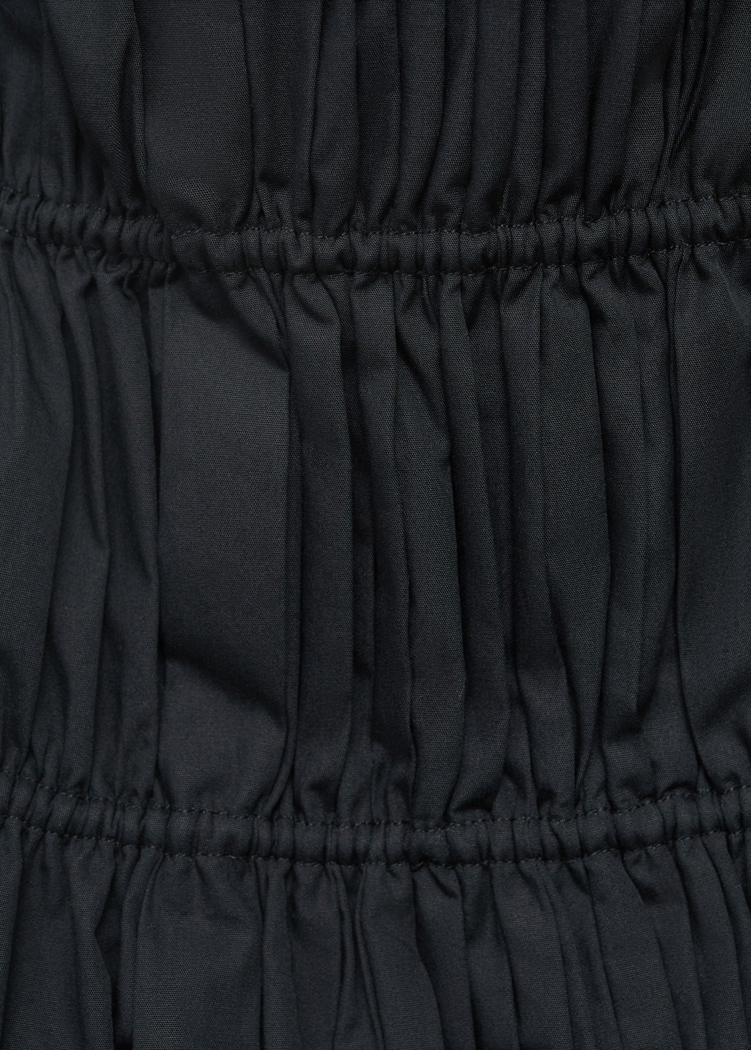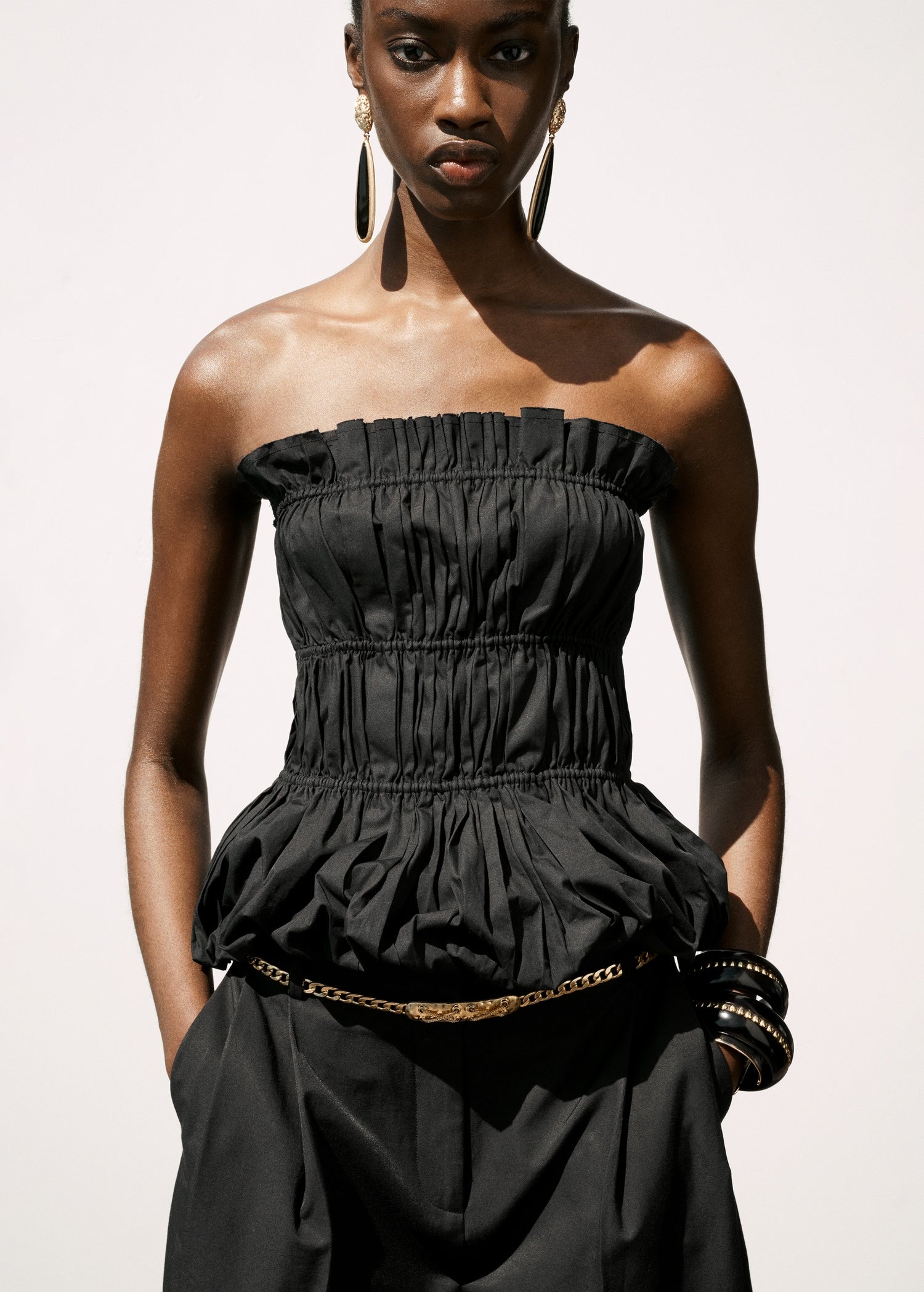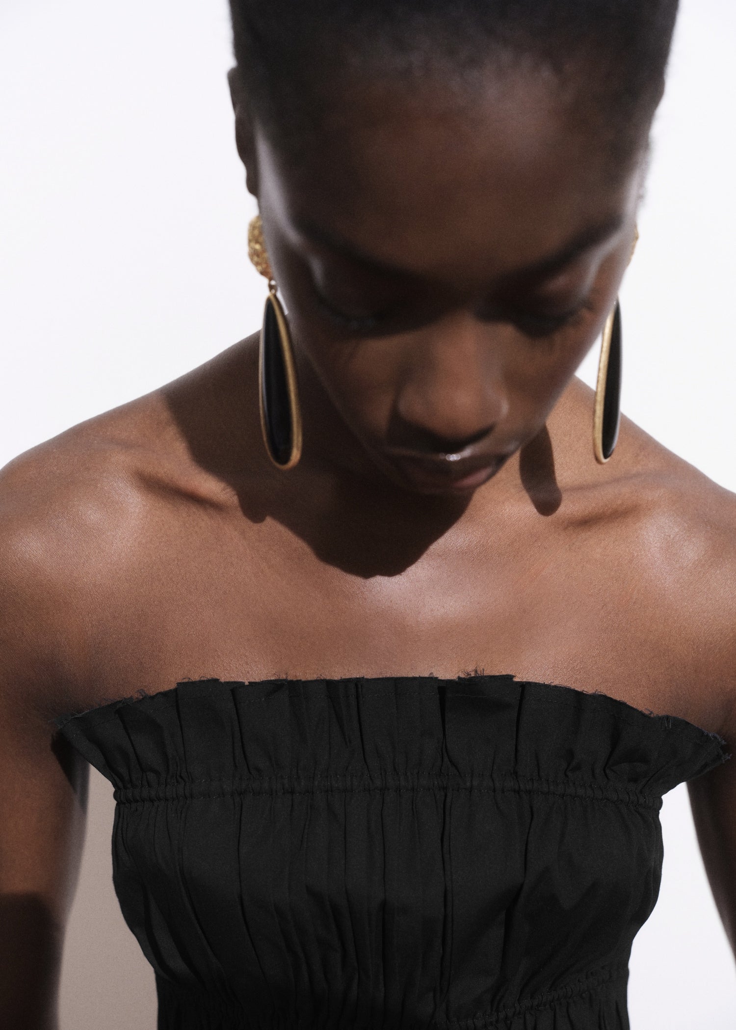 100% cotton fabric. Ruched body. Strapless. Sleeveless. Bubble hem. Zip fastening on the back section. Inner lining.