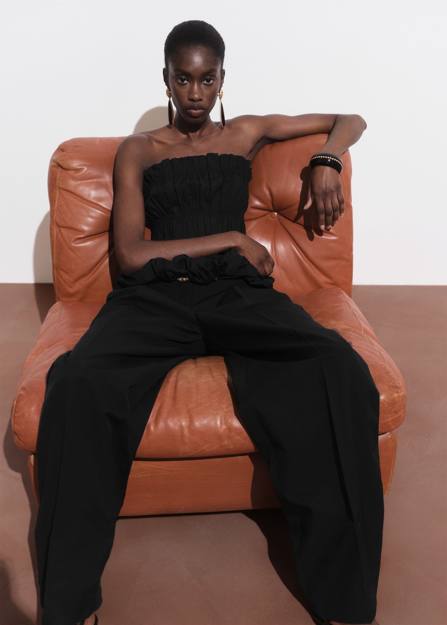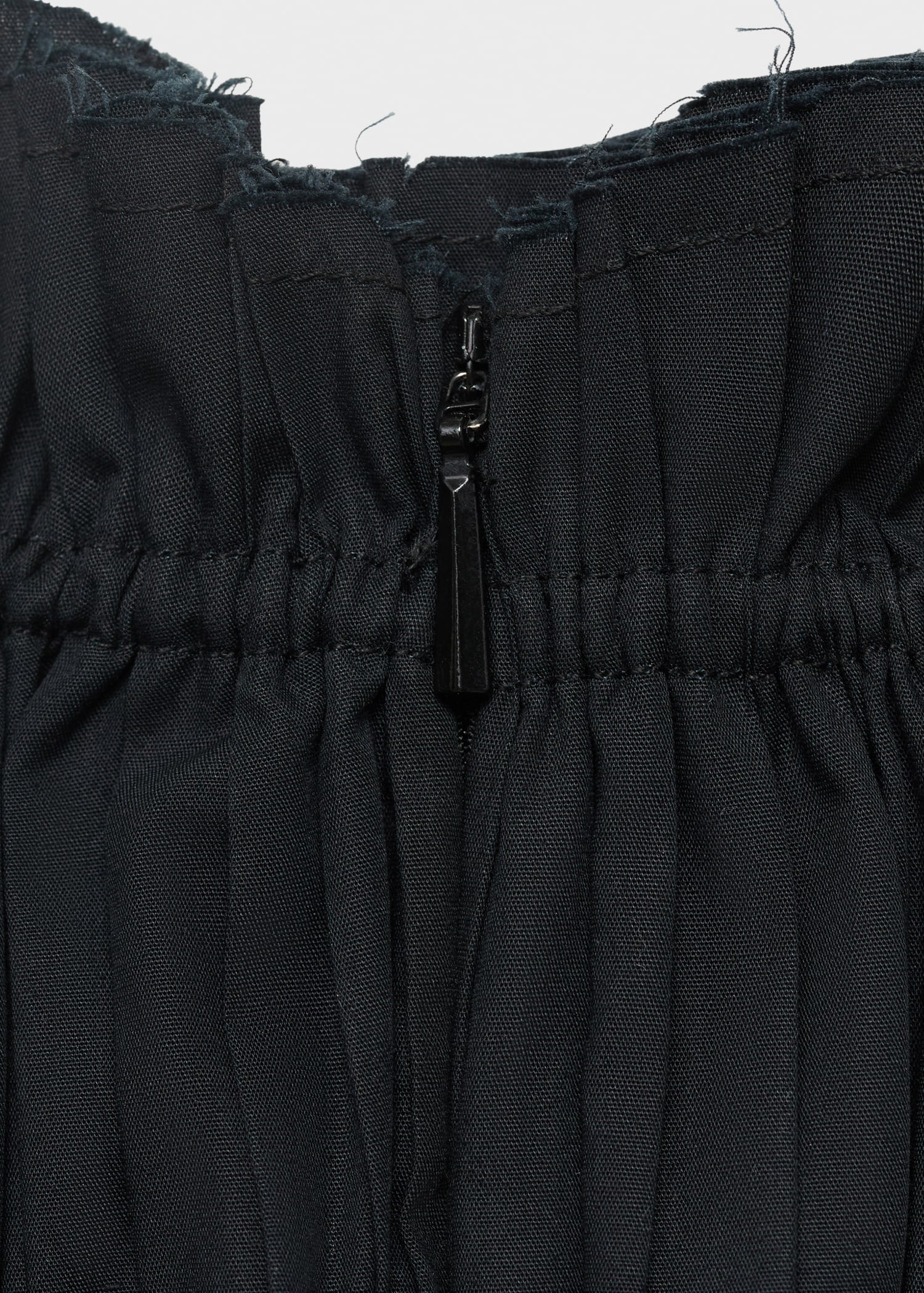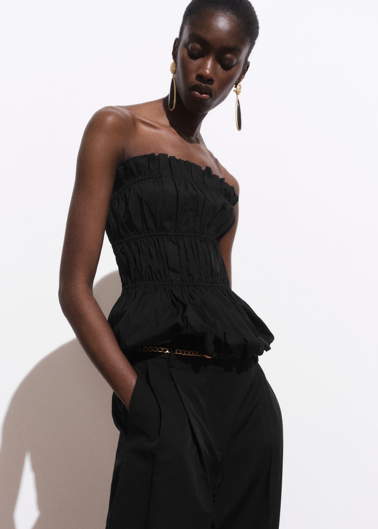 100% cotton fabric. Ruched body. Strapless. Sleeveless. Bubble hem. Zip fastening on the back section. Inner lining.