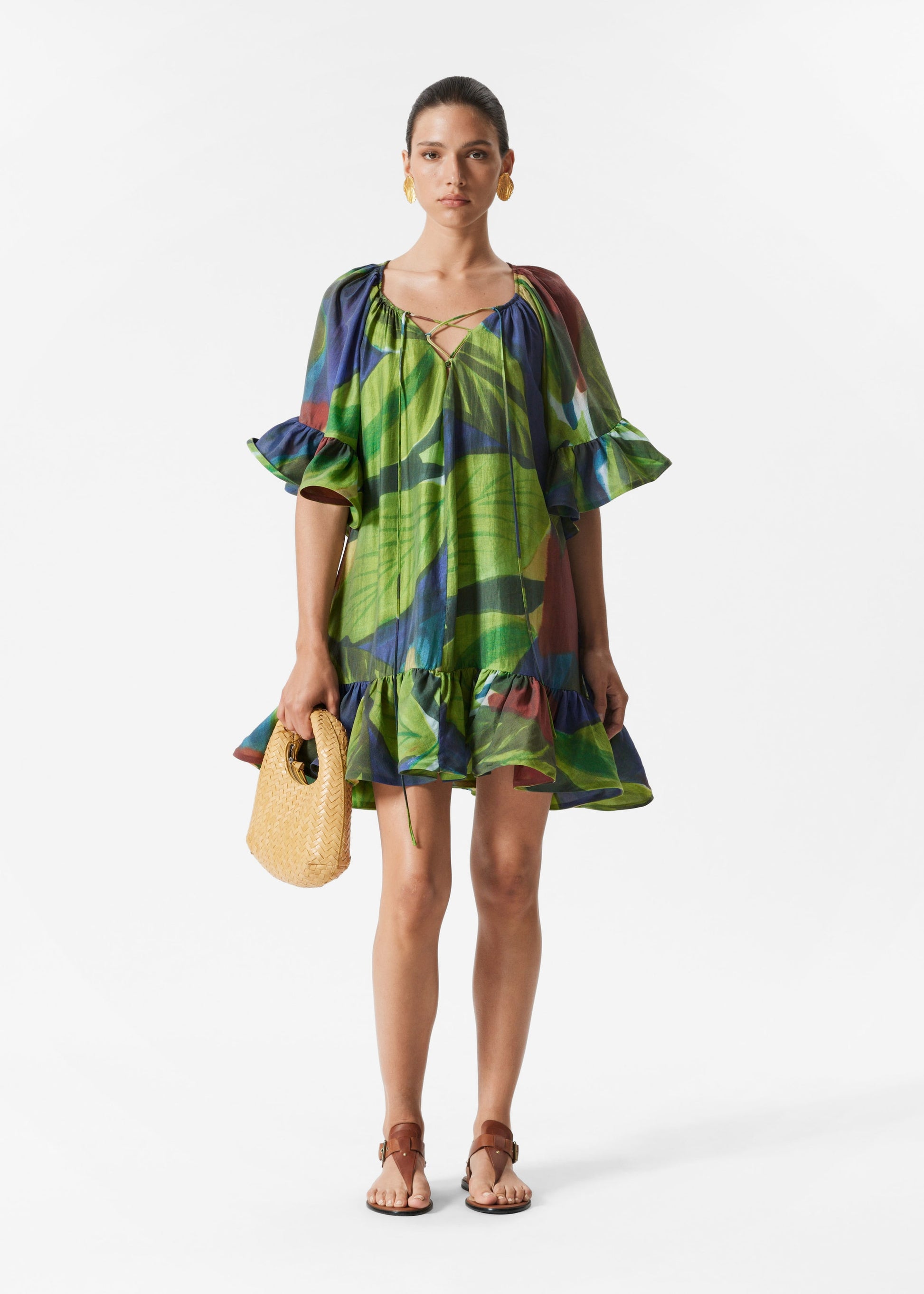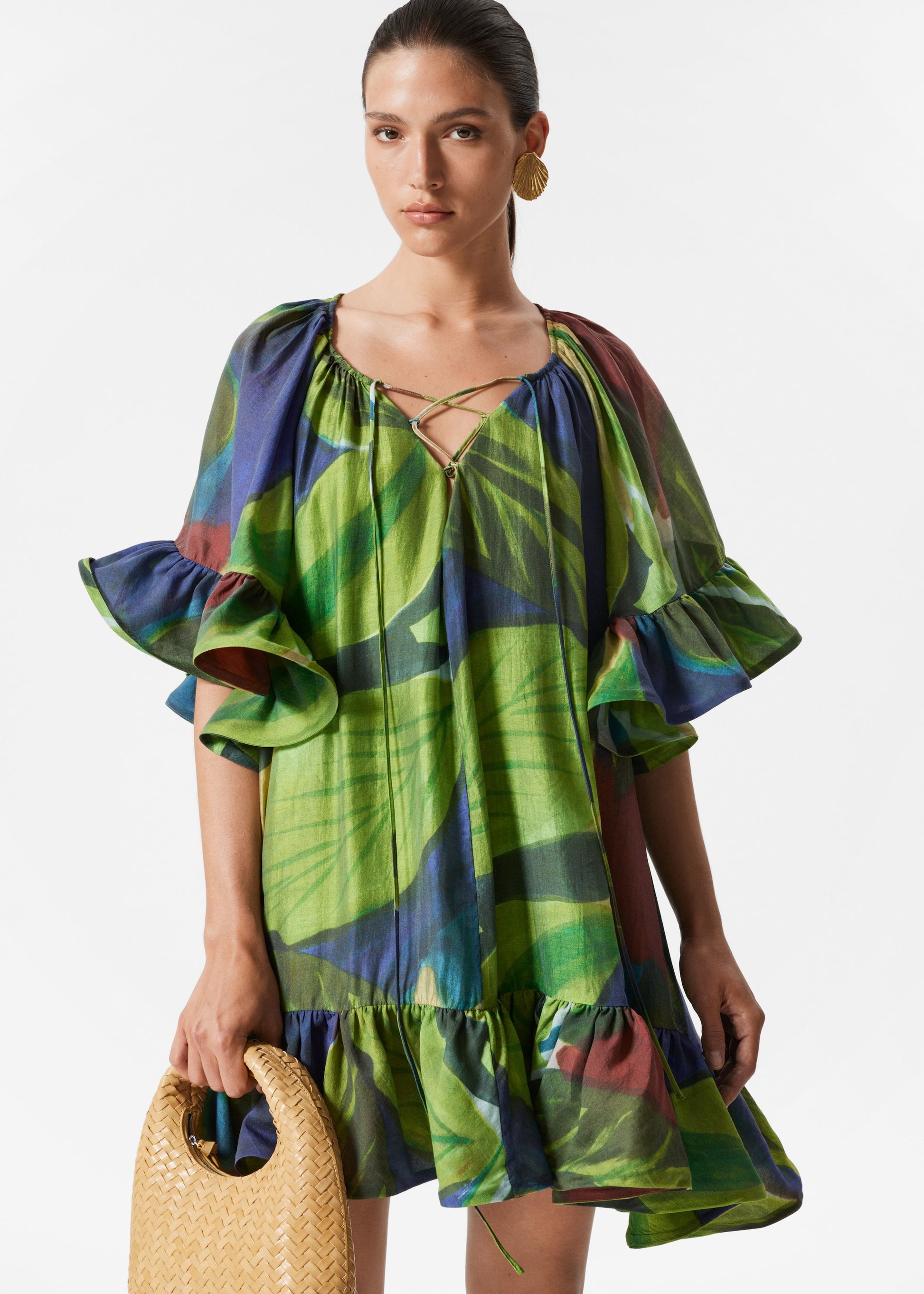 Mini dress cut in a flowy, tunic-inspired silhouette with soft draping and voluminous frills at the sleeves and hem. It features a v-neckline accented by thin lace-up straps for an adjustable fit. Pair with strappy sandals for a romantic, summery look.