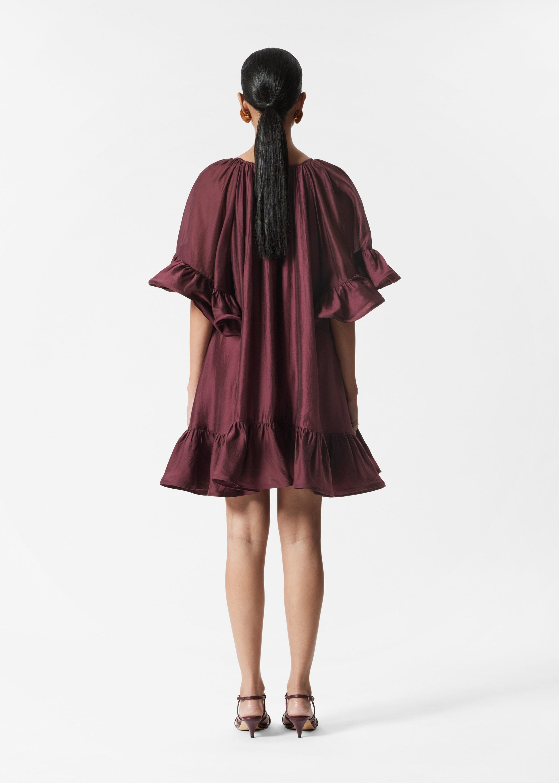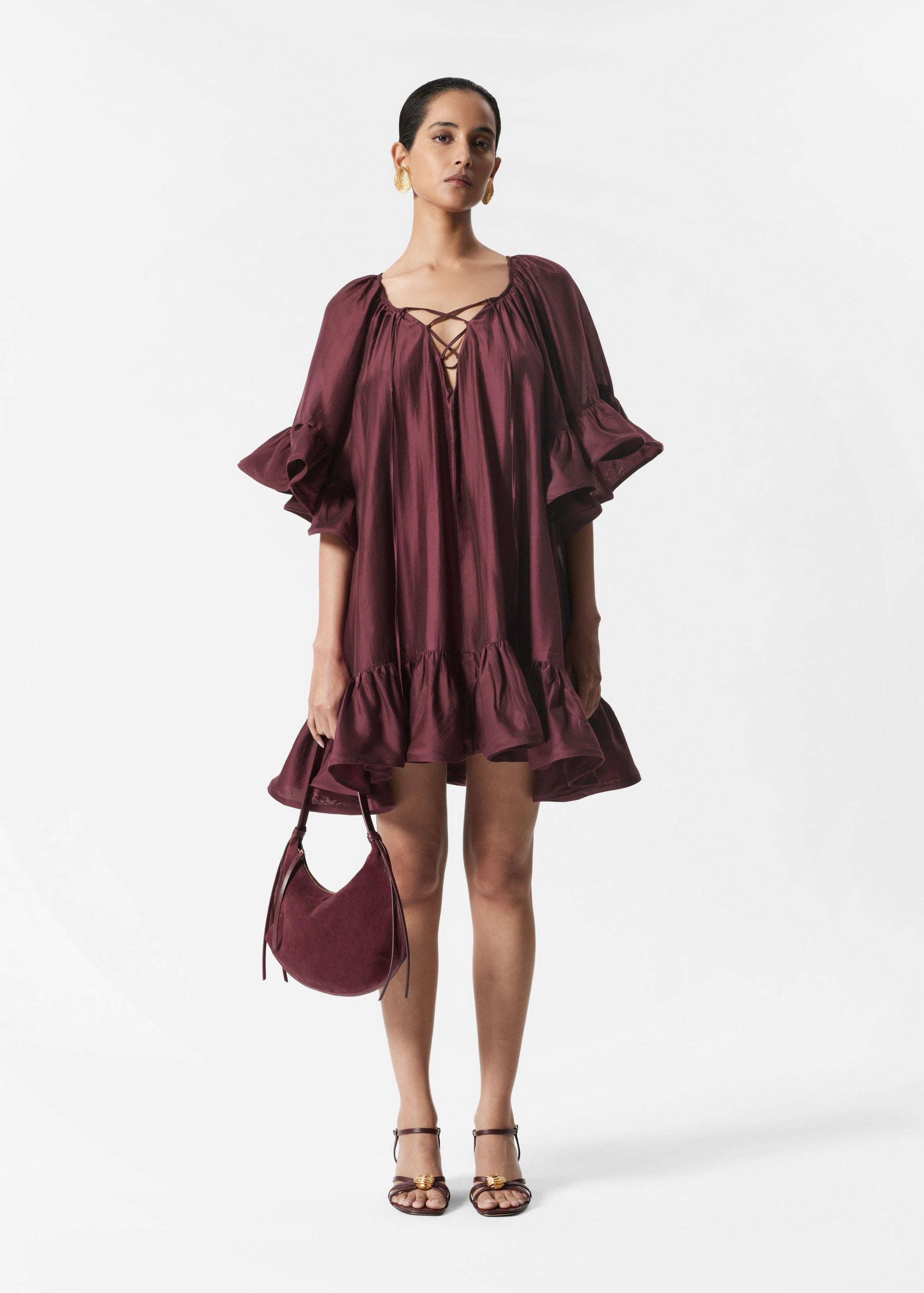 Mini dress cut in a flowy, tunic-inspired silhouette with soft draping and voluminous frills at the sleeves and hem. It features a v-neckline accented by thin lace-up straps for an adjustable fit. Pair with strappy sandals for a romantic, summery look.