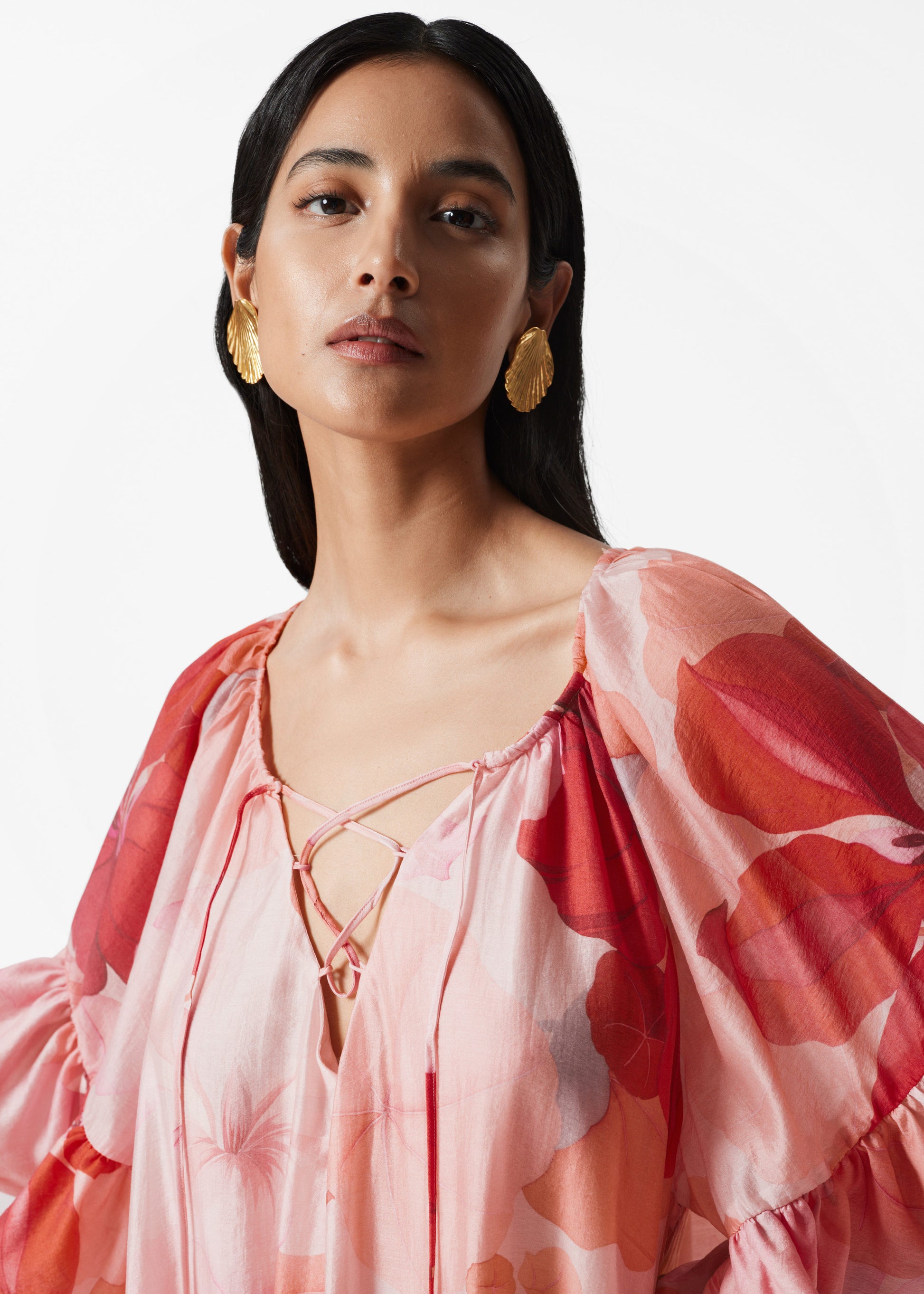 Mini dress cut in a flowy, tunic-inspired silhouette with soft draping and voluminous frills at the sleeves and hem. It features a v-neckline accented by thin lace-up straps for an adjustable fit. Pair with strappy sandals for a romantic, summery look.